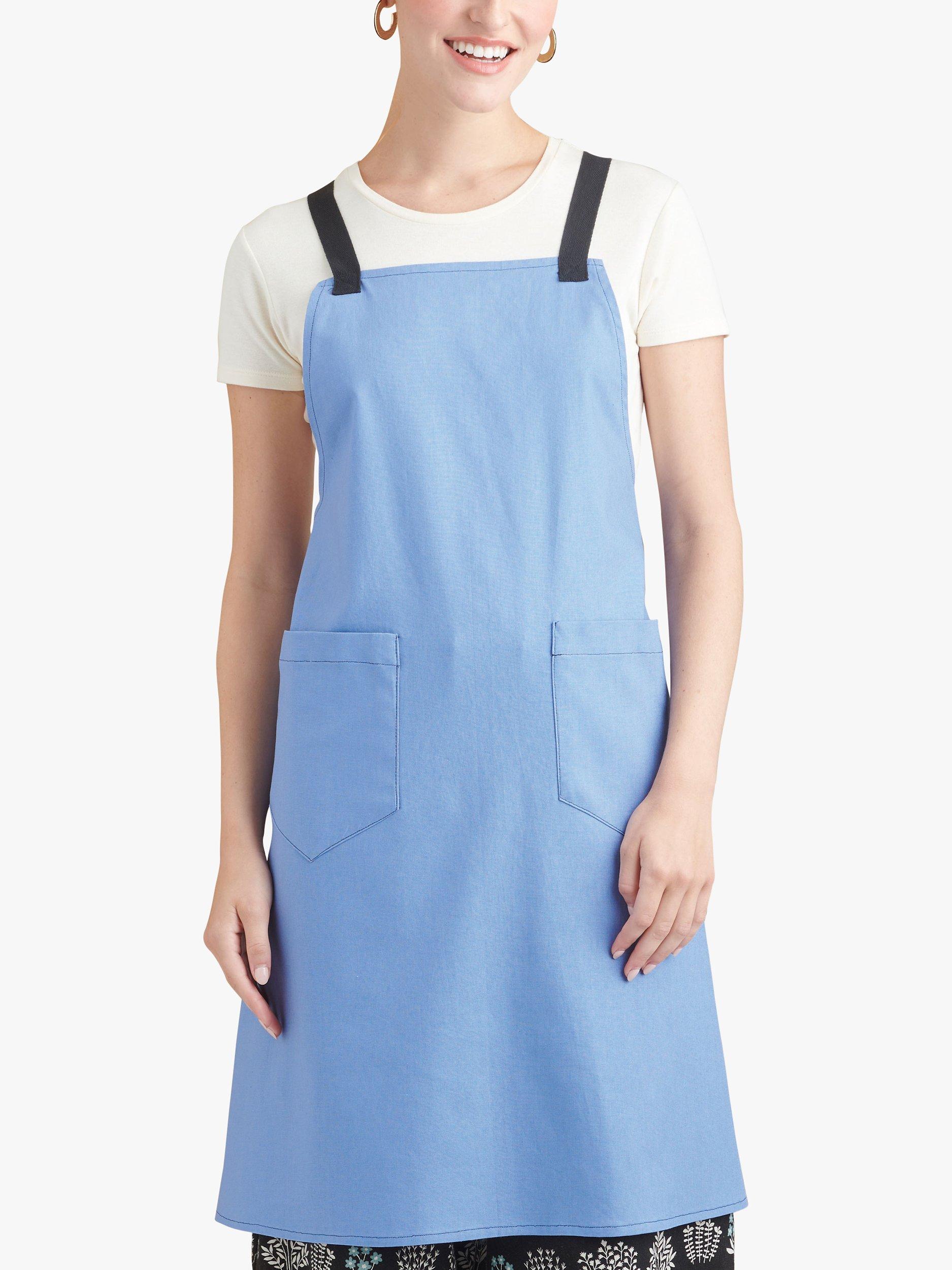 A-line aprons in three lengths have patch pockets. Below knee length apron has twill tape straps threaded through loops, crisscrossing in back and forming back ties. Above knee length and mid-thigh length aprons have neck strap knotted through front buttonhole; closure options include wraparound ties secured in a front bow or shorter ties secured in a back bow.