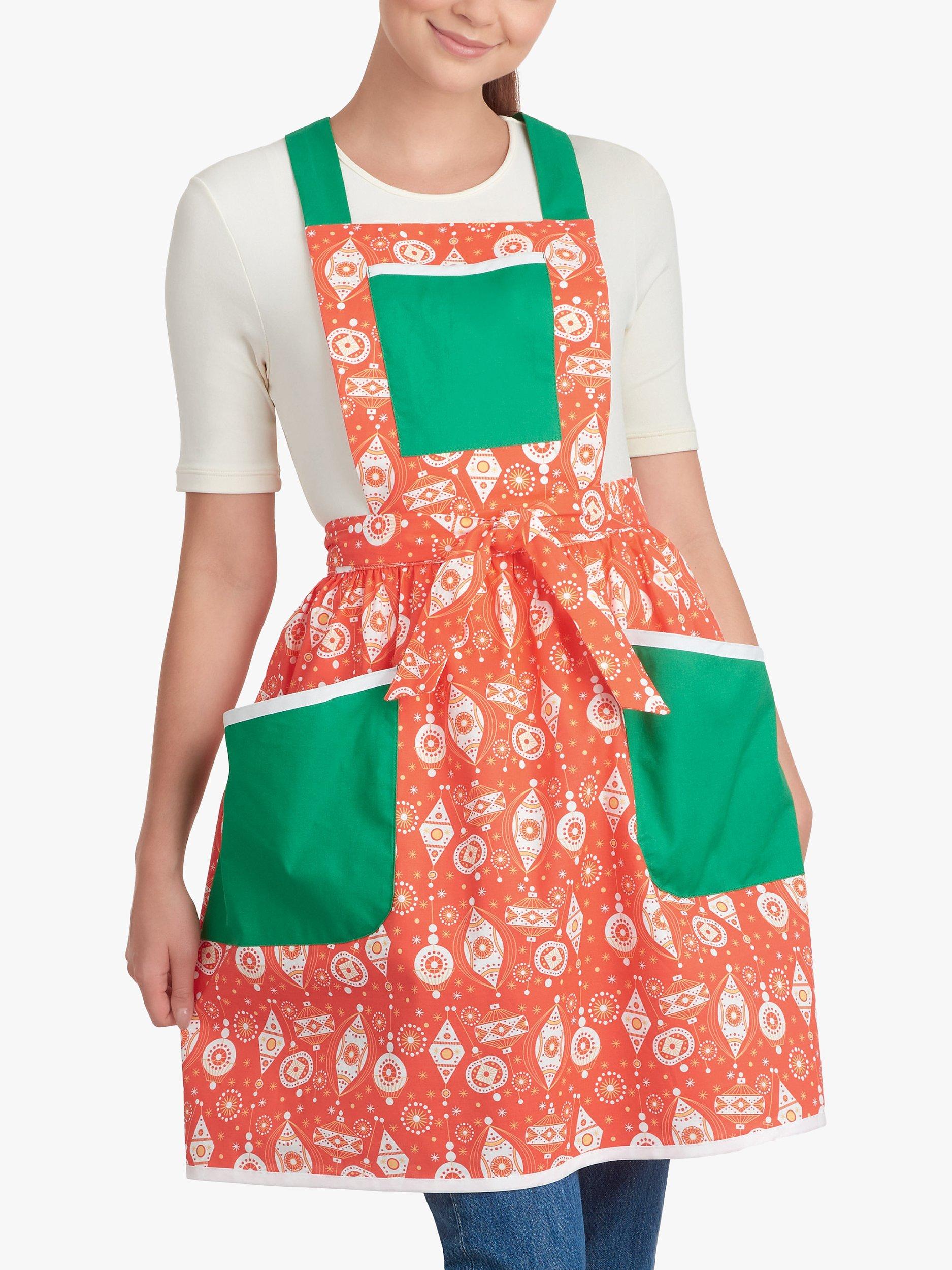 Pretty aprons have overall-style bib, waistband, crisscross shoulder straps and wraparound skirts for full coverage.