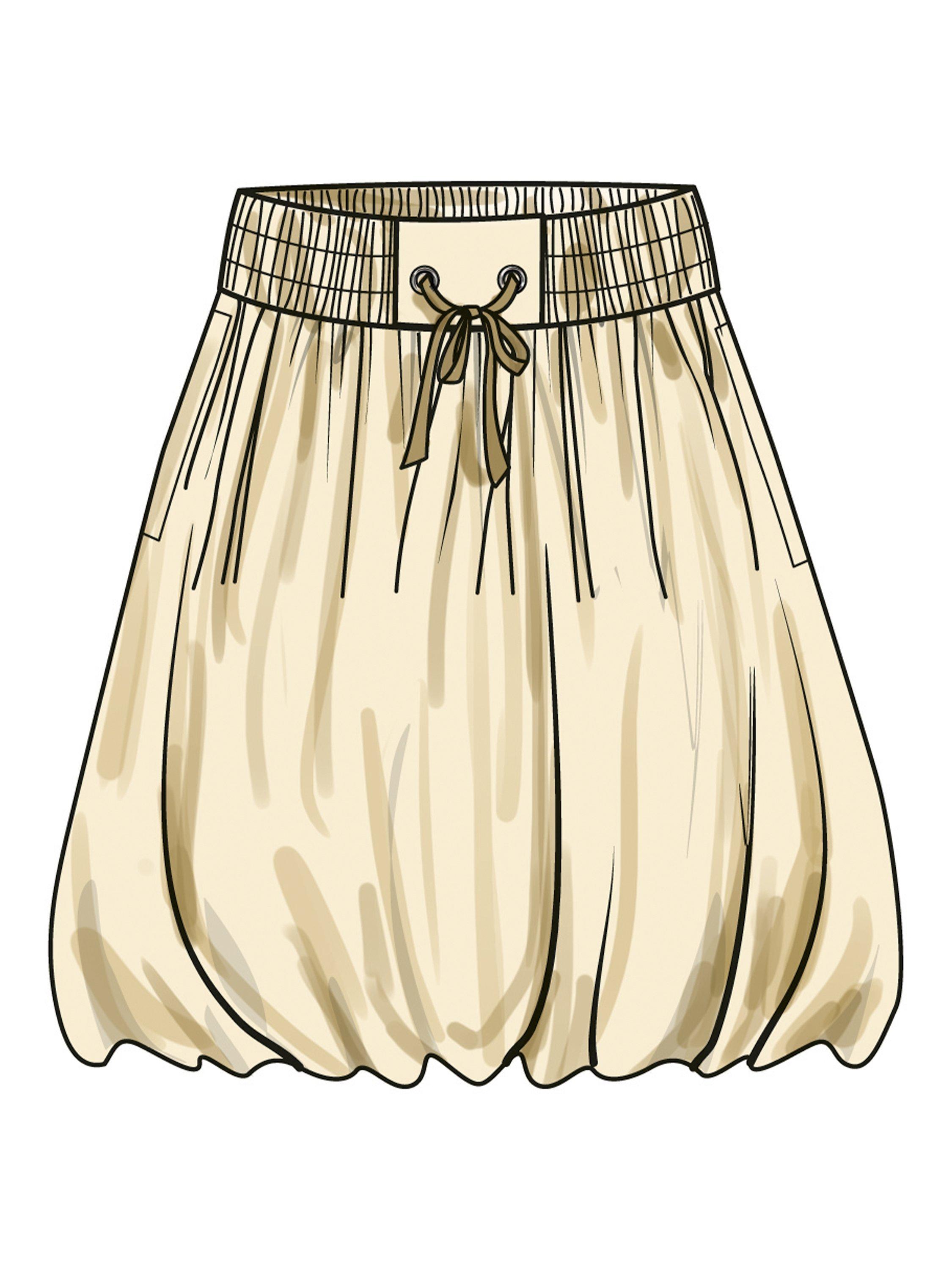 Voluminous utility balloon skirts in three lengths have elastic casing at waistline, adjustable ties, and side seam pockets.