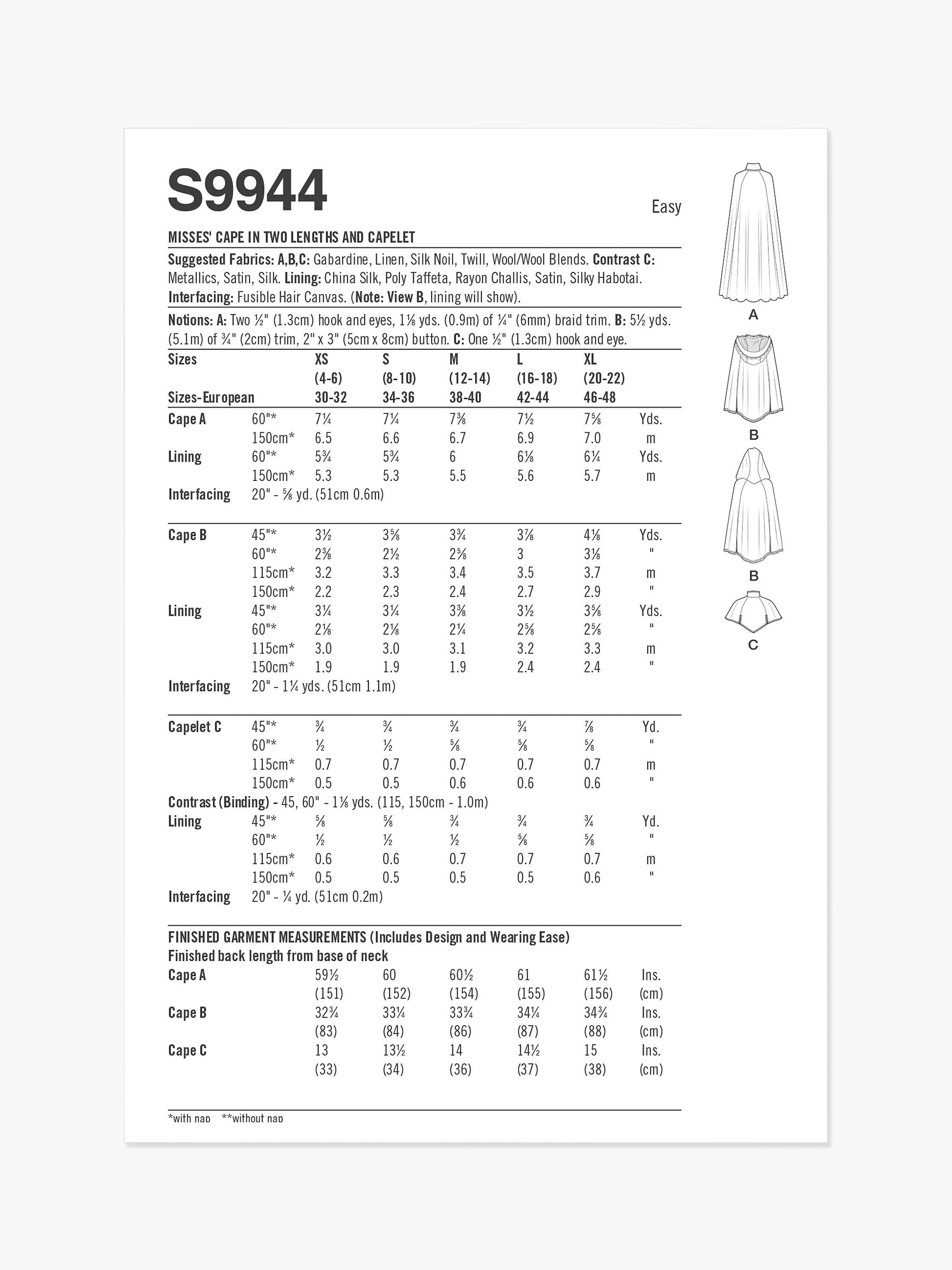 SimplicityMisses' Cape and Capelet Sewing Pattern, S9944