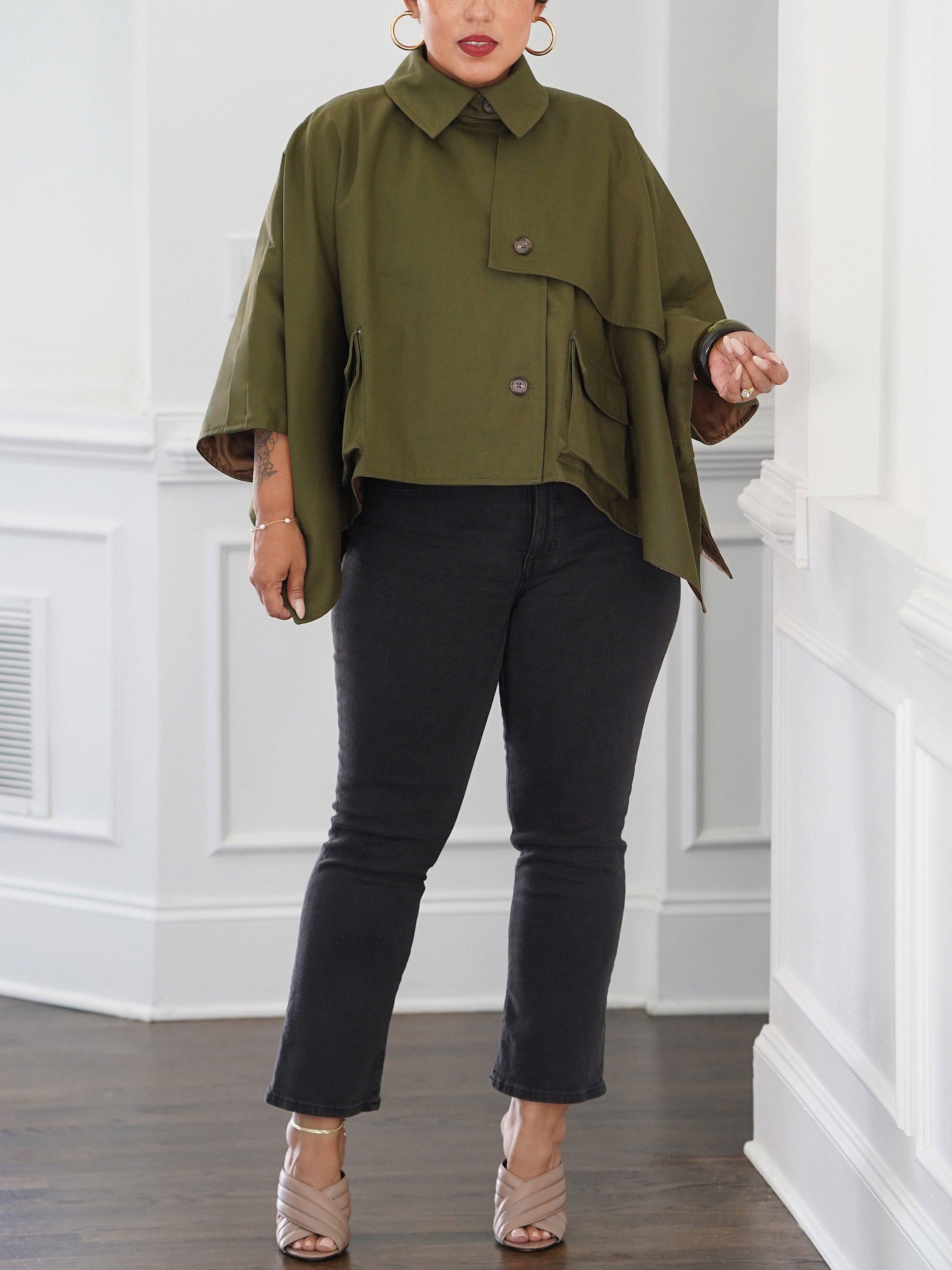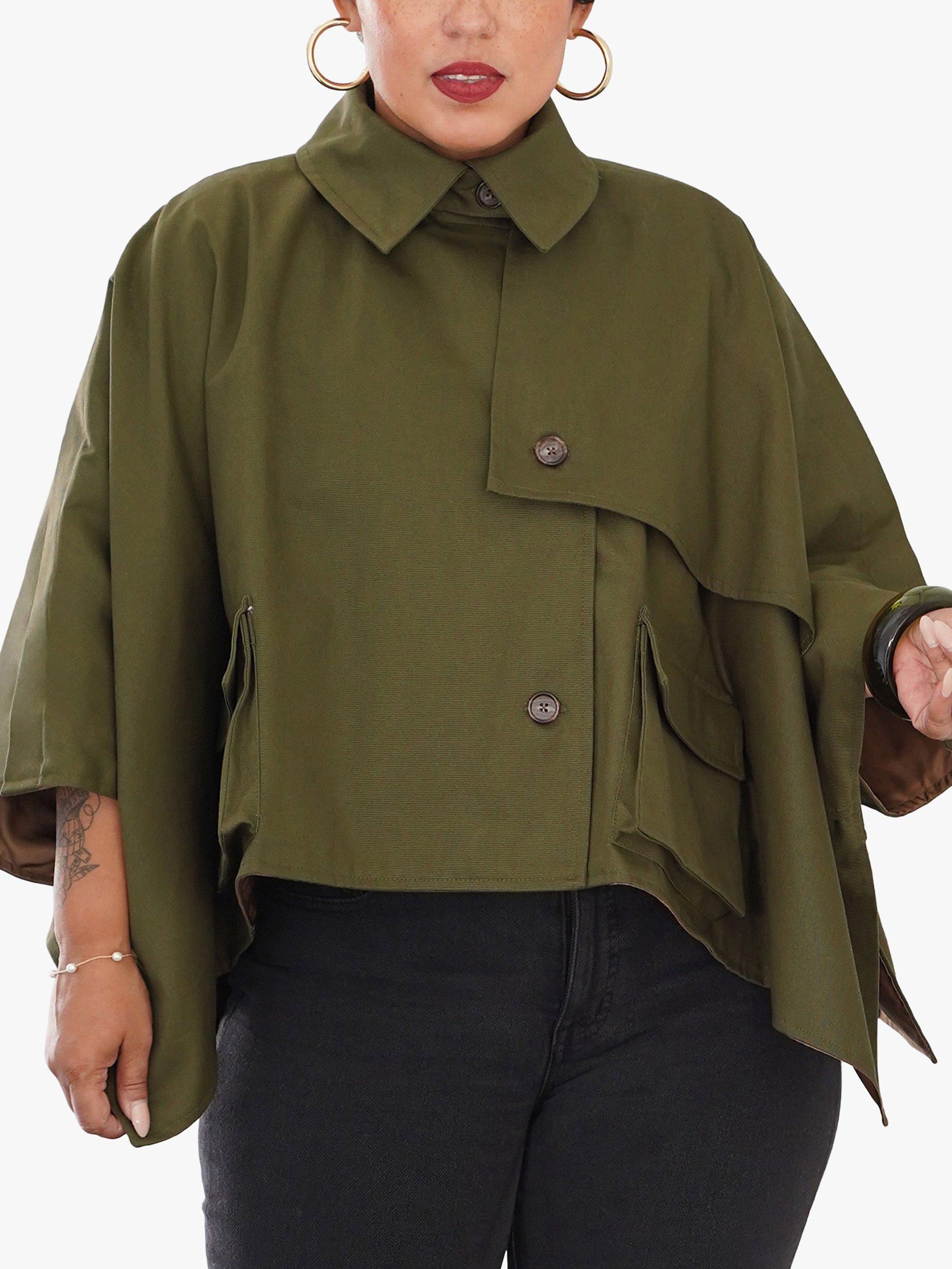 Cropped trench cape with pointed collar includes cargo pockets with inverted pleats and flaps. Cape includes a storm flap, buttons and front button tabs for convertible sleeves.