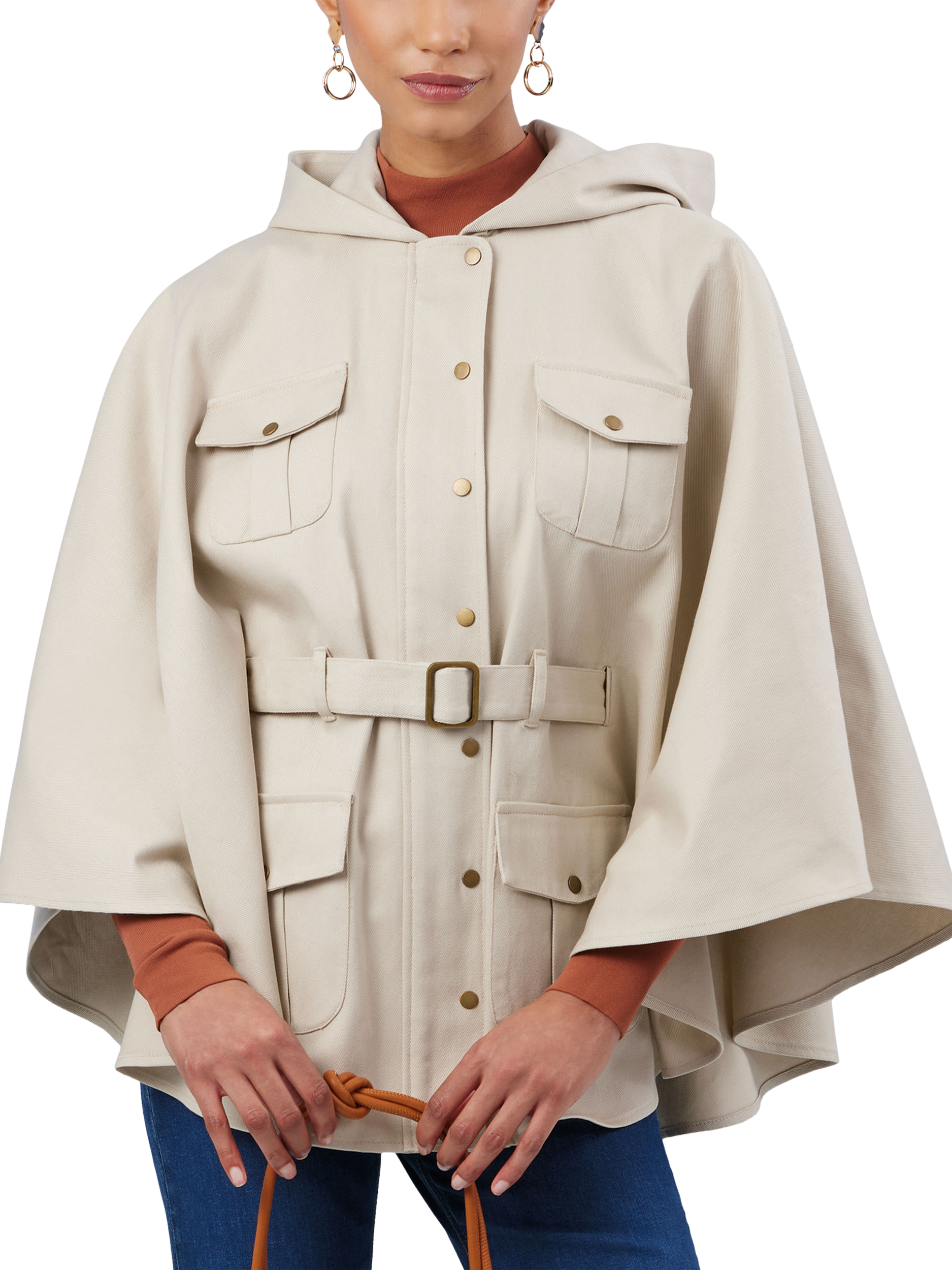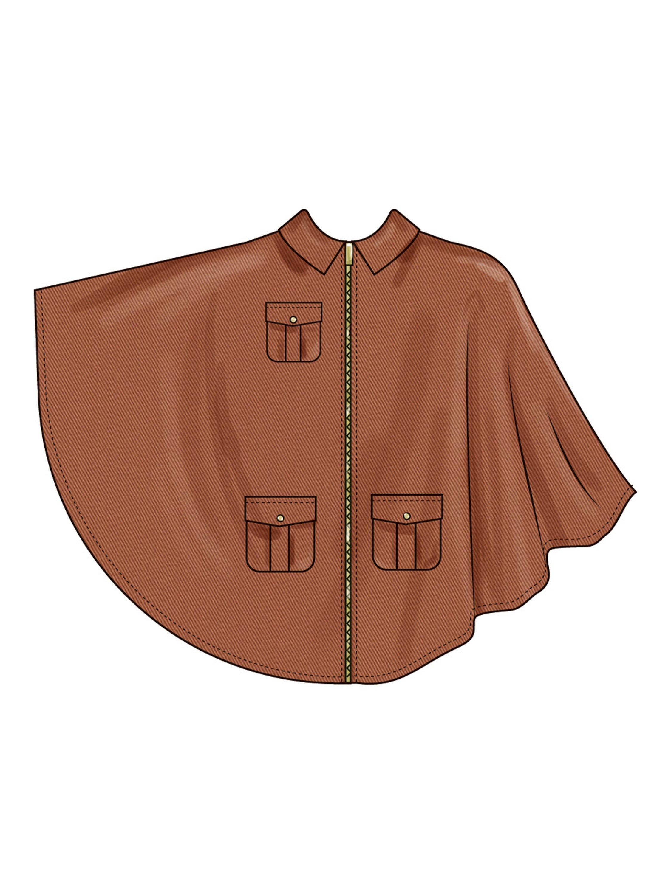 Capes with front zip opening have patch pockets with flaps and snap closures.