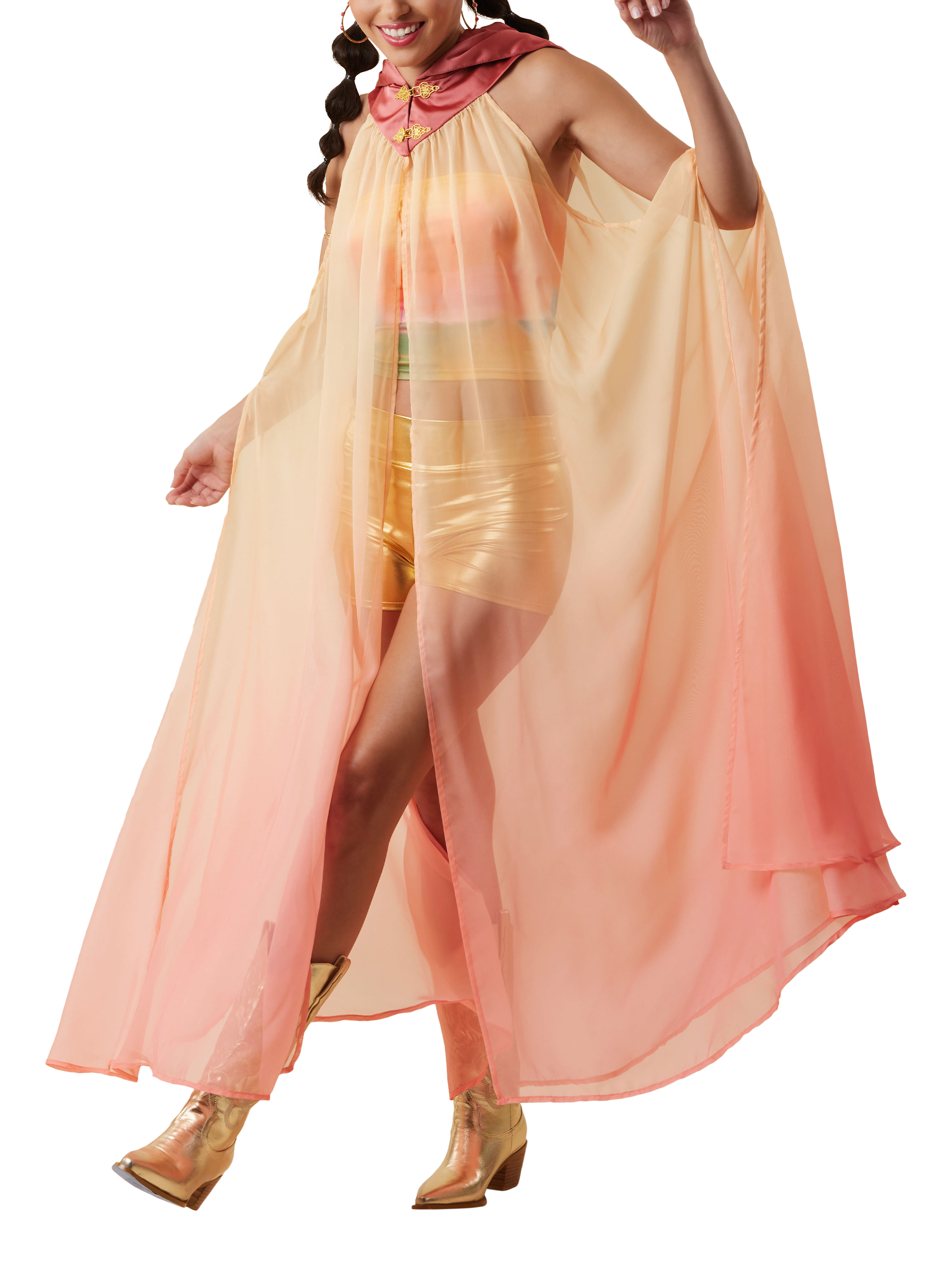 Whisper-light sheer capes with contrast pointed yokes and decorative hook and clasp closures have open shoulders, open sides and can be made with straight or high-low hems.