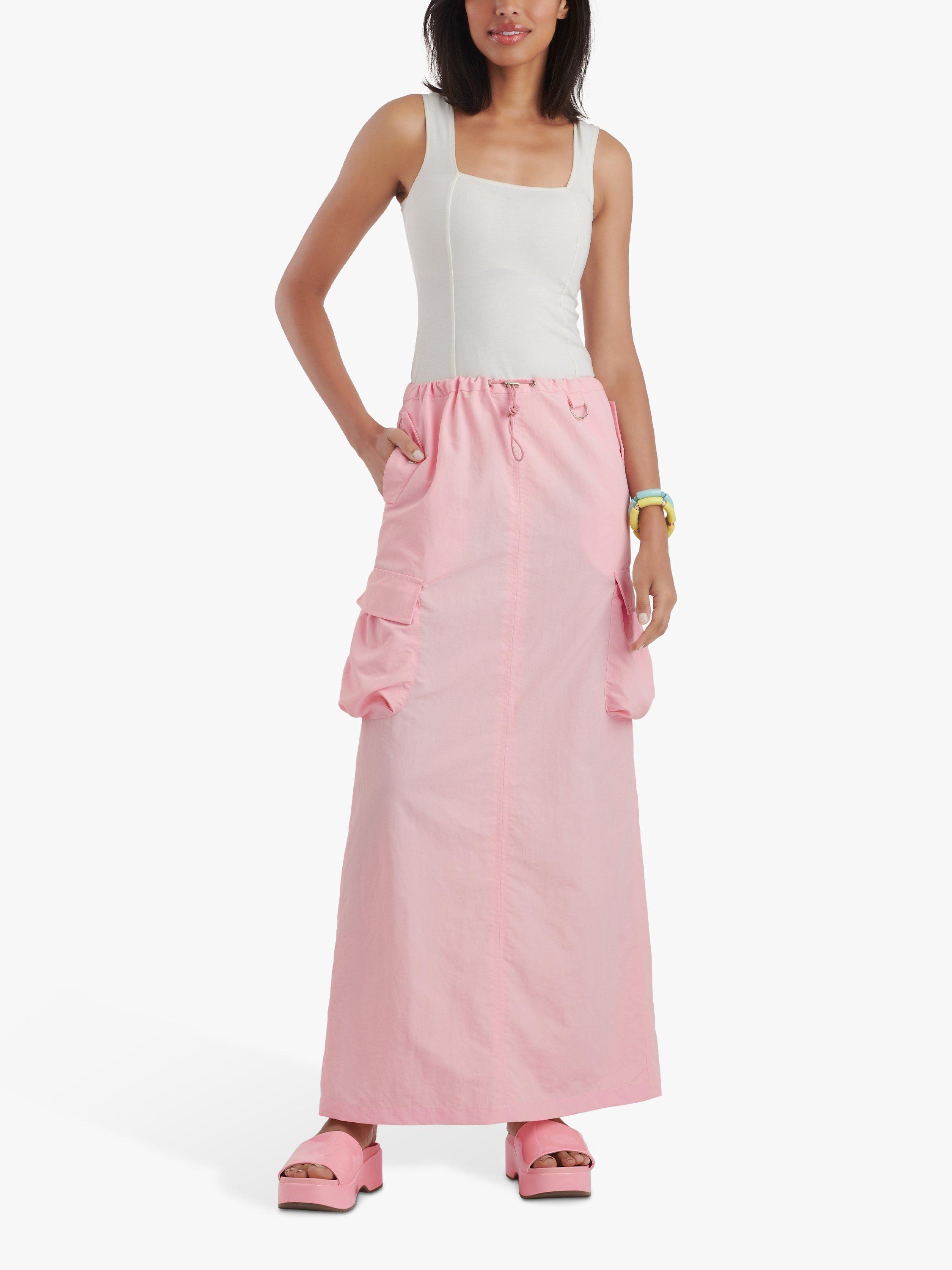 Cargo skirts with drawstring waistbands have side seam pockets with flaps and snap button closures. Skirts B and C have patch pockets and back vents.