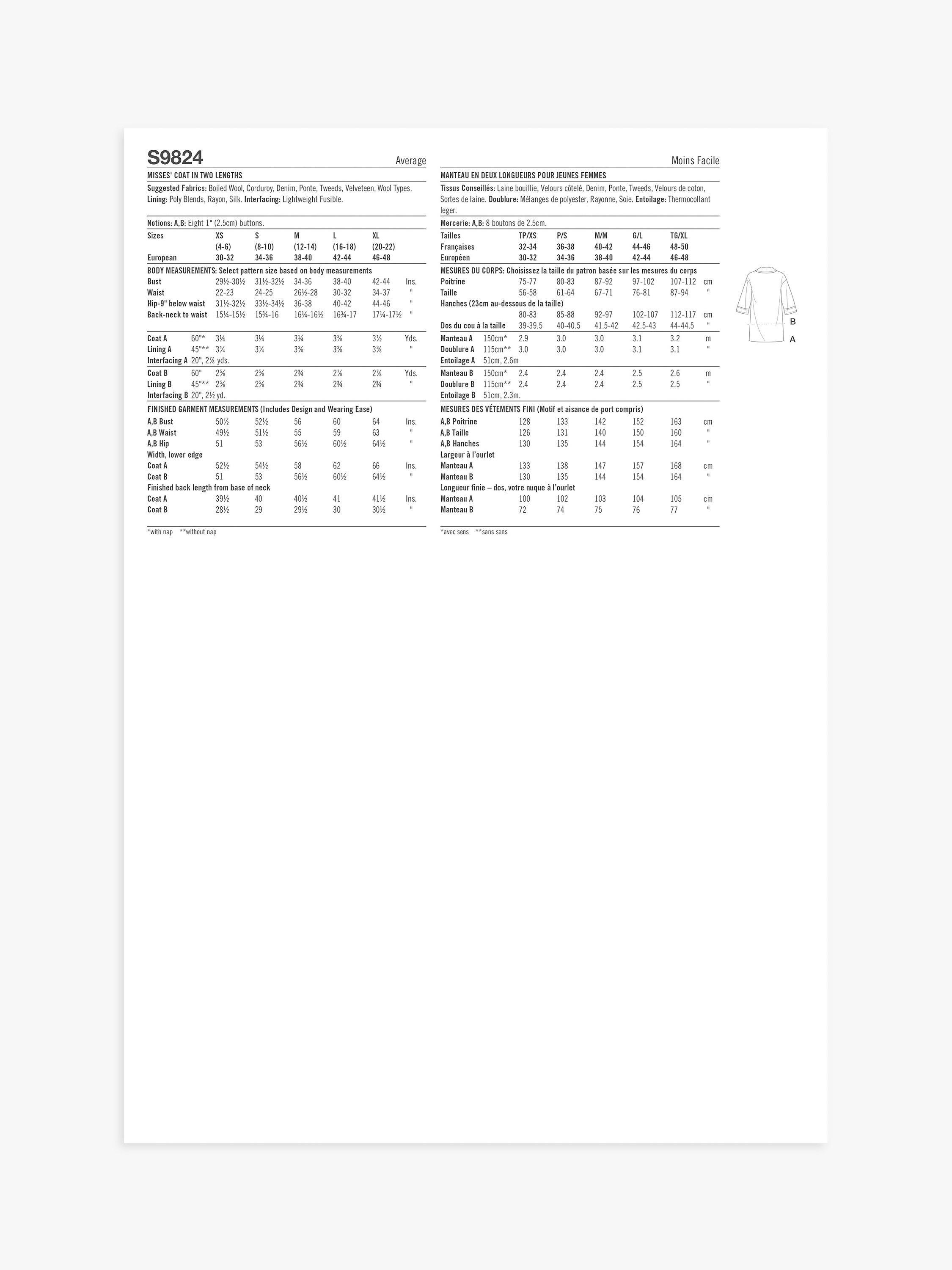 SimplicityMisses' Coat Sewing Pattern, S9824