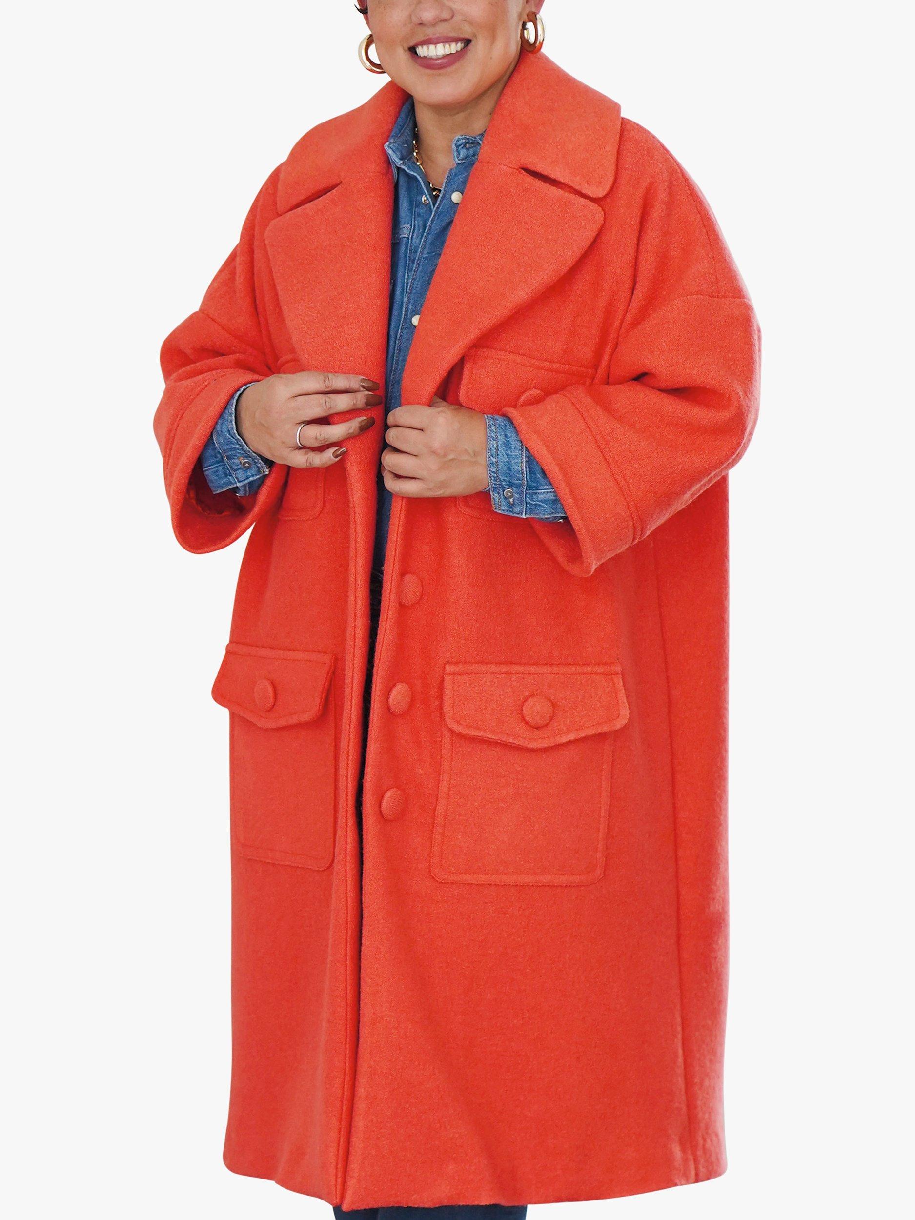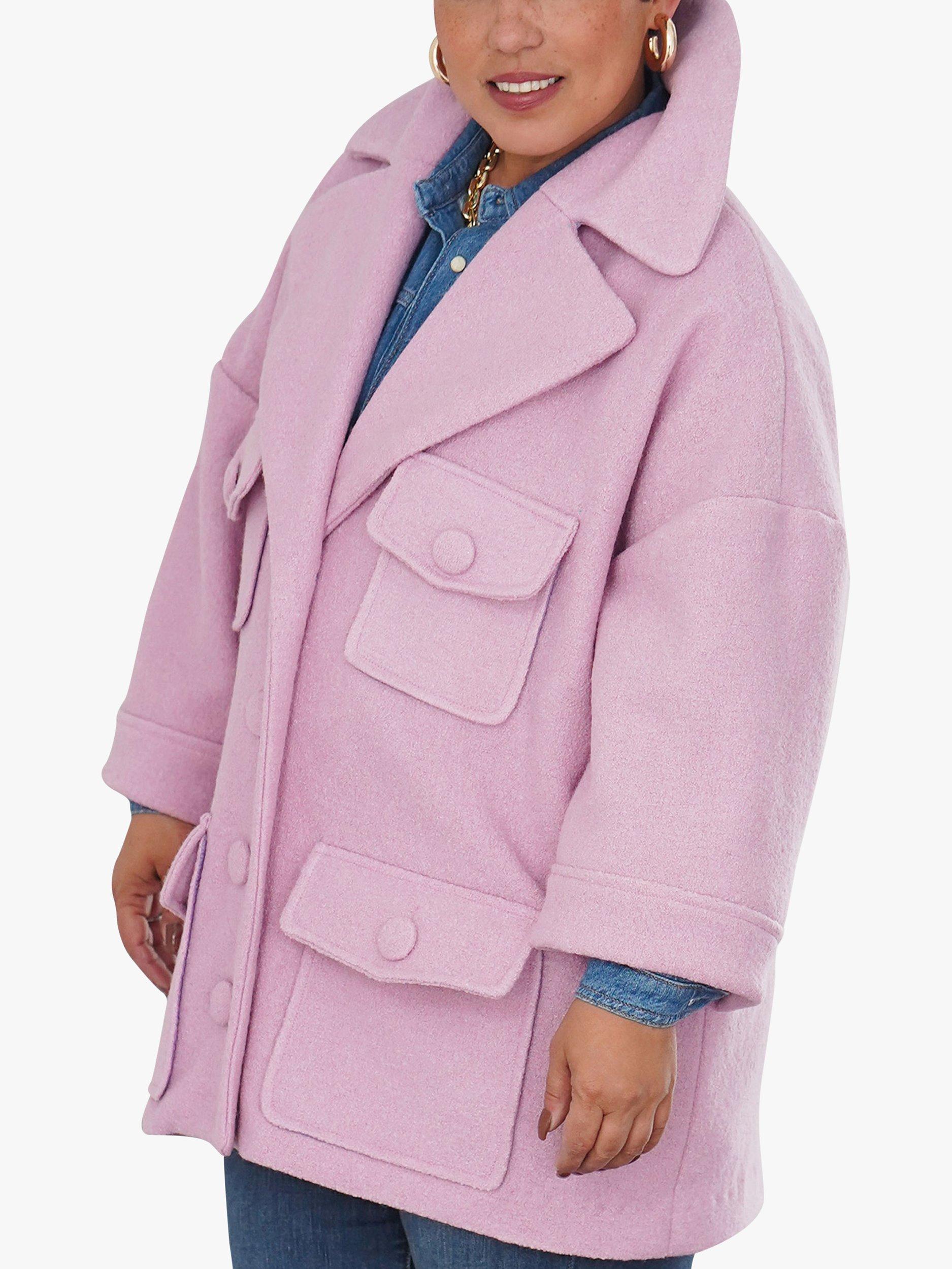 Relaxed, oversized coat in two lengths have dropped shoulders, shaped lapel, 7/8 sleeves with bands at hem, patch pockets with flaps and button closure.