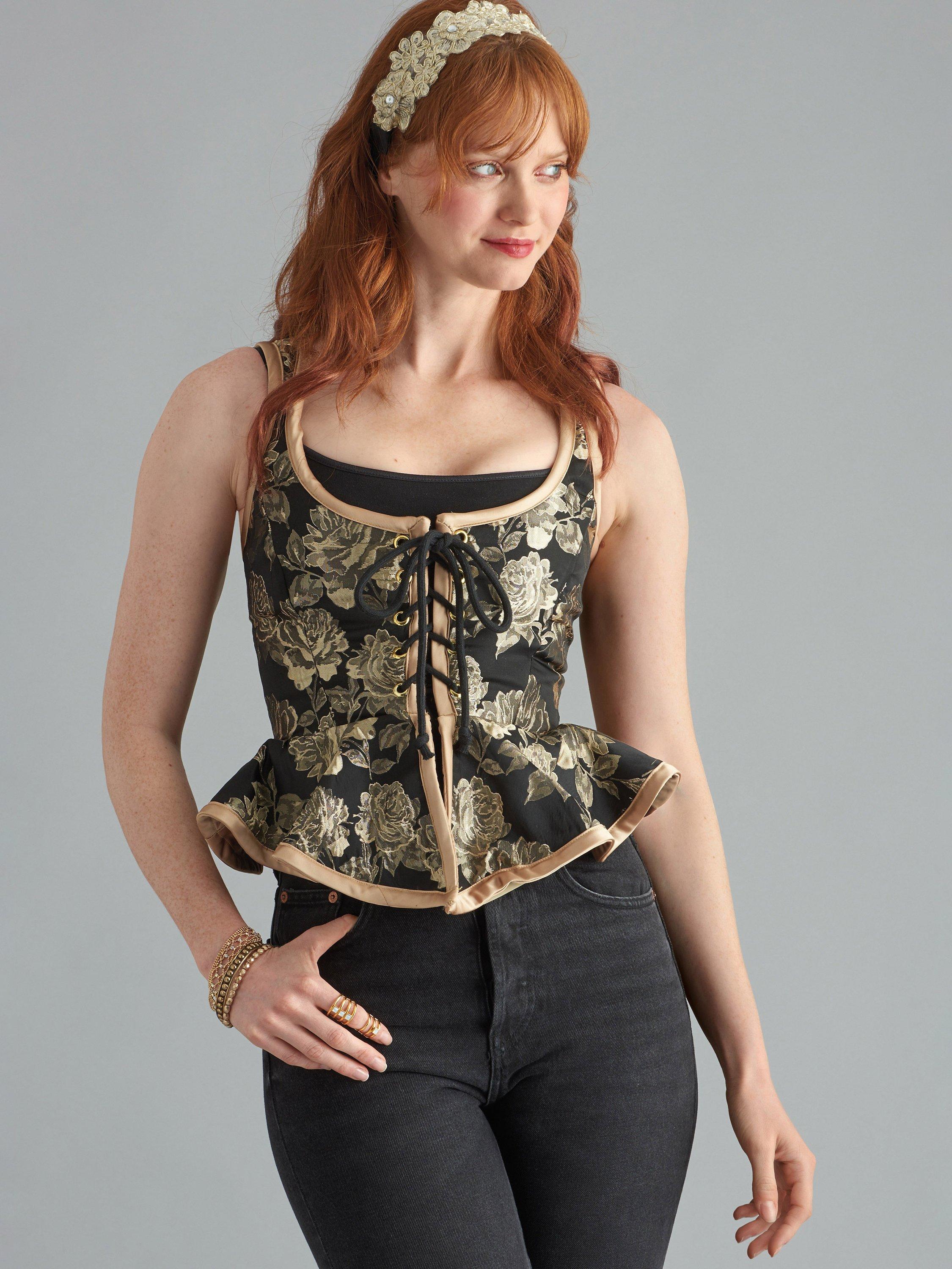 Versatile lined corsets have a smooth structured look without boning. All corsets have rounded square necklines, contrast fabric binding finishing and eyelets with lacing for an adjustable fit.