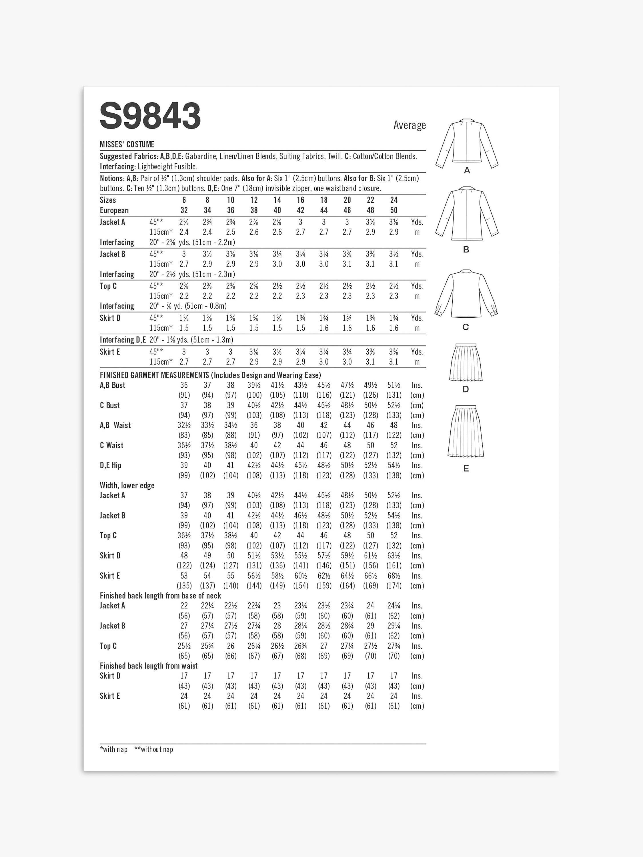 Semi-fitted, unlined double-breasted jacket in two lengths with shoulder pads. View B has pockets. Fitted top has mock front button band, collar and collar band, button cuff long sleeves and narrow hem.