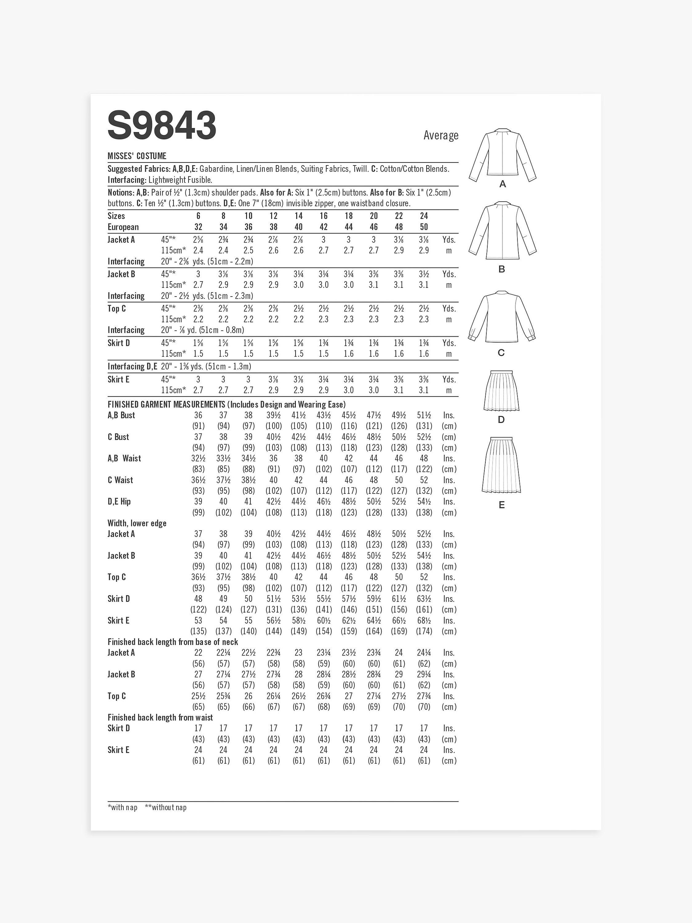 Semi-fitted, unlined double-breasted jacket in two lengths with shoulder pads. View B has pockets. Fitted top has mock front button band, collar and collar band, button cuff long sleeves and narrow hem.