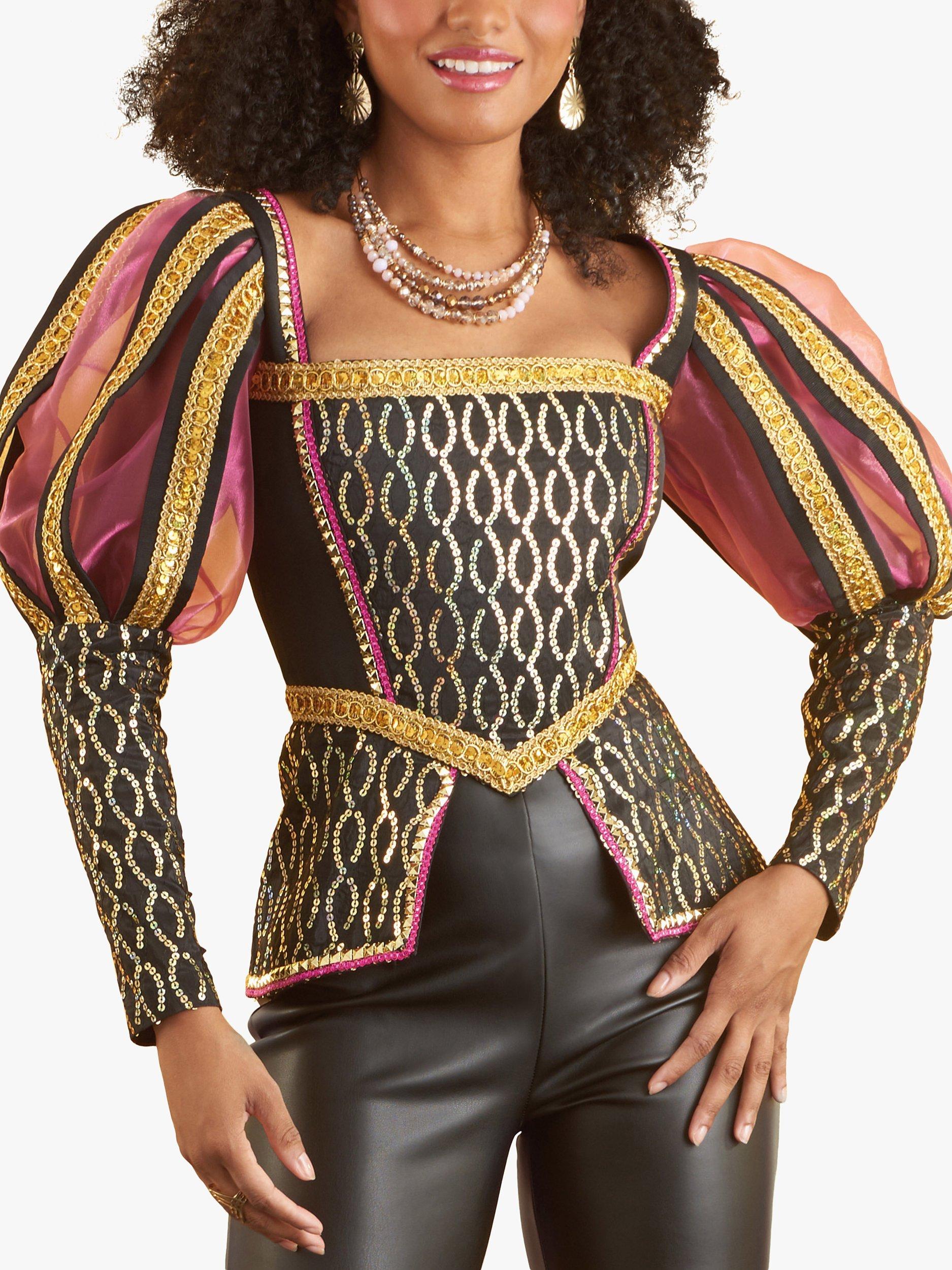 Historically-inspired lined tops have back zip. Cropped tops have jewel neck with or without stand collars, flange or puffed sleeves and trim and contrast overlay options.