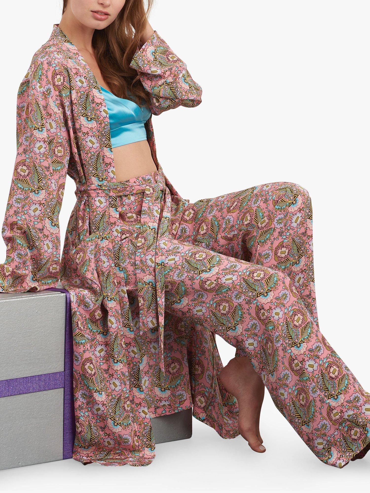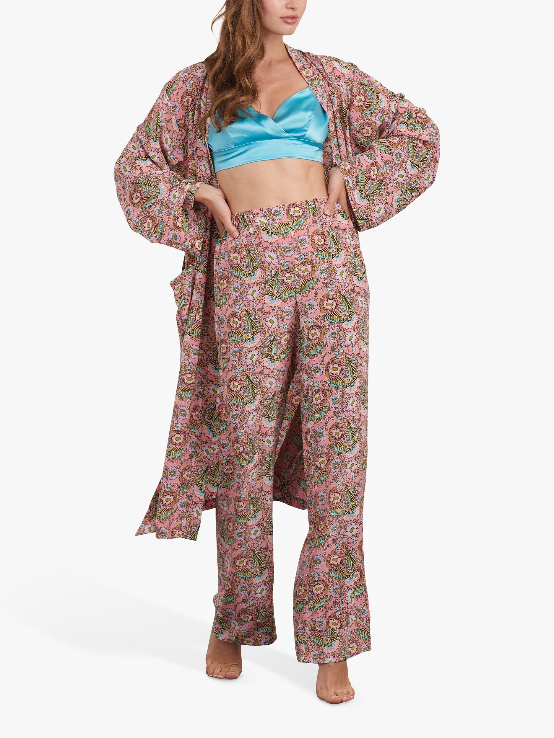 Pattern includes a robe in two lengths with optional tie and pocket, pull-on wide-legged pants, cross-over top, and bralette.