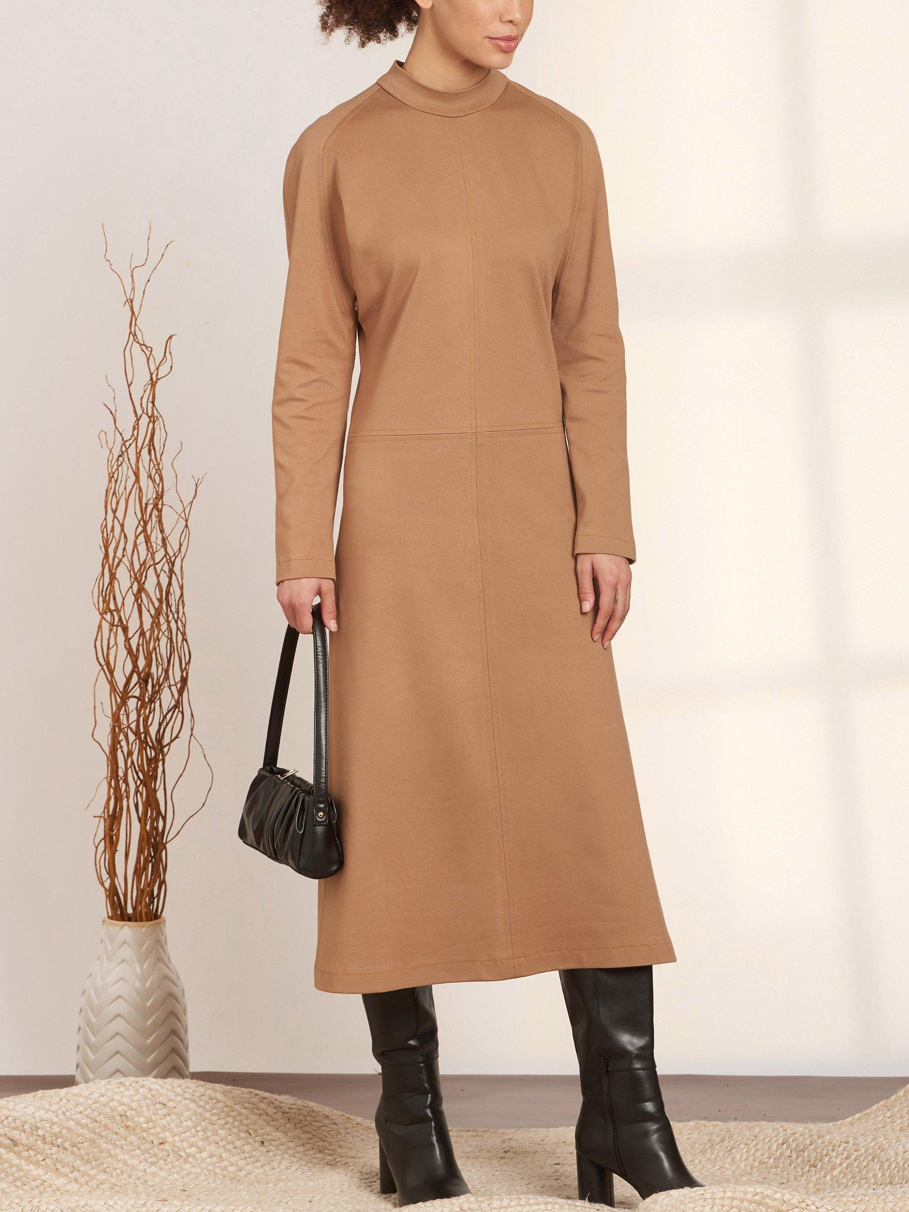 Dresses with long sleeves and length variations. View A has full, shaped sleeves with darts at sleeve hems. Views B and C are A-line with tapered sleeves and neck bands.