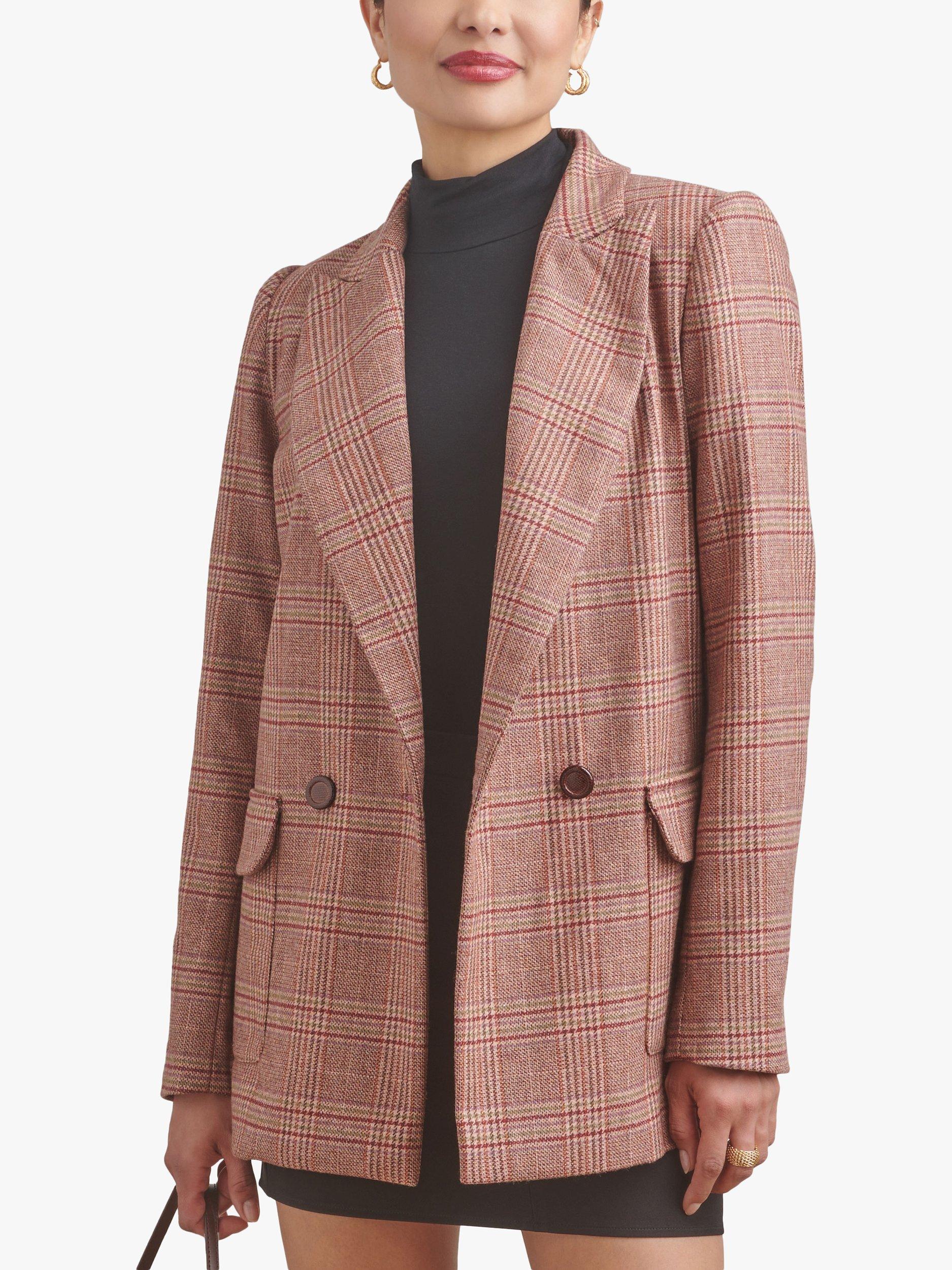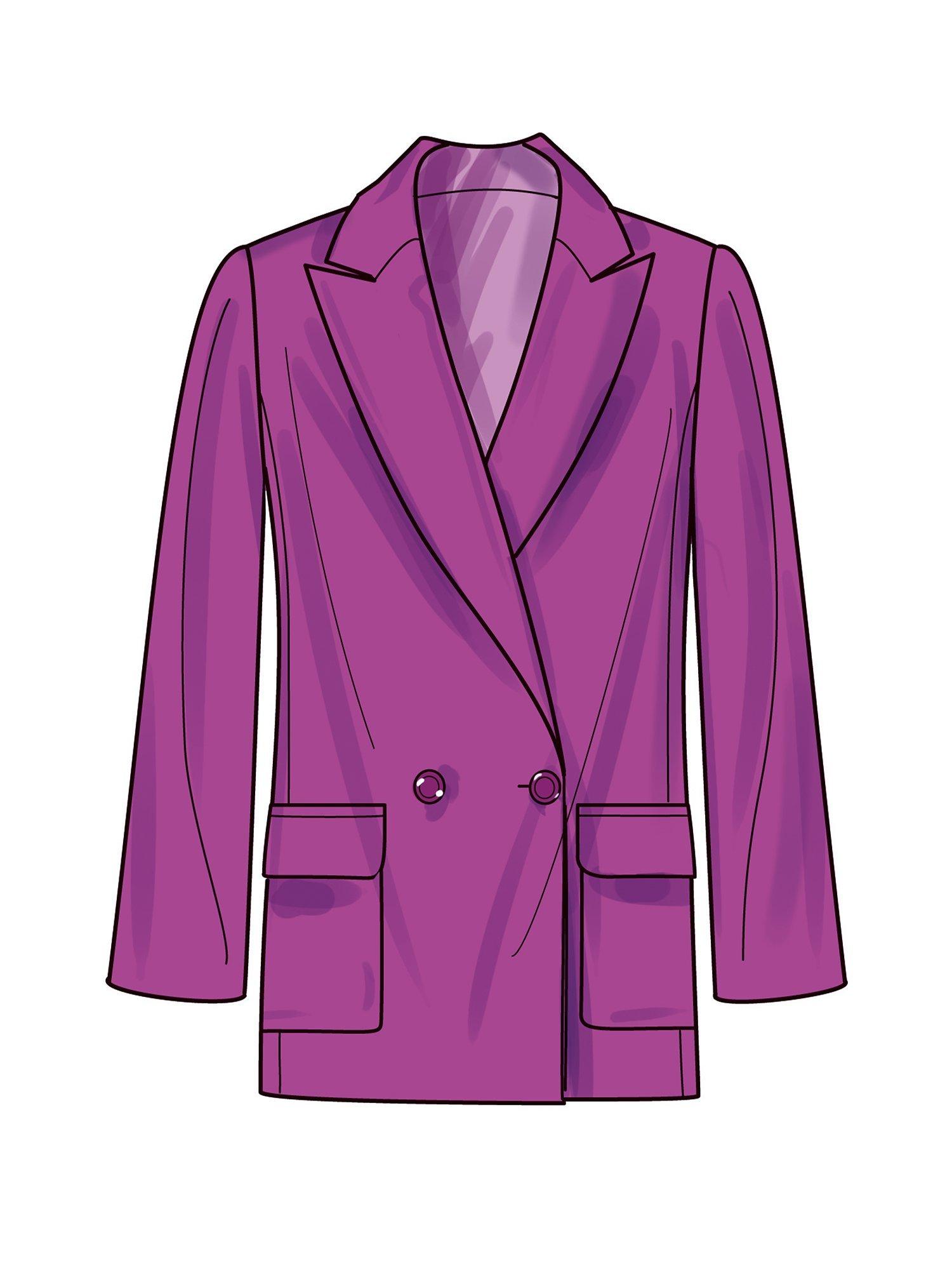 Double breasted lined jacket with shoulder pads and optional contrast lapel or front patch pockets with flaps.