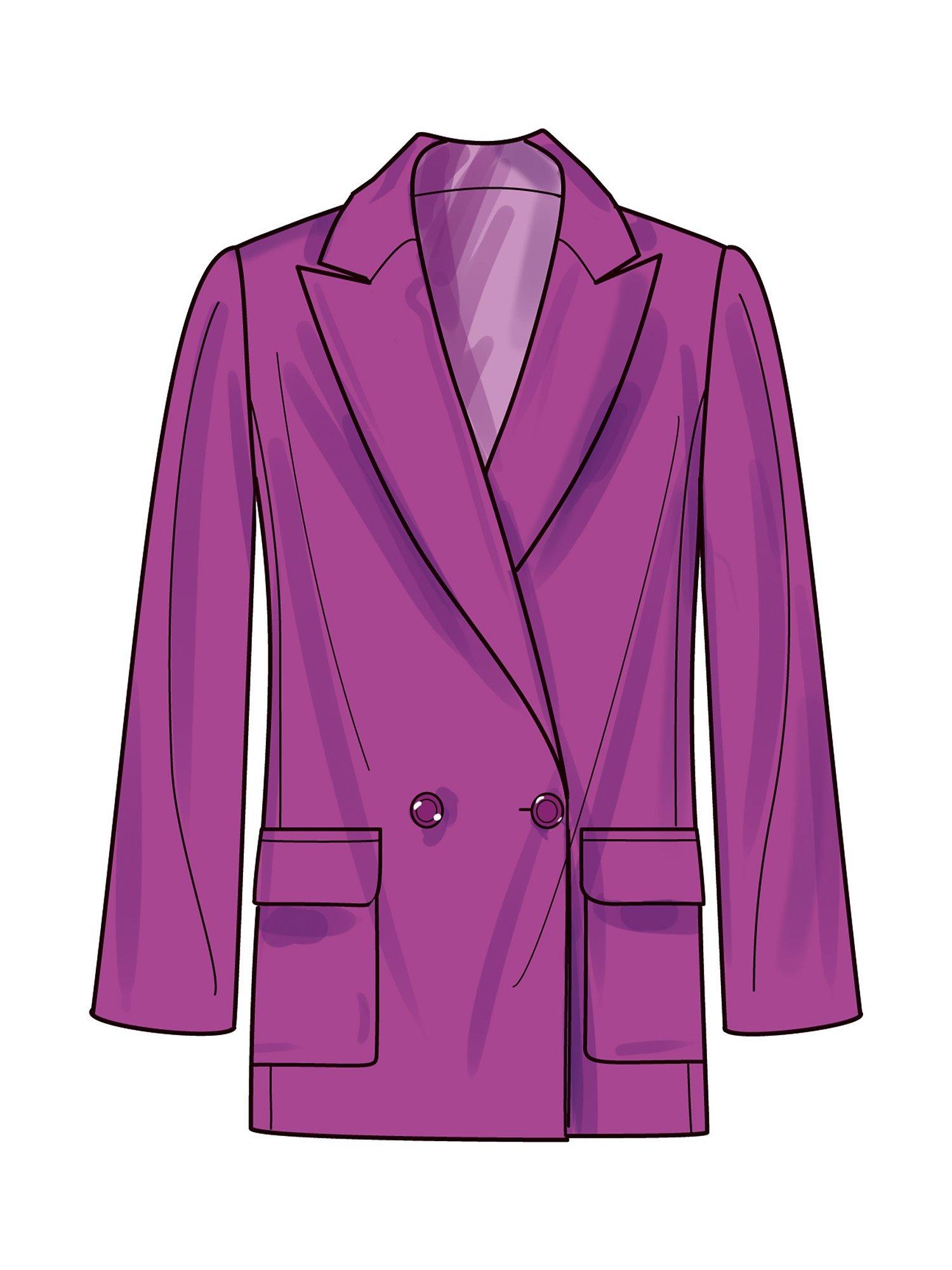 Double breasted lined jacket with shoulder pads and optional contrast lapel or front patch pockets with flaps.