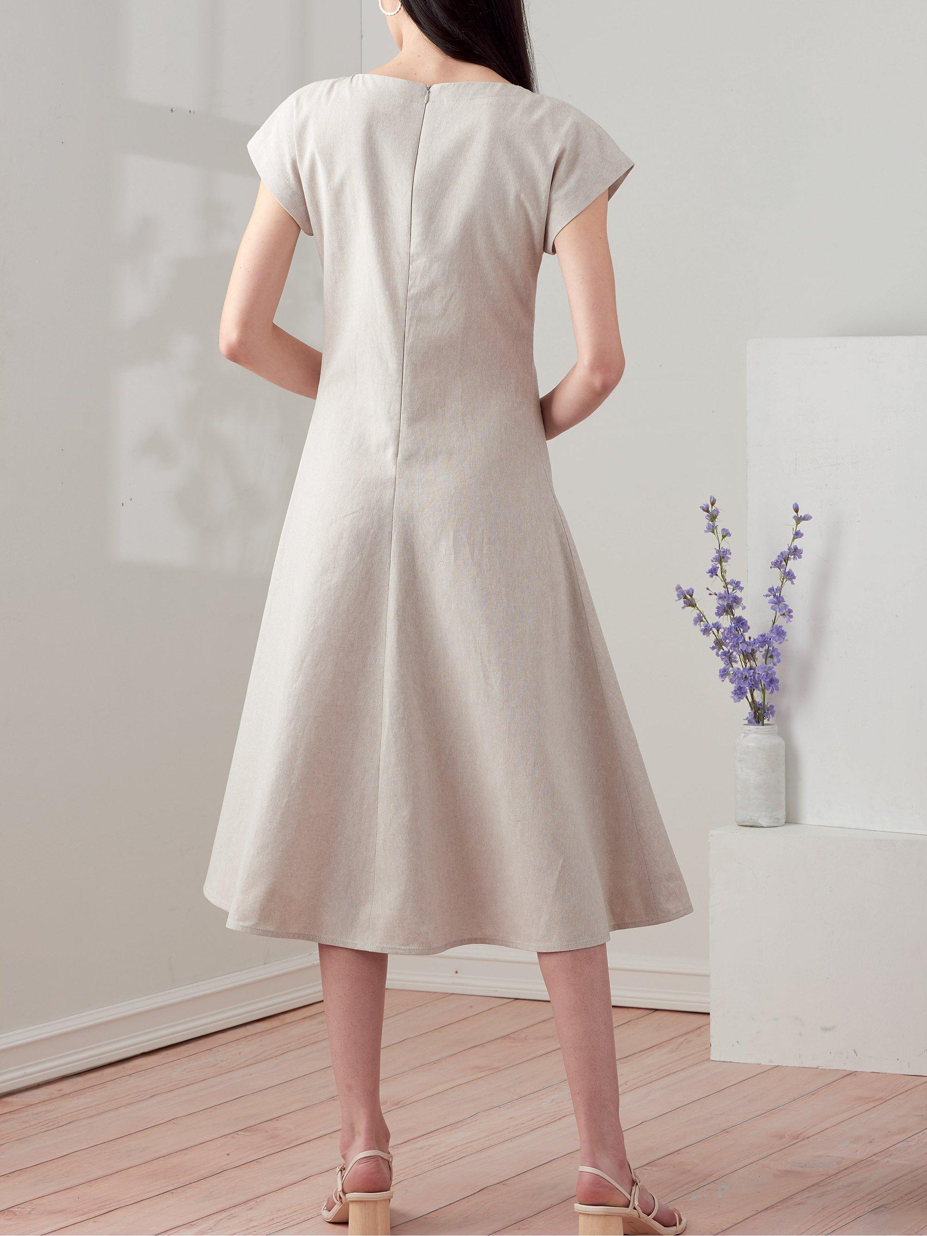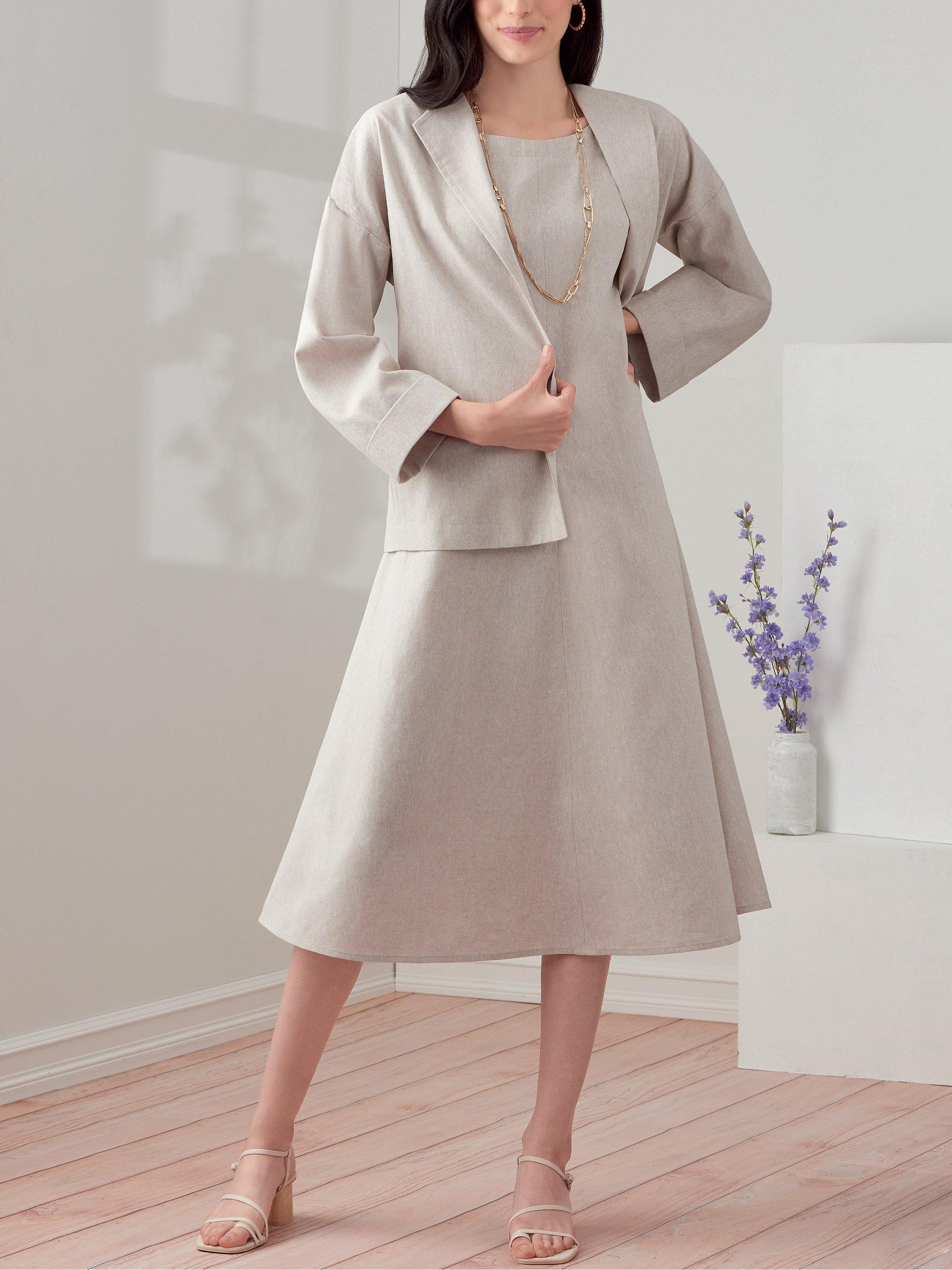 Dress and top with rounded neckline and dropped sleeves; relaxed hip-length jacket with side seam pockets.