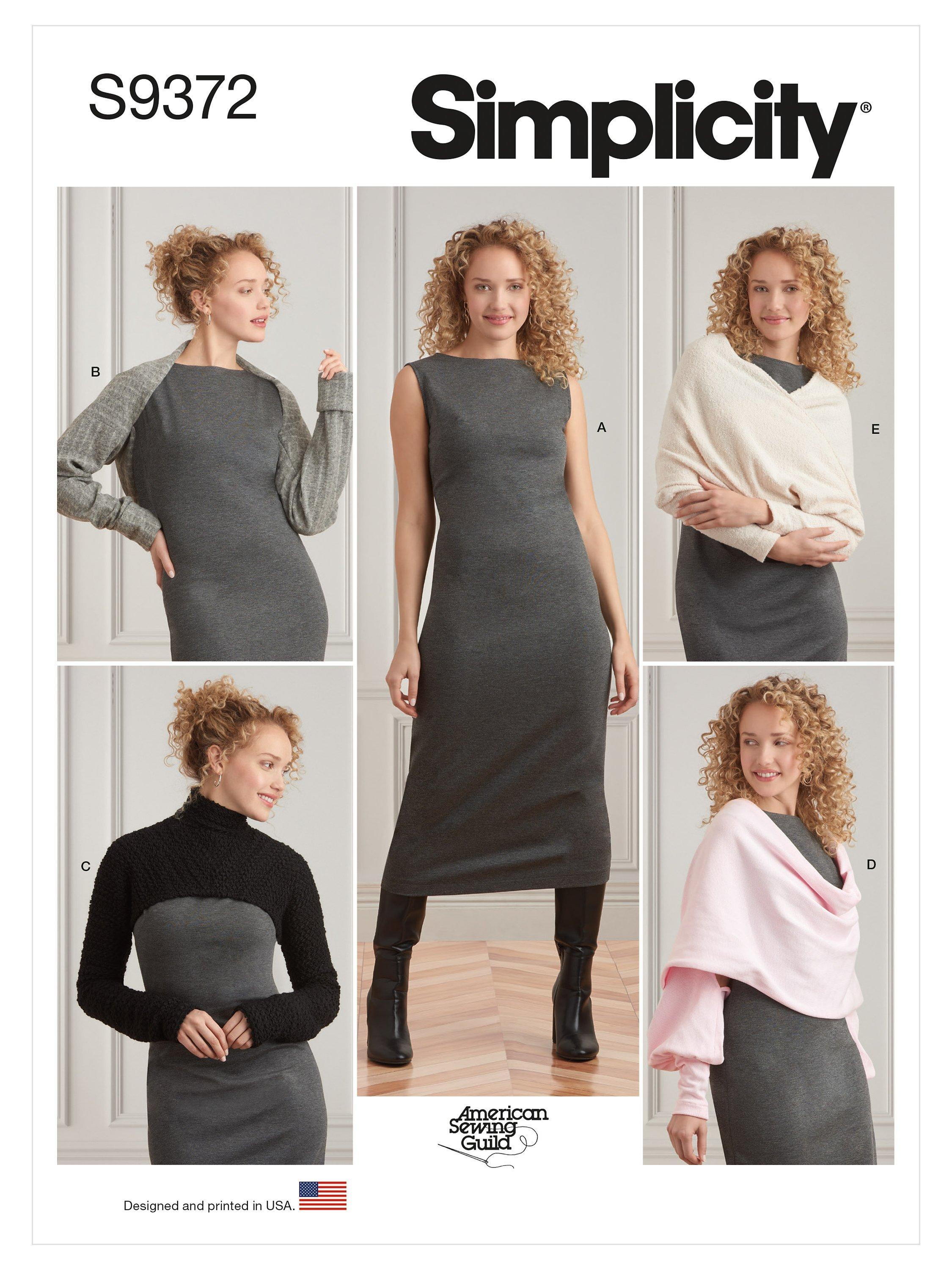 A Simplicity sewing pattern for a slim-fit dress with bust darts, invisible centre back zipper and back waist darts. Easy sewing shrugs and wraps that can be styled in multiple variations.