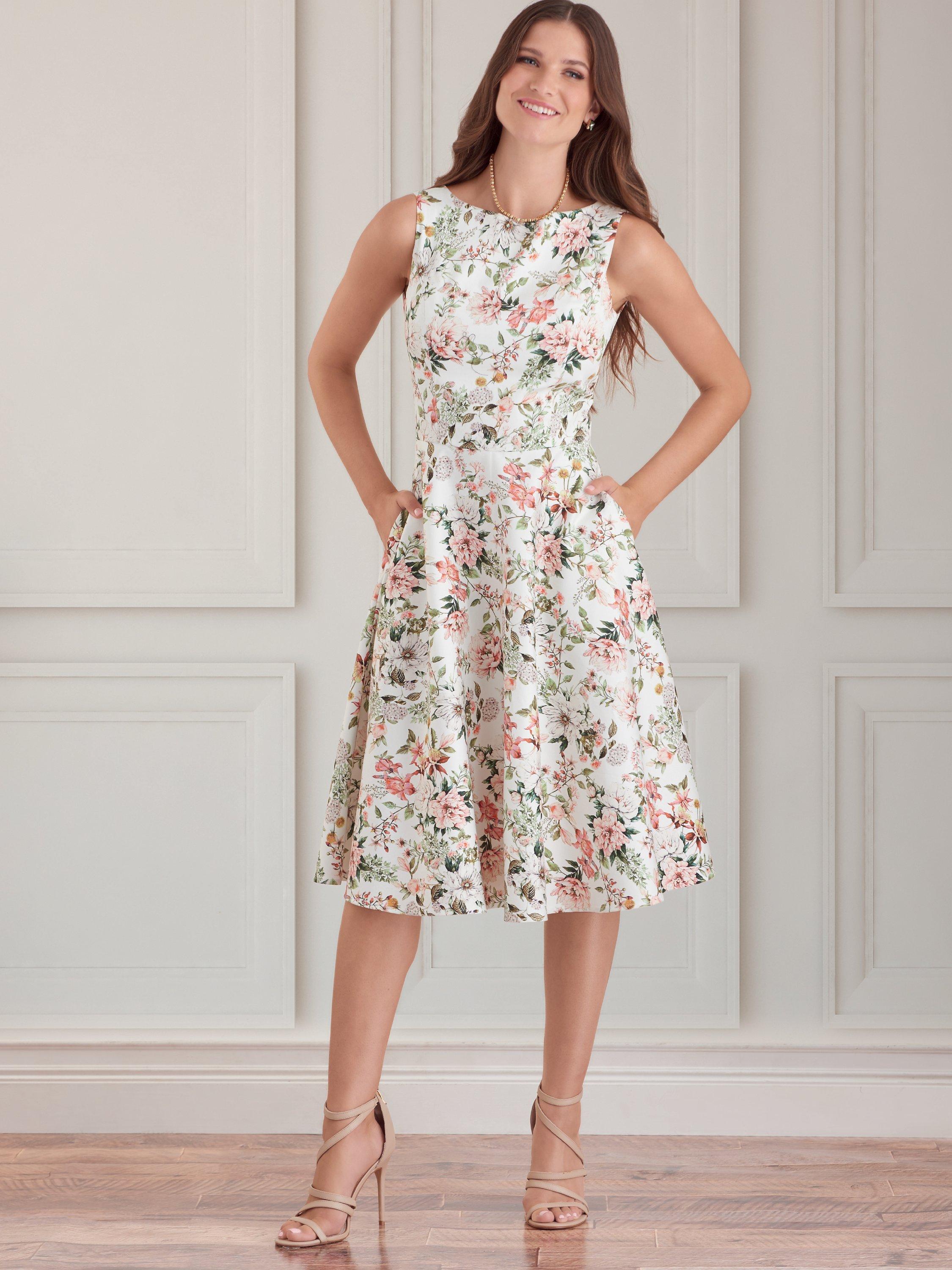 V-neck or jewel neckline dresses have flared skirt, optional three-quarter length sleeves and self-belt. Backs have invisible zips and back waist darts.