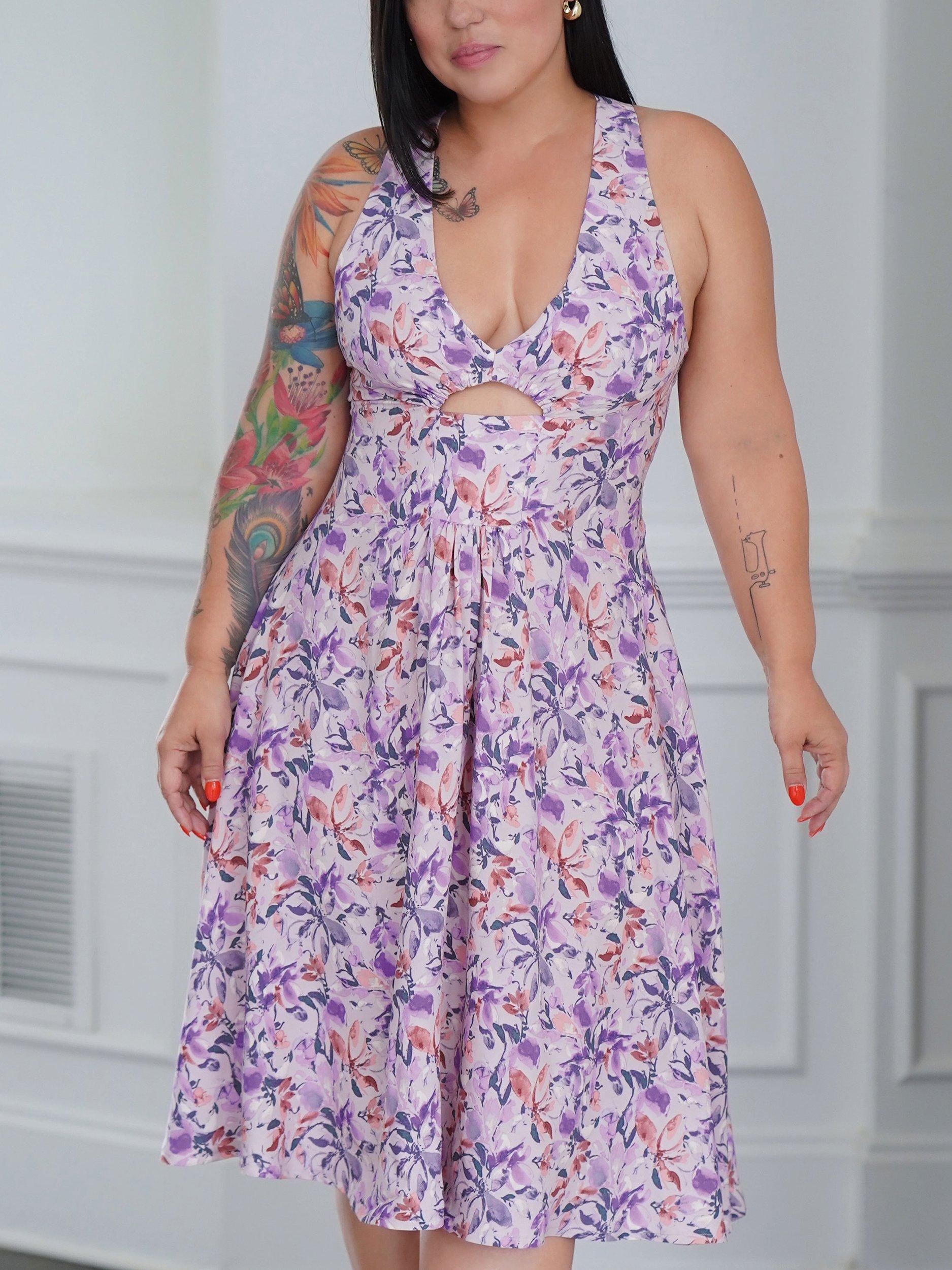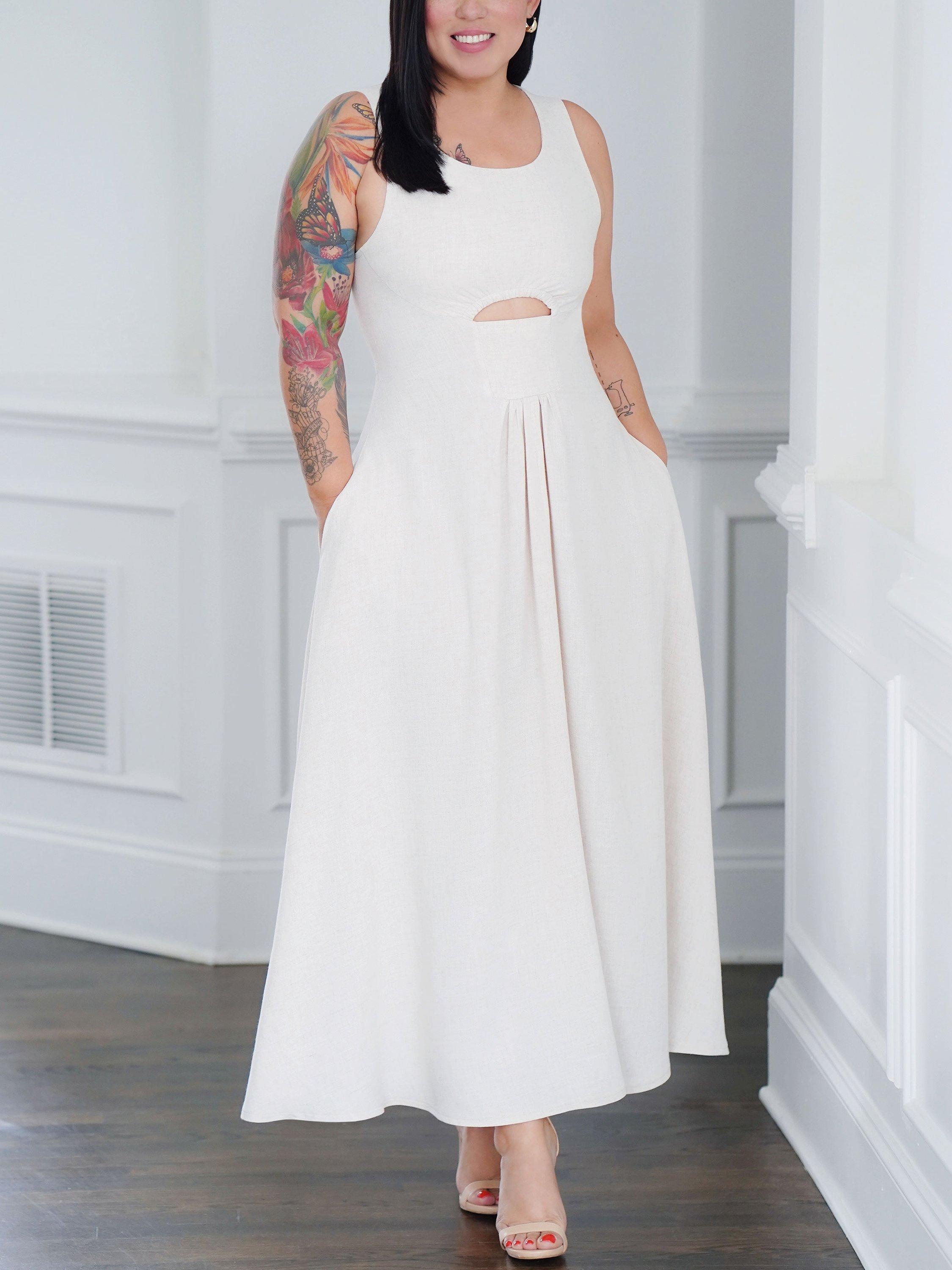 Deep V-neck or scoop neckline dresses have lined bodice, 1/4" elastic encased in shaped front cut-out, gathers below yoke, side seam pockets and invisible back zip.