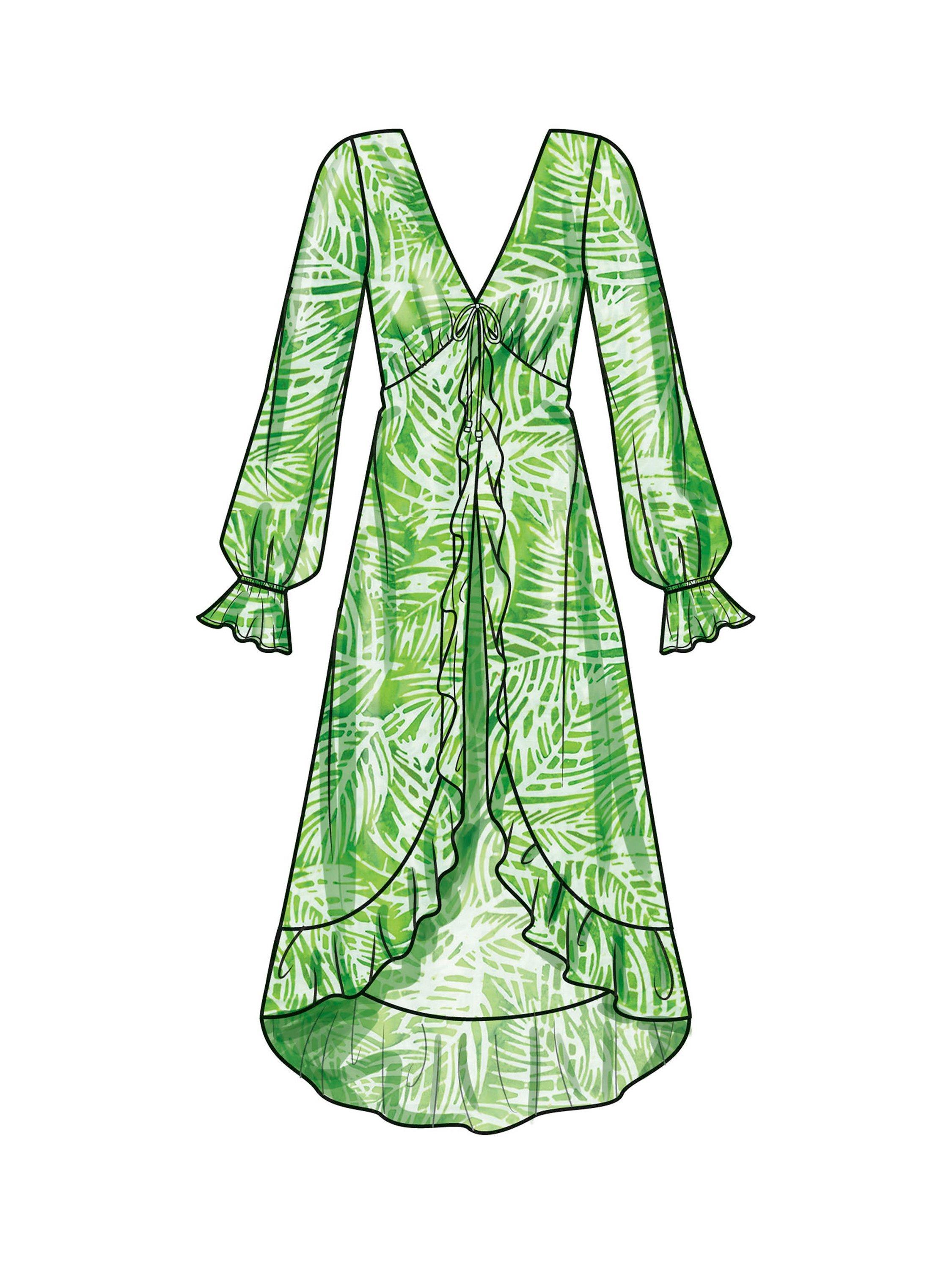 Misses' Dusters in three lengths have a deep V-neckline, lined bodice, tie front closure and bust gathers.