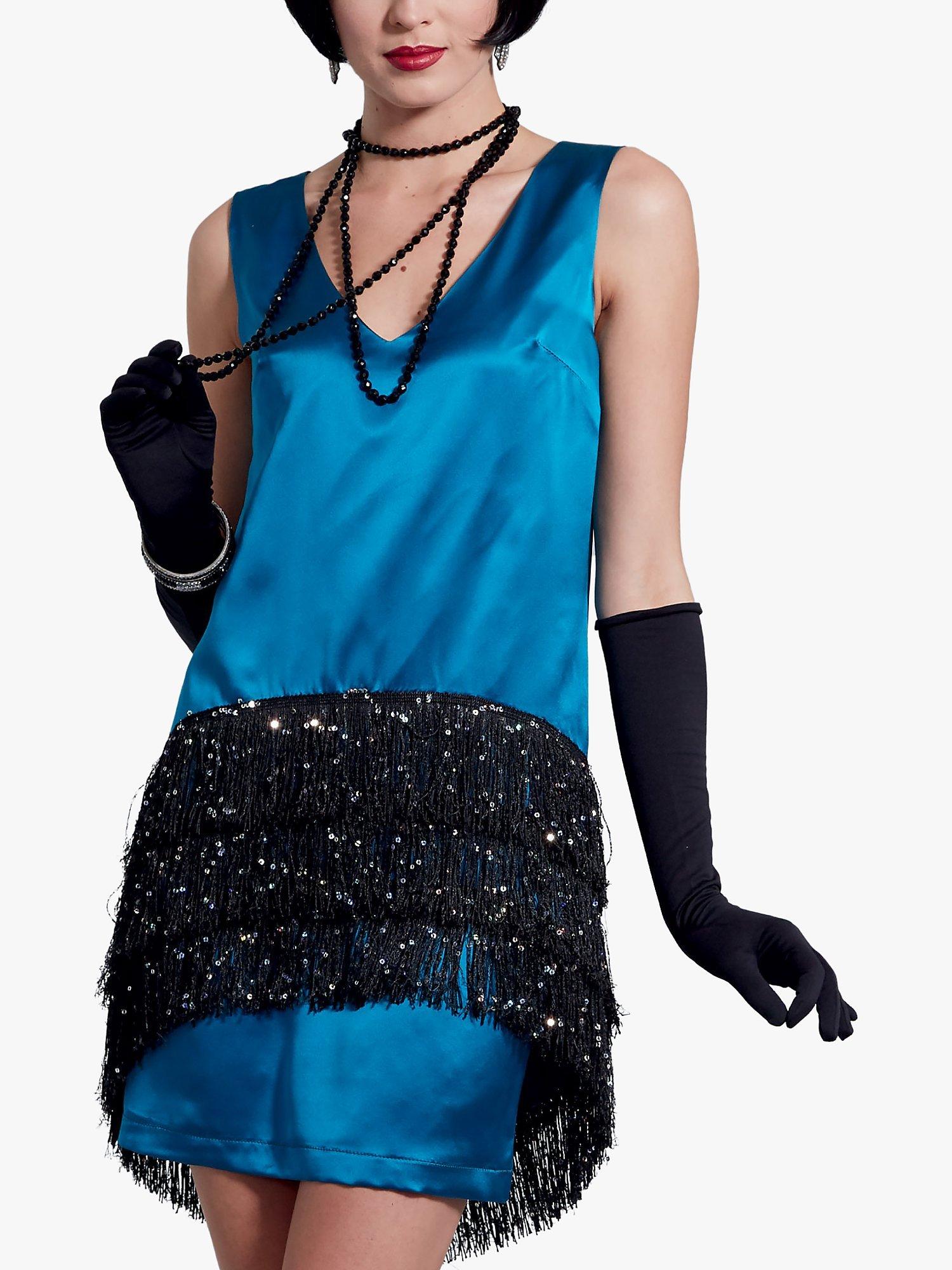 Free-spirited flappers, with sparkling rhinestone and fringe trim accents, easily dance the night away.