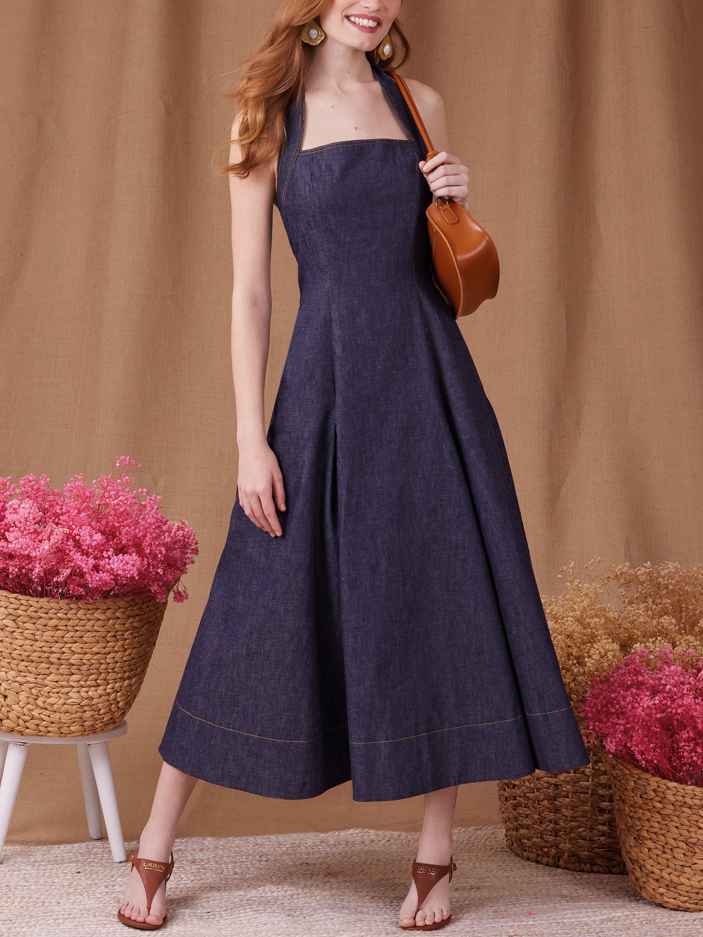 Flared dress with a wide halter neck strap has inverted pleated skirt, open back, side seam pockets, invisible zip closure and button closure at neck.