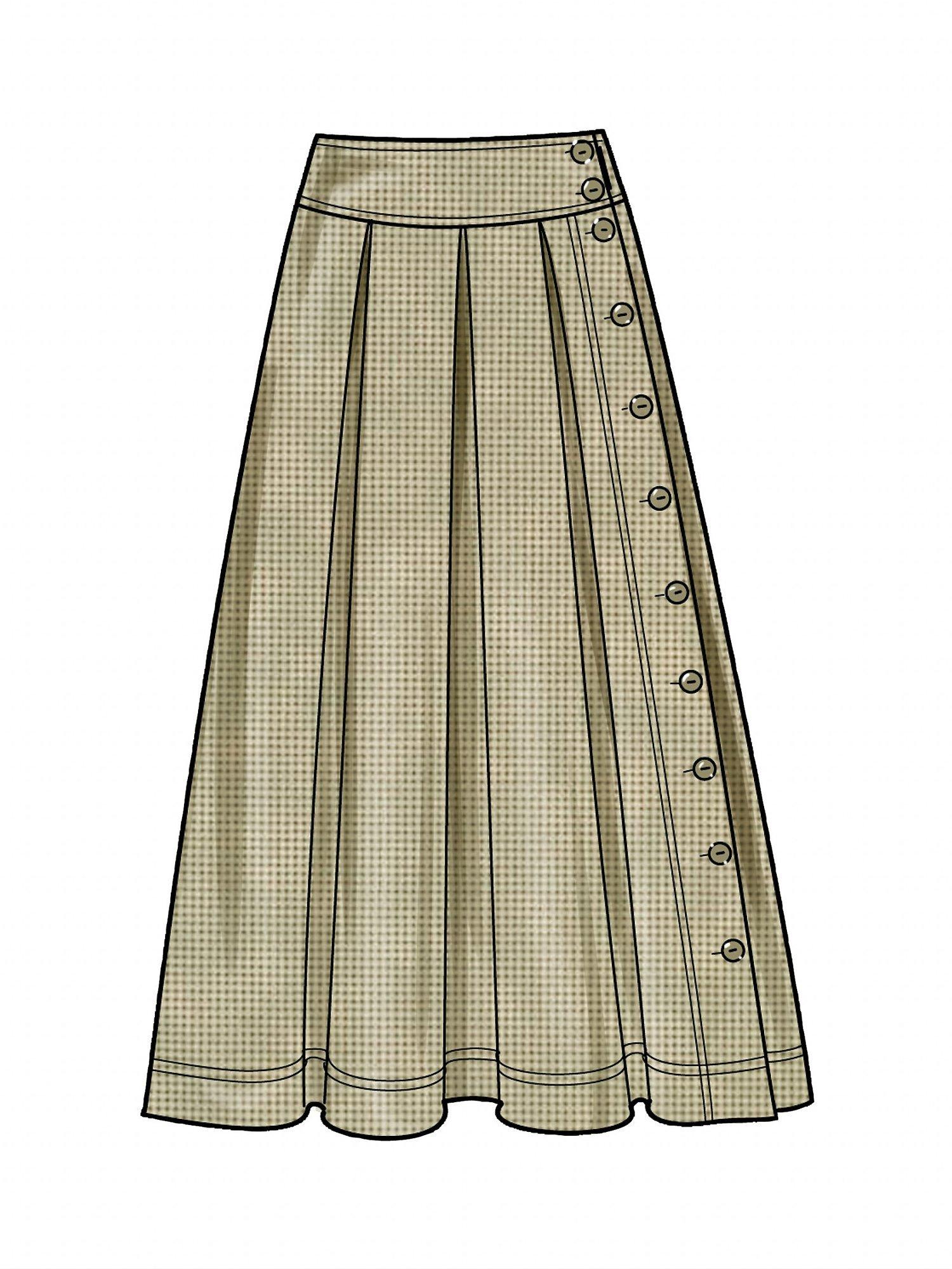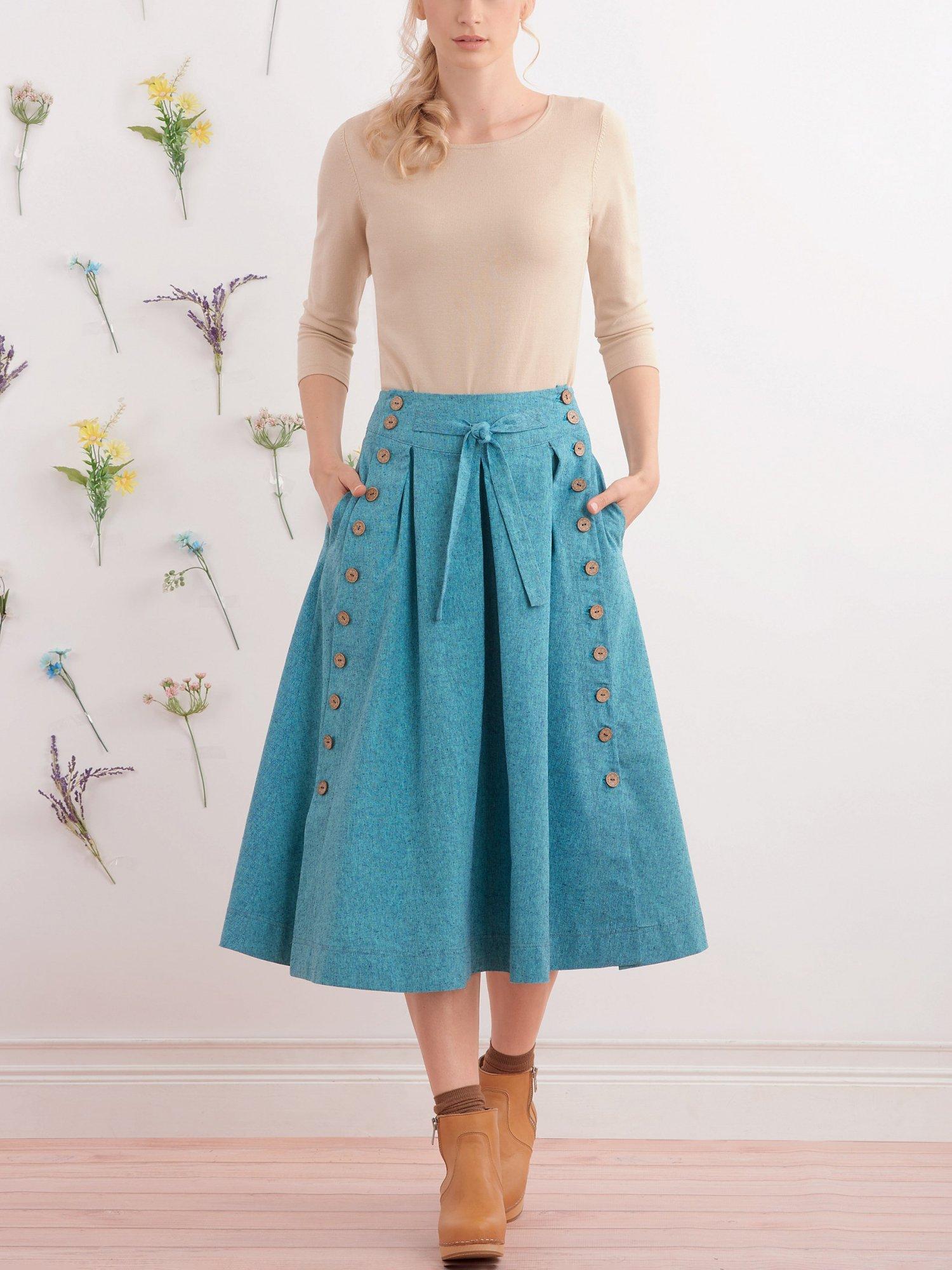 Flared skirts in two lengths, featuring button closure variations, has soft pleats from hip yoke, side seam pockets. Personalize your skirt with the perfect buttons.