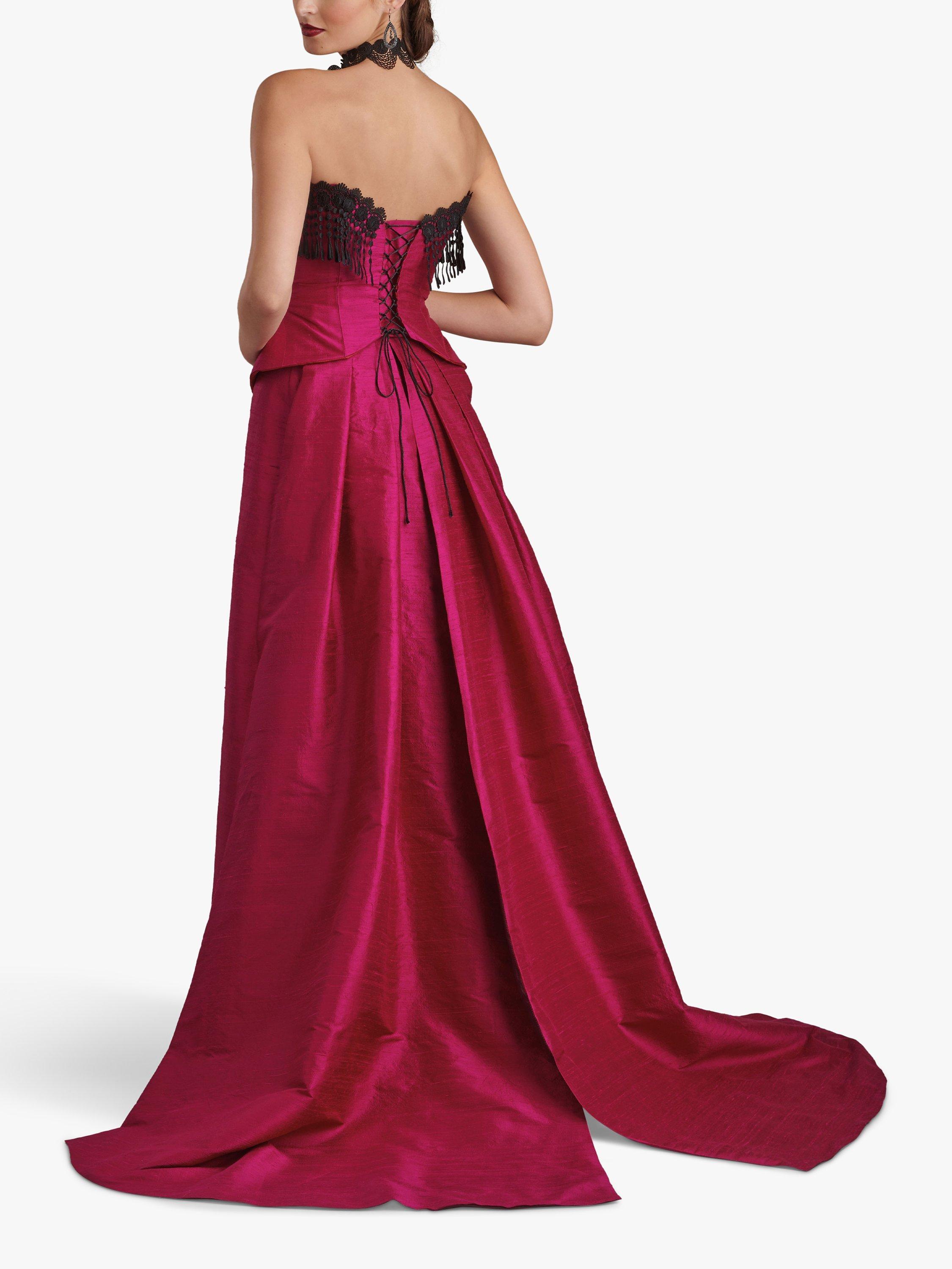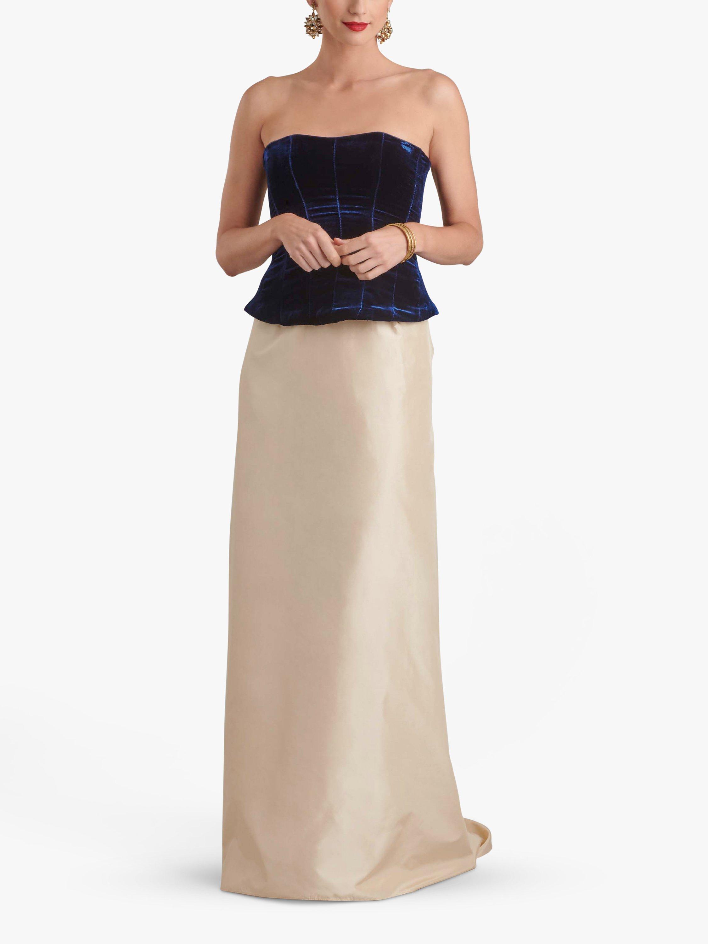 Floor length skirts have front A-line shape, back variations with short trains, side back zips and waistbands with skirt hook closures.Back options include tailored A-line with princess seams, pleated back panels or dramatic bustle. Bustle skirt keeps its shape with net stiffening.