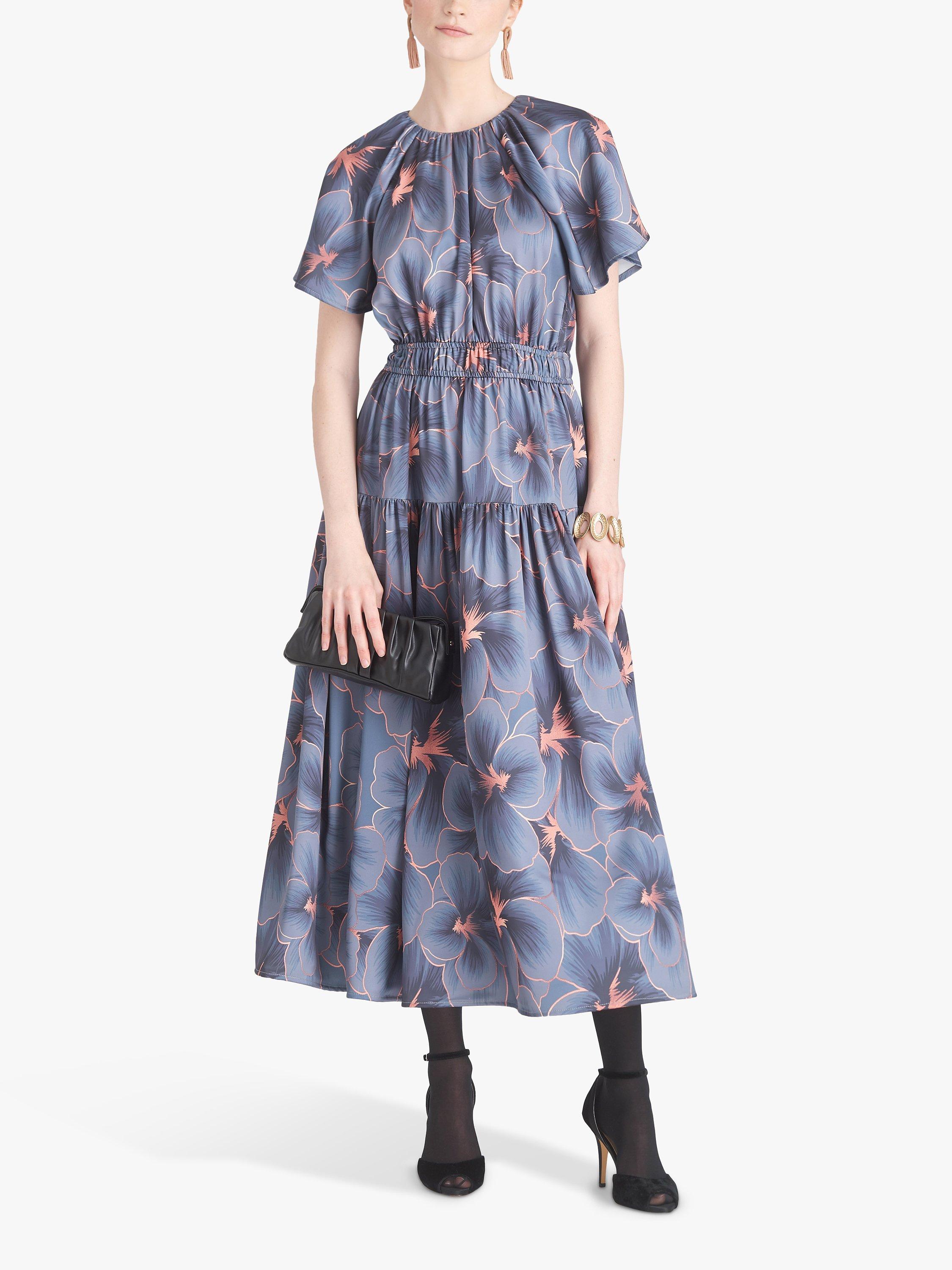 Dress A has long sleeves with elastic gathers at wrist. Dresses B and C have flutter sleeves.