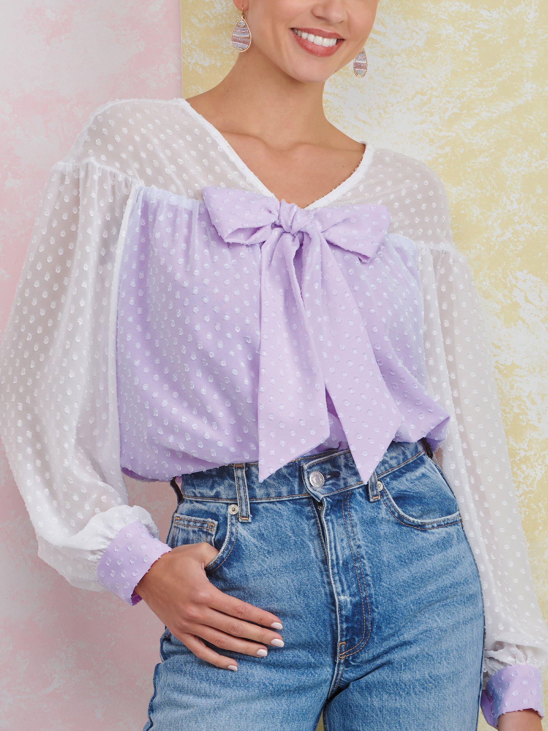 Relaxed fit gathered top features V-neckline with long puff sleeves gathered into cuffs or short puff sleeves with bands.