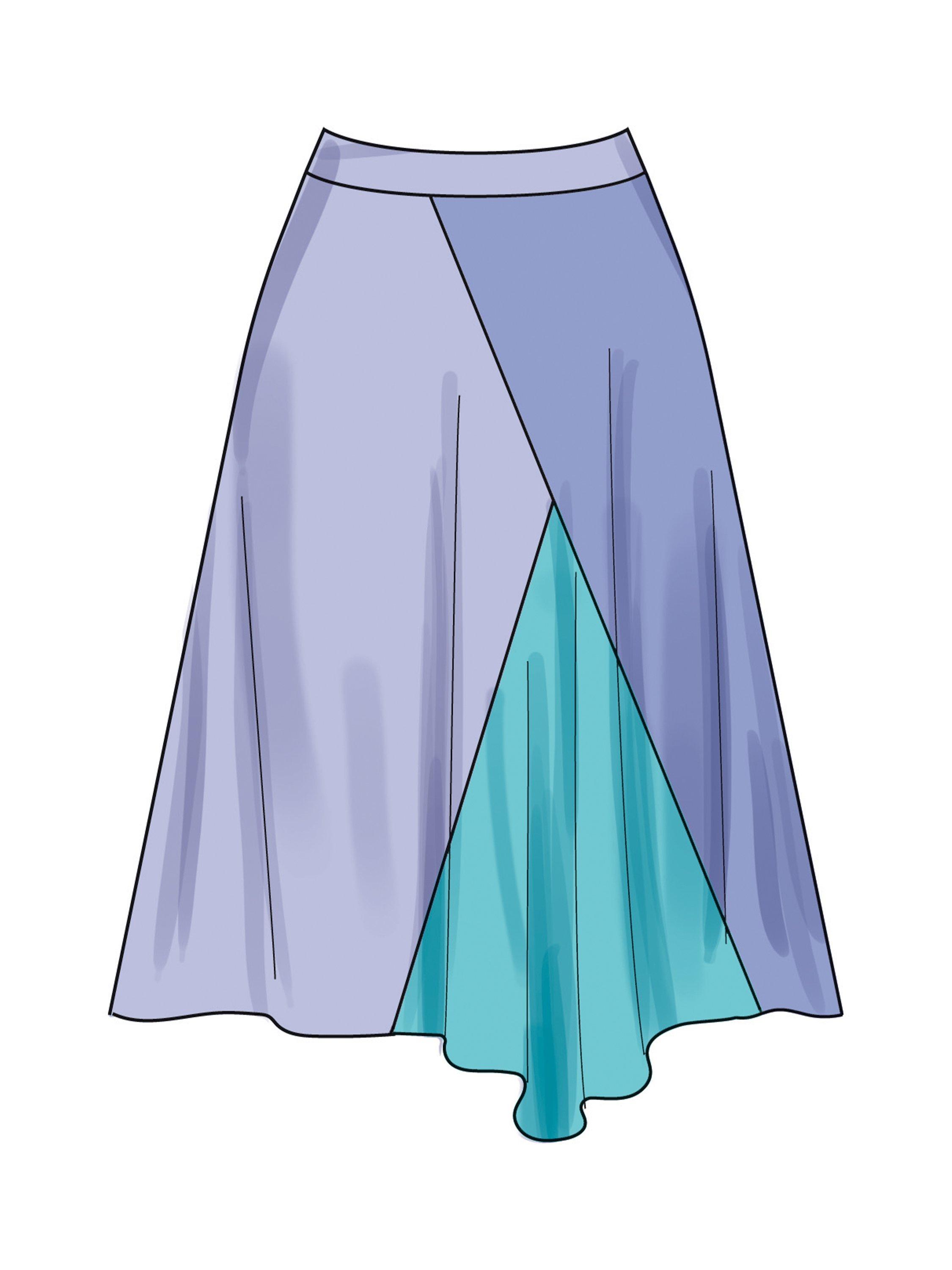 Easy to sew godet skirts have shaped waistband, baby hem, invisible zip closure and length variations. View A skirt has contrast.