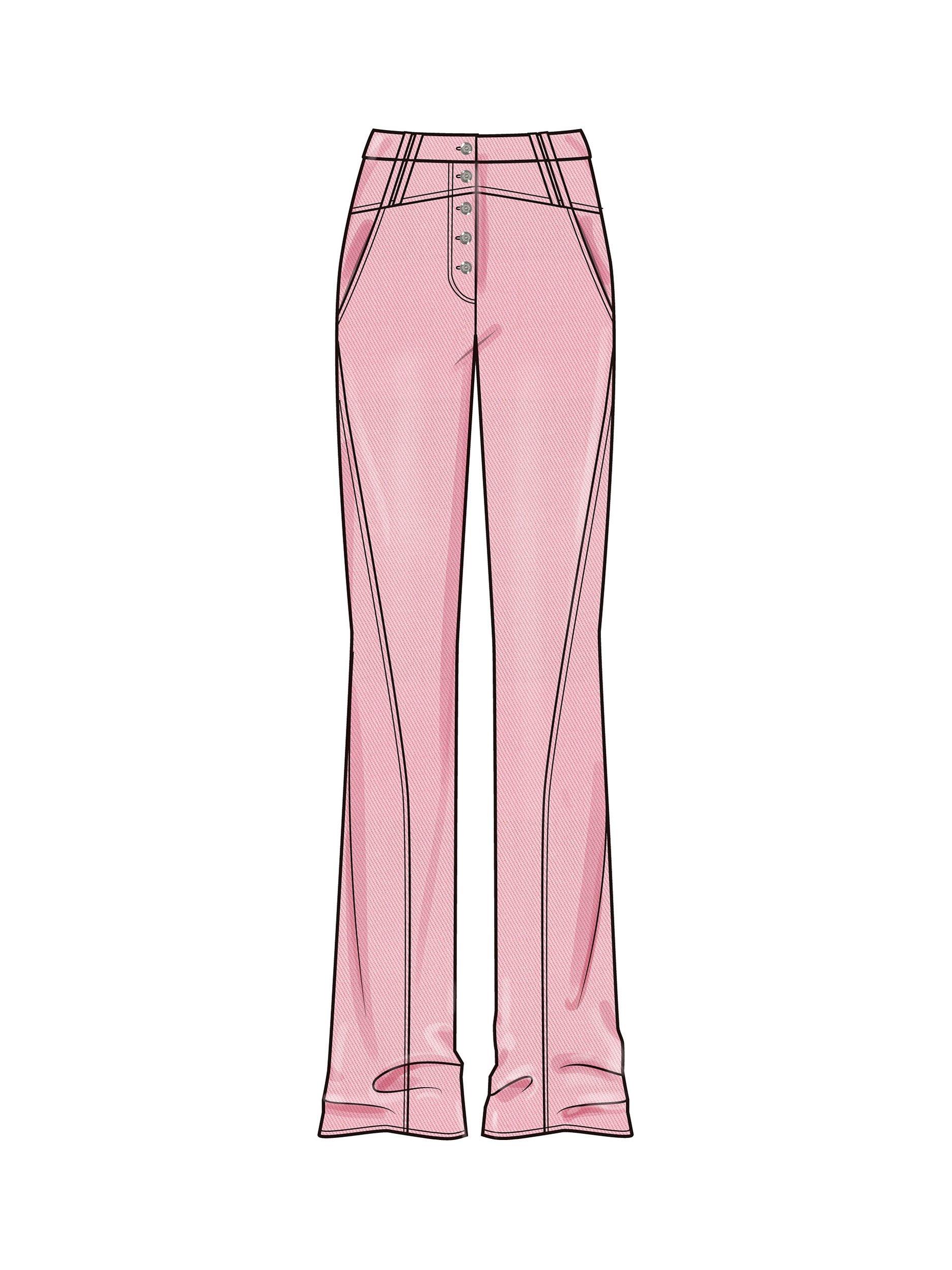 Low-waisted jeans with pockets have two closure options, a front fly zip or button fly closure. View B has contrast outer panels, yoke and waistband. Top stitching is optional.