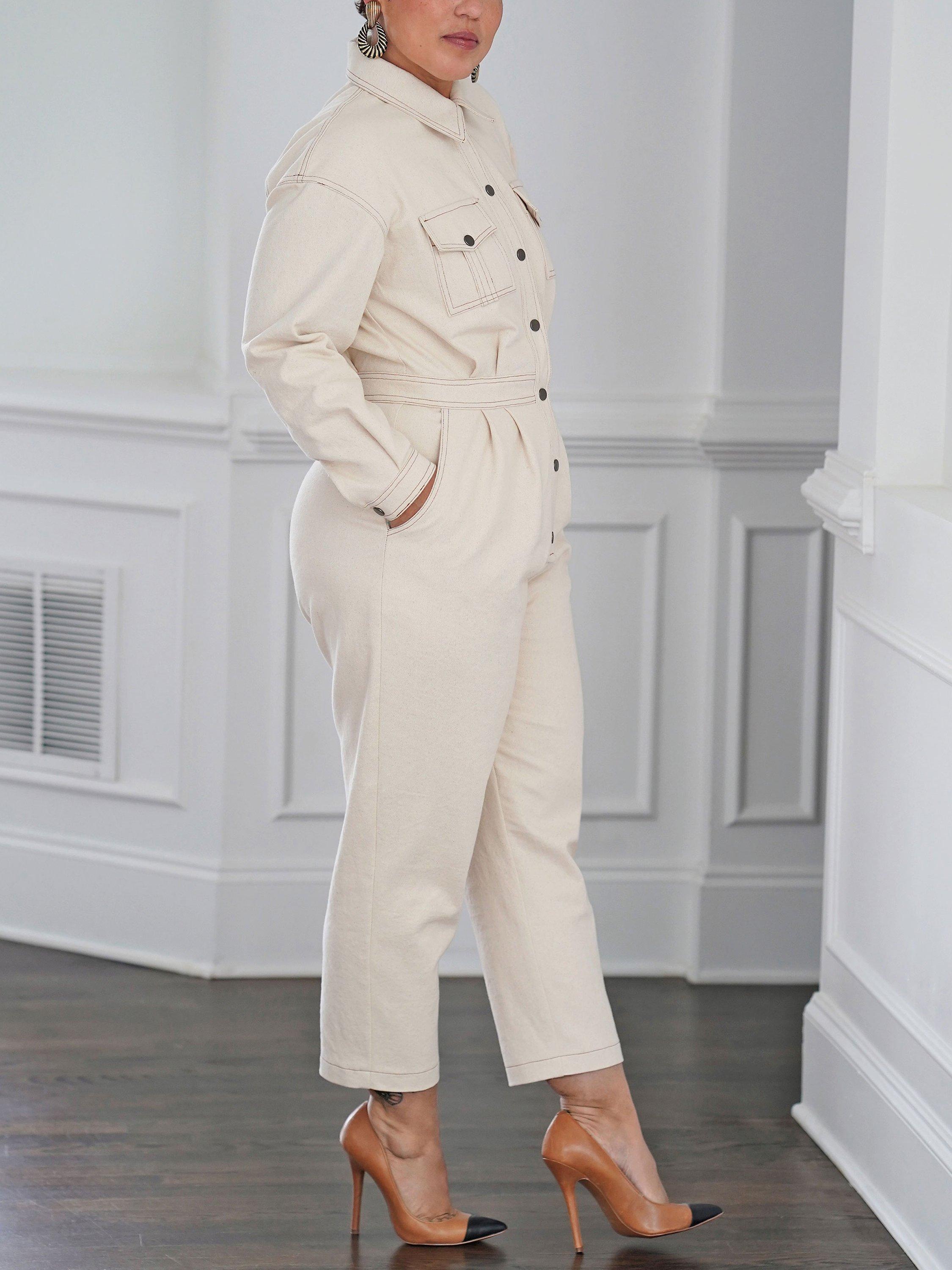 Misses Jumpsuit with snaps or button closure at the centre front has pleats at the waist, long sleeves with cuffs, back bodice yoke, front pockets and choice of tapered or wide leg pant options.