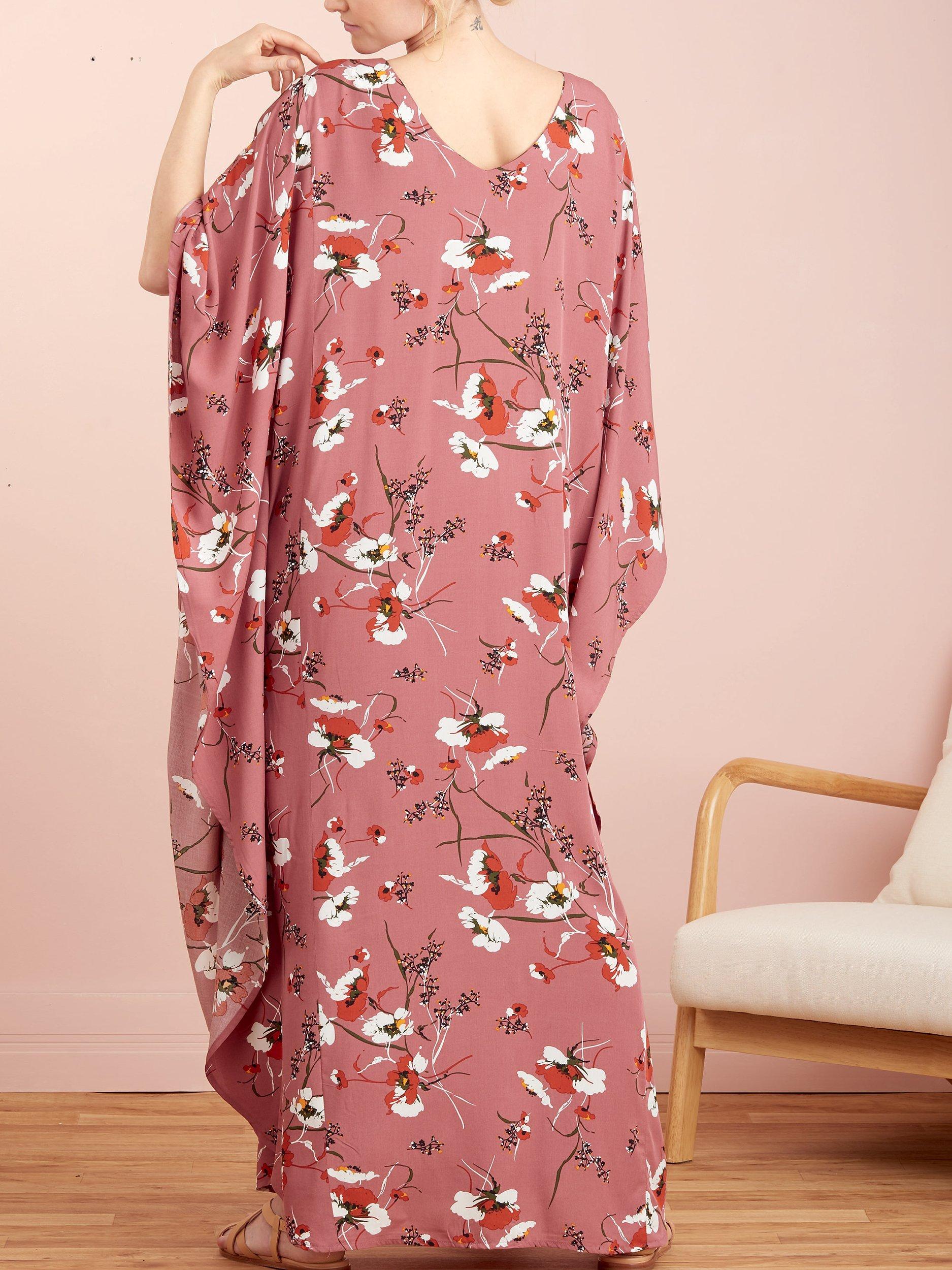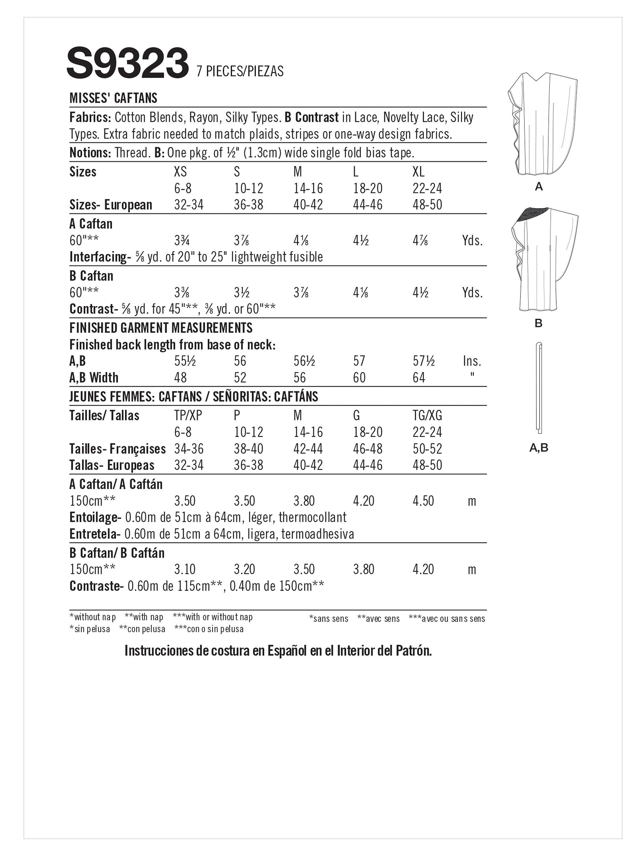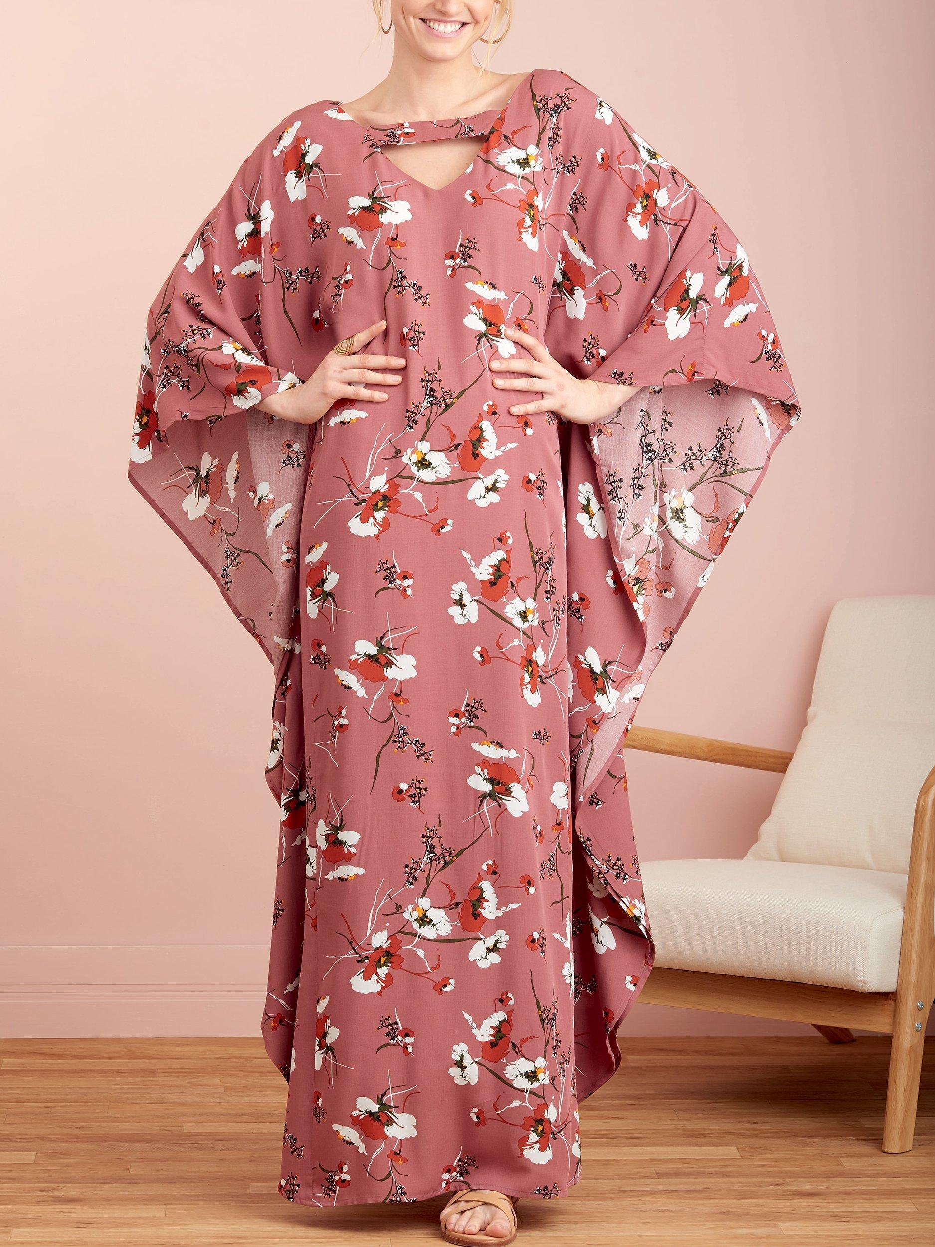Kaftans with neckline variations and optional waist tie. View A has v-neck with band. View B has a contrast cut-away.