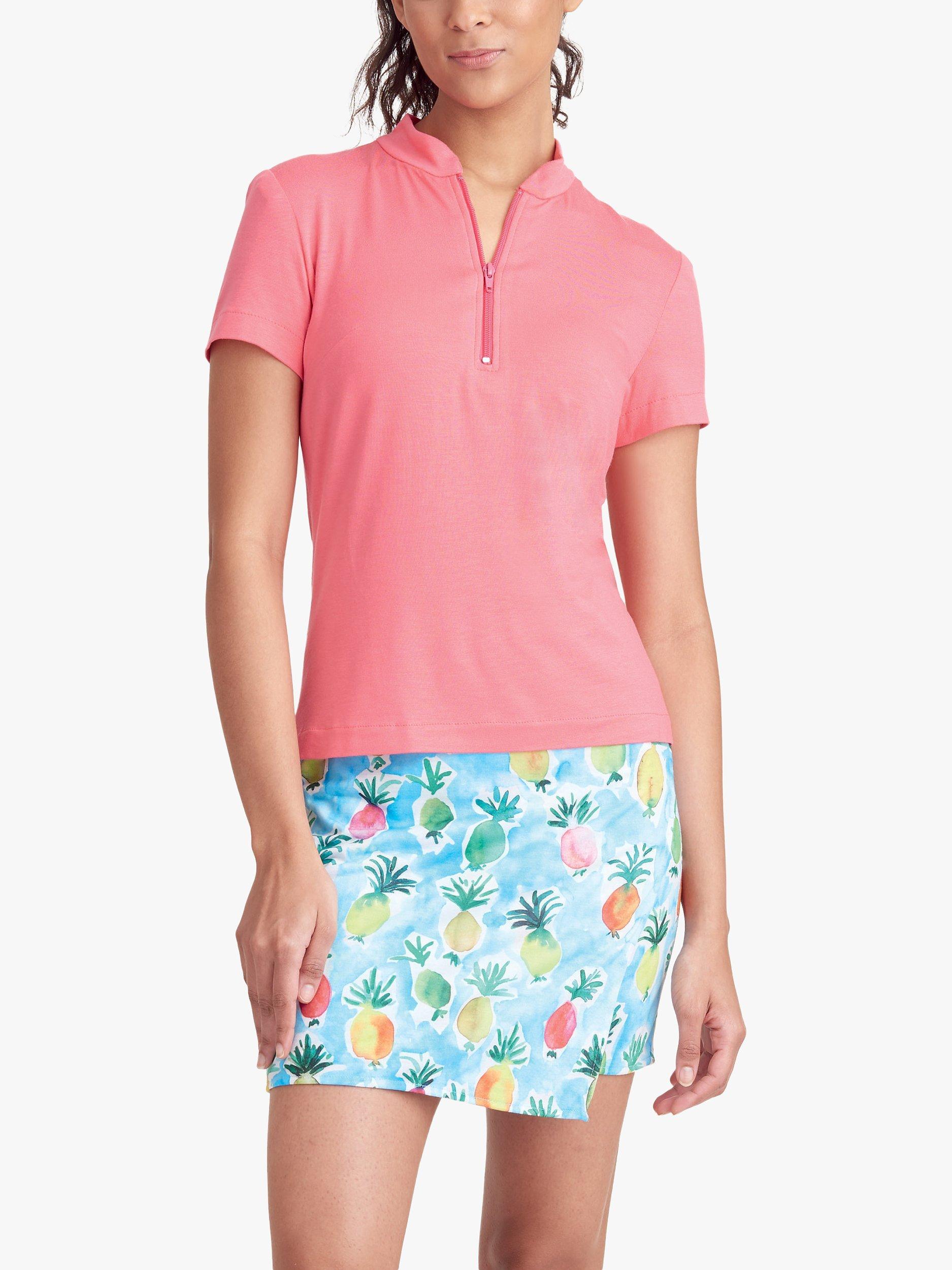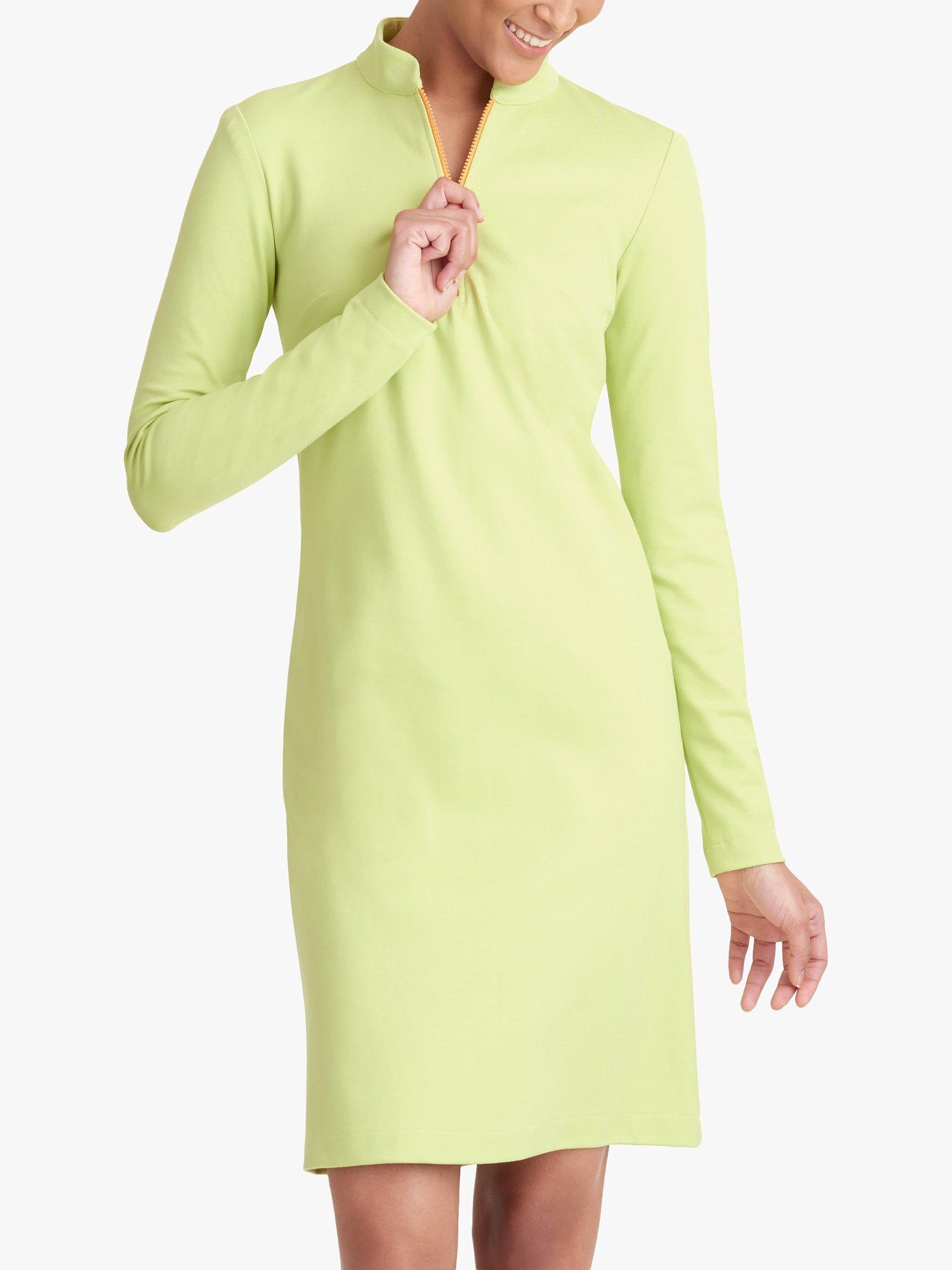 Knit zip front dresses and top with stand collar and sleeve variations.