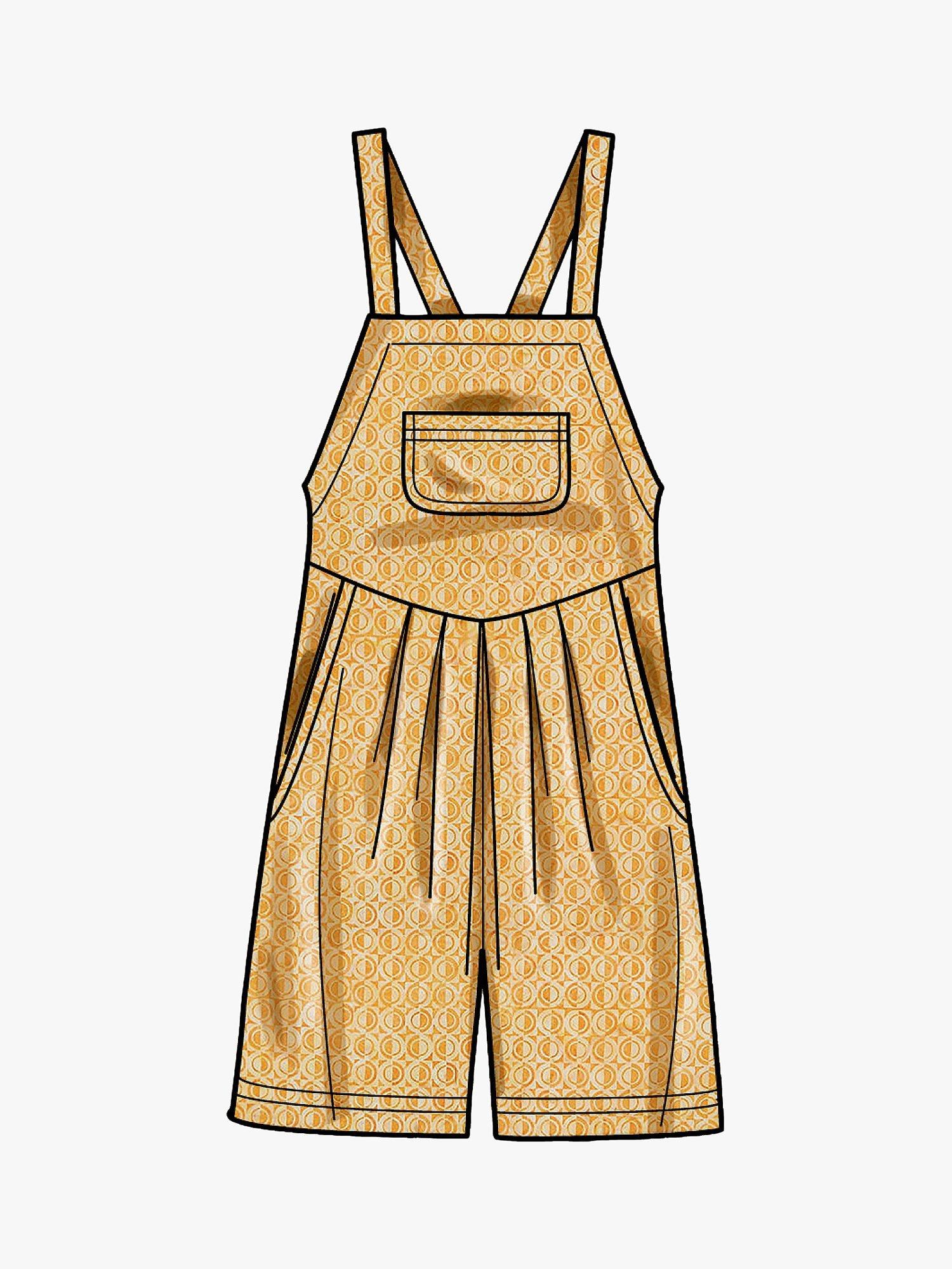 Straight leg overall in two lengths with shaped raised waist, bib, back ties, buttons and patch pocket. Also has front pleats and slash pockets.
