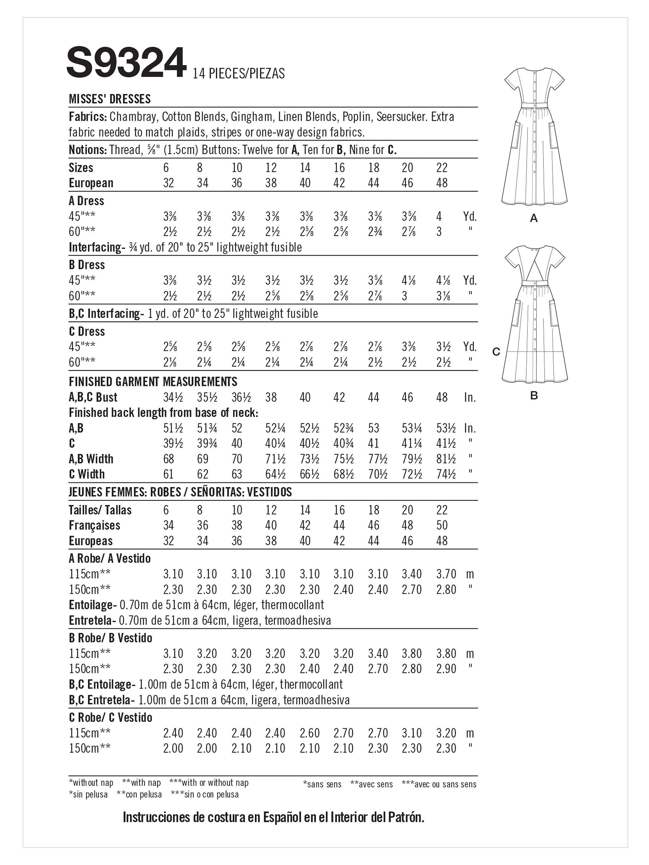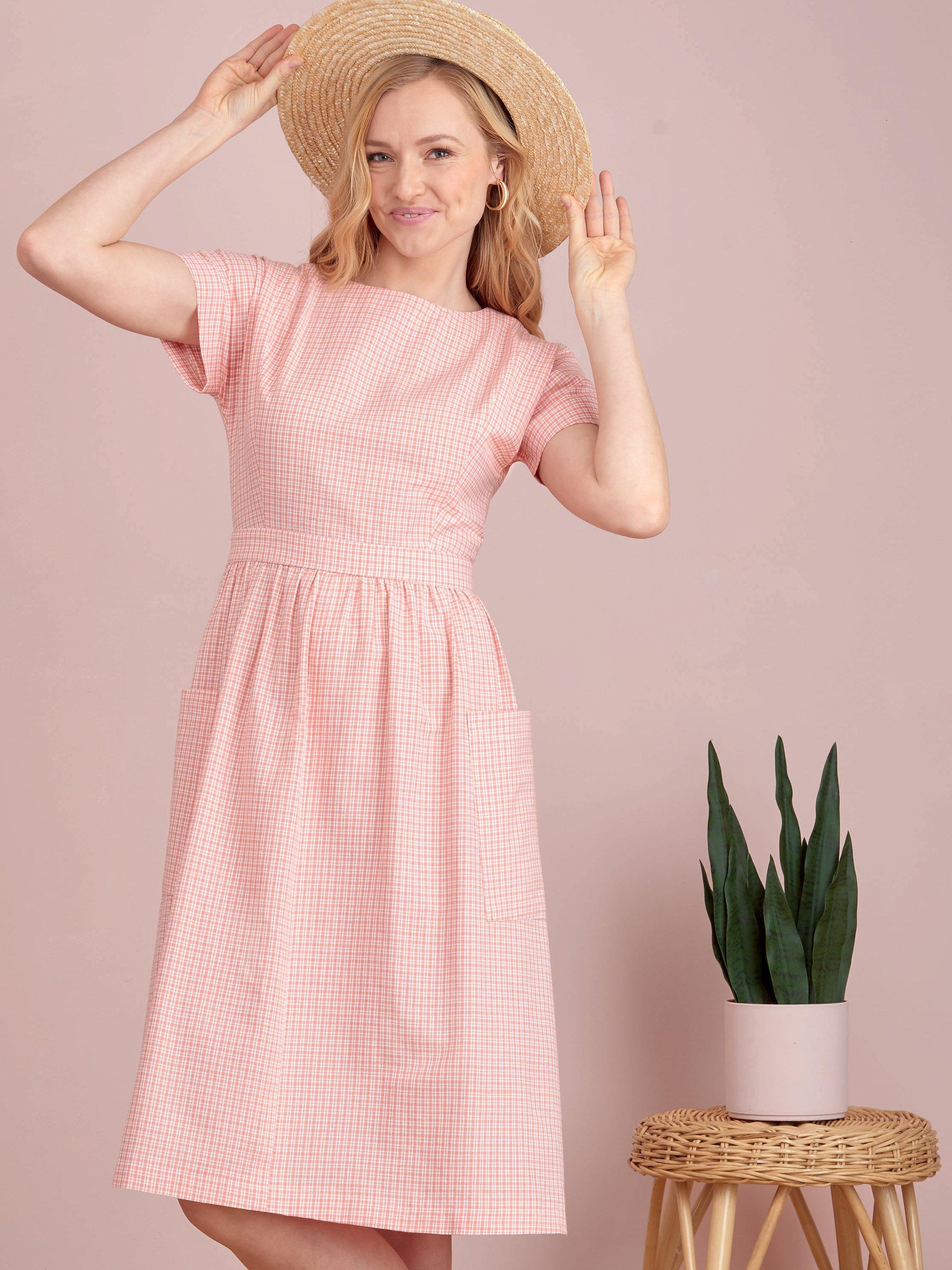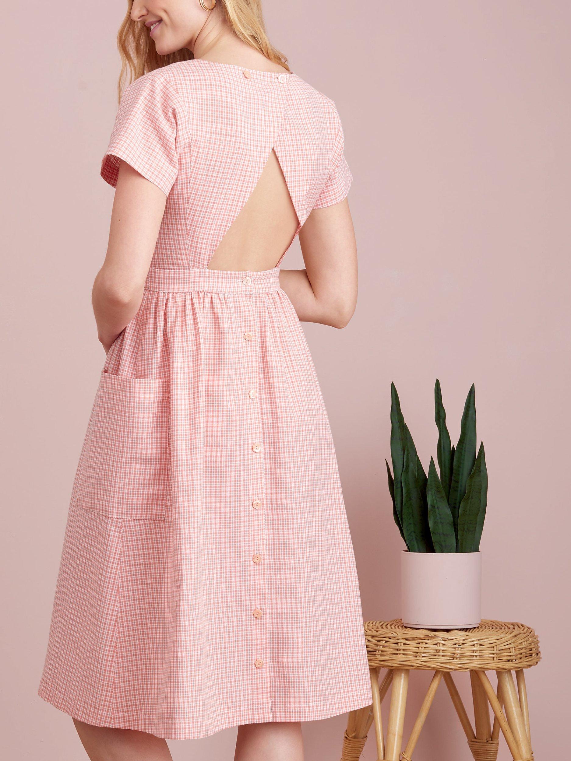Dresses in two lengths with patch pockets; back button closure with an open bodice or centre back button variations.