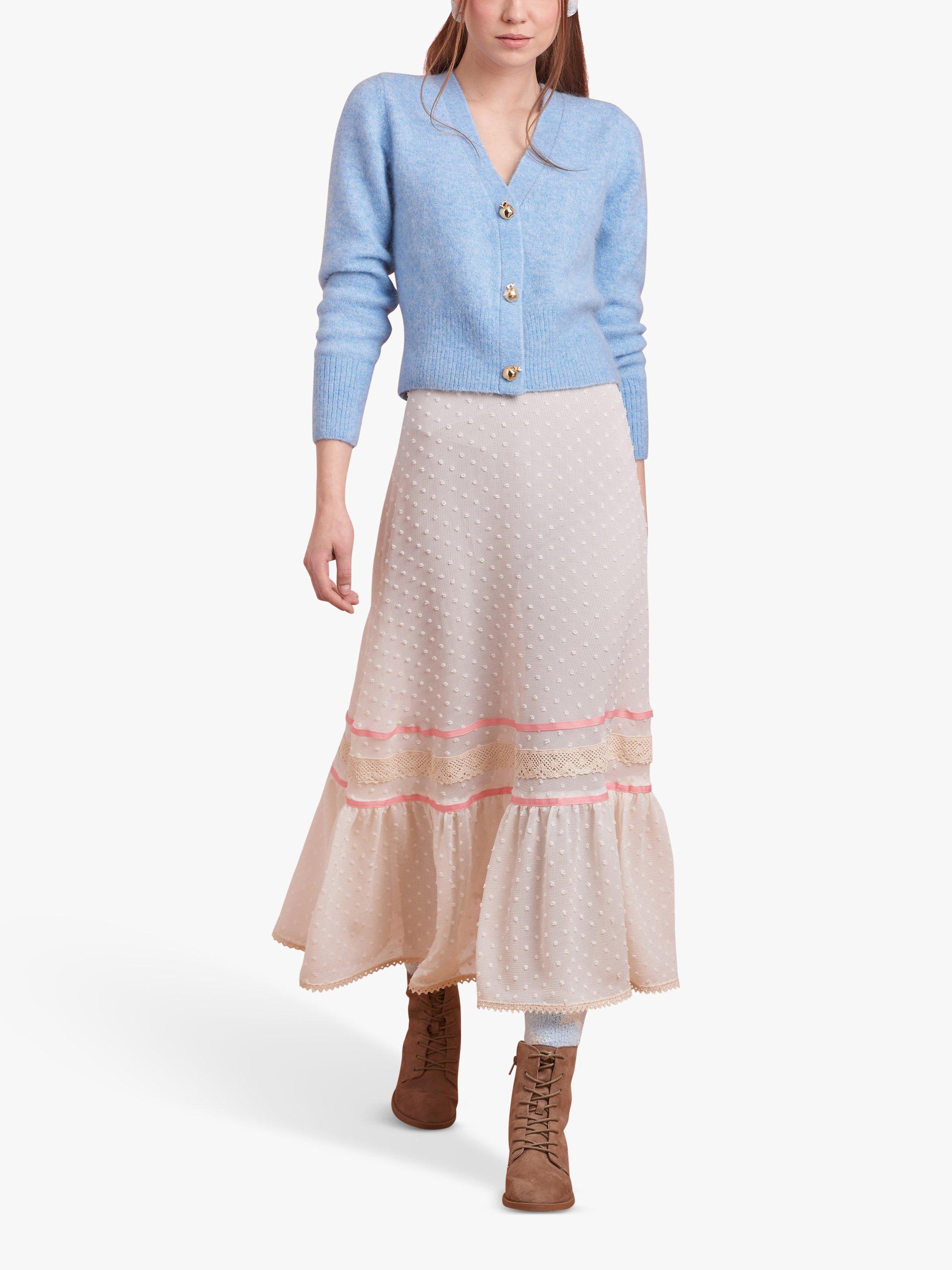 Mid-calf flared pettiskirt is designed for layering and has a ribbon-tied waistband, hem ruffle, and ribbon and lace trims.