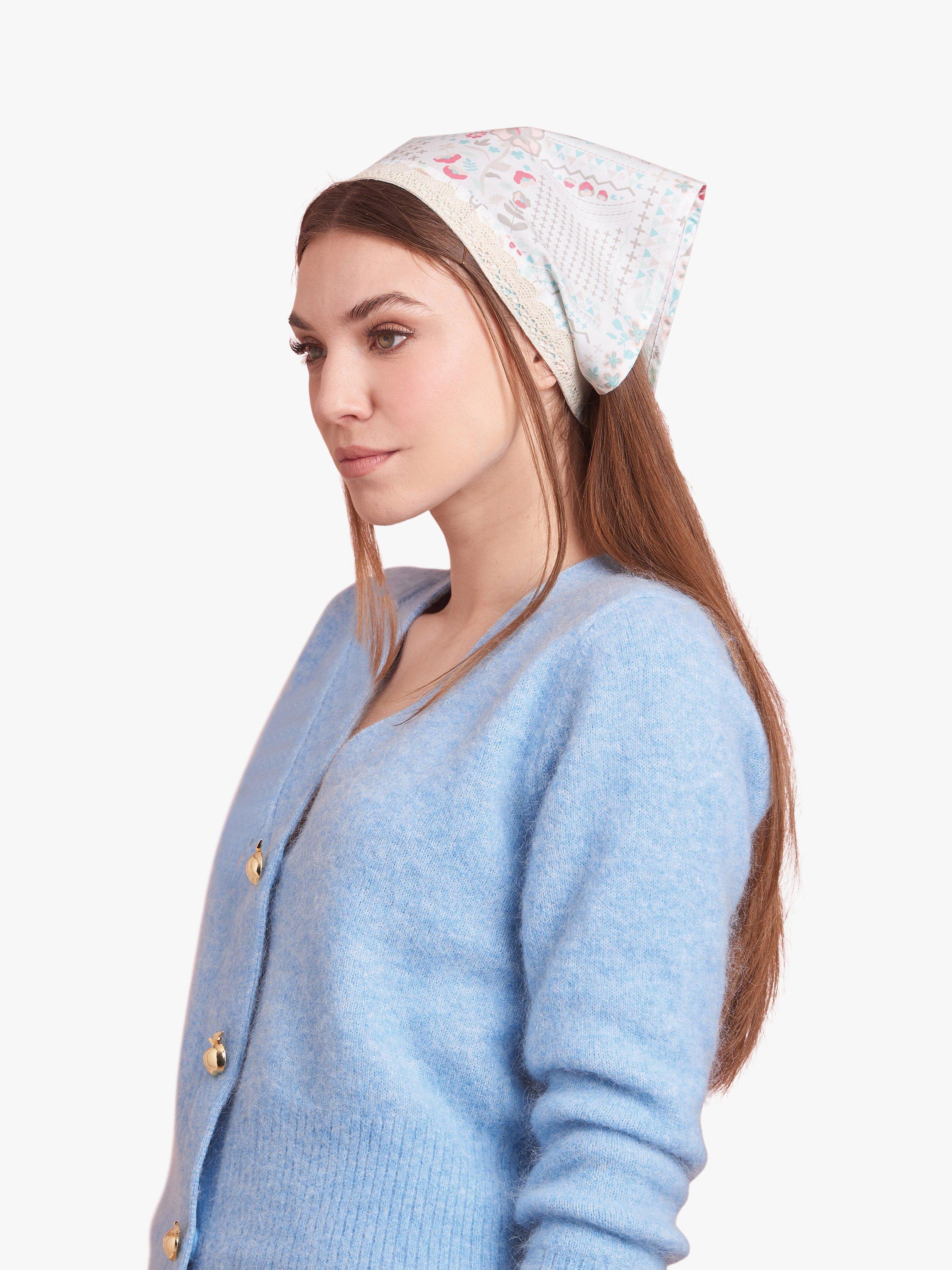 Head scarf and hair tie are elasticated for adjustment. Lined purses with zipper or flap closures with ribbon have assorted handles, straps, and embellishments.