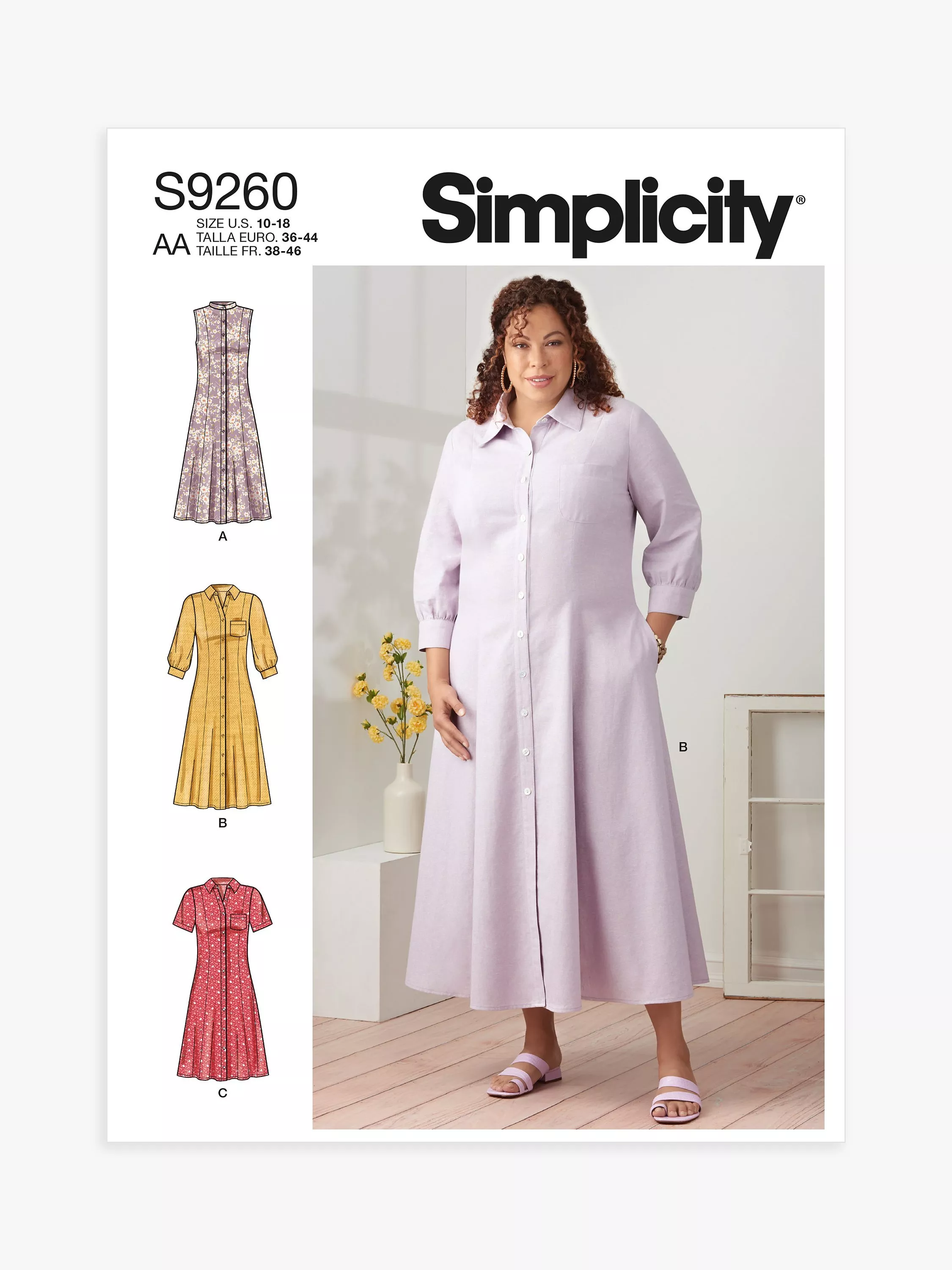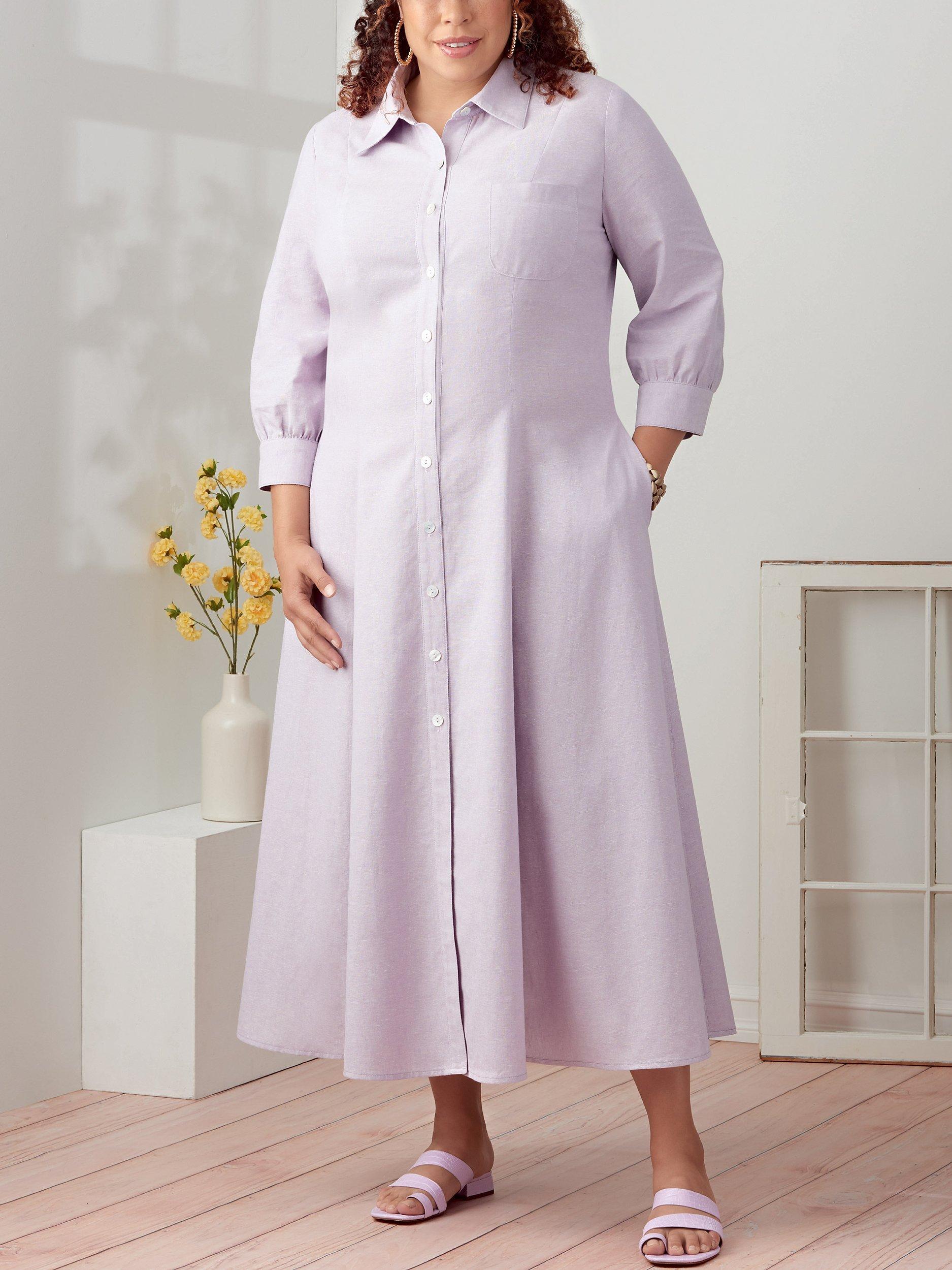 Women's button-front dresses with collar and sleeve options, breast pocket and side seam pockets.