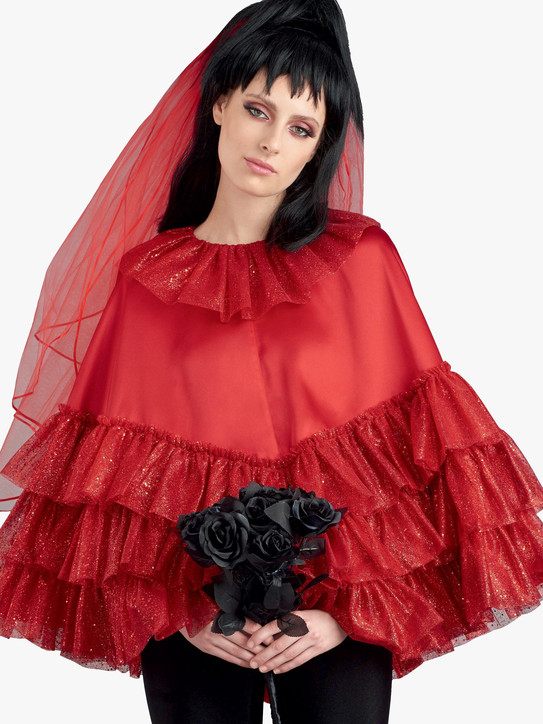 Options include rick rack trimmed-ruffled collar and pom pom appliques, a bevy of sheer ruffles and a sheer overlay with jagged hem and spider applique option. Matching face masks with sheer overlays and flirty lips appliques finish the look.