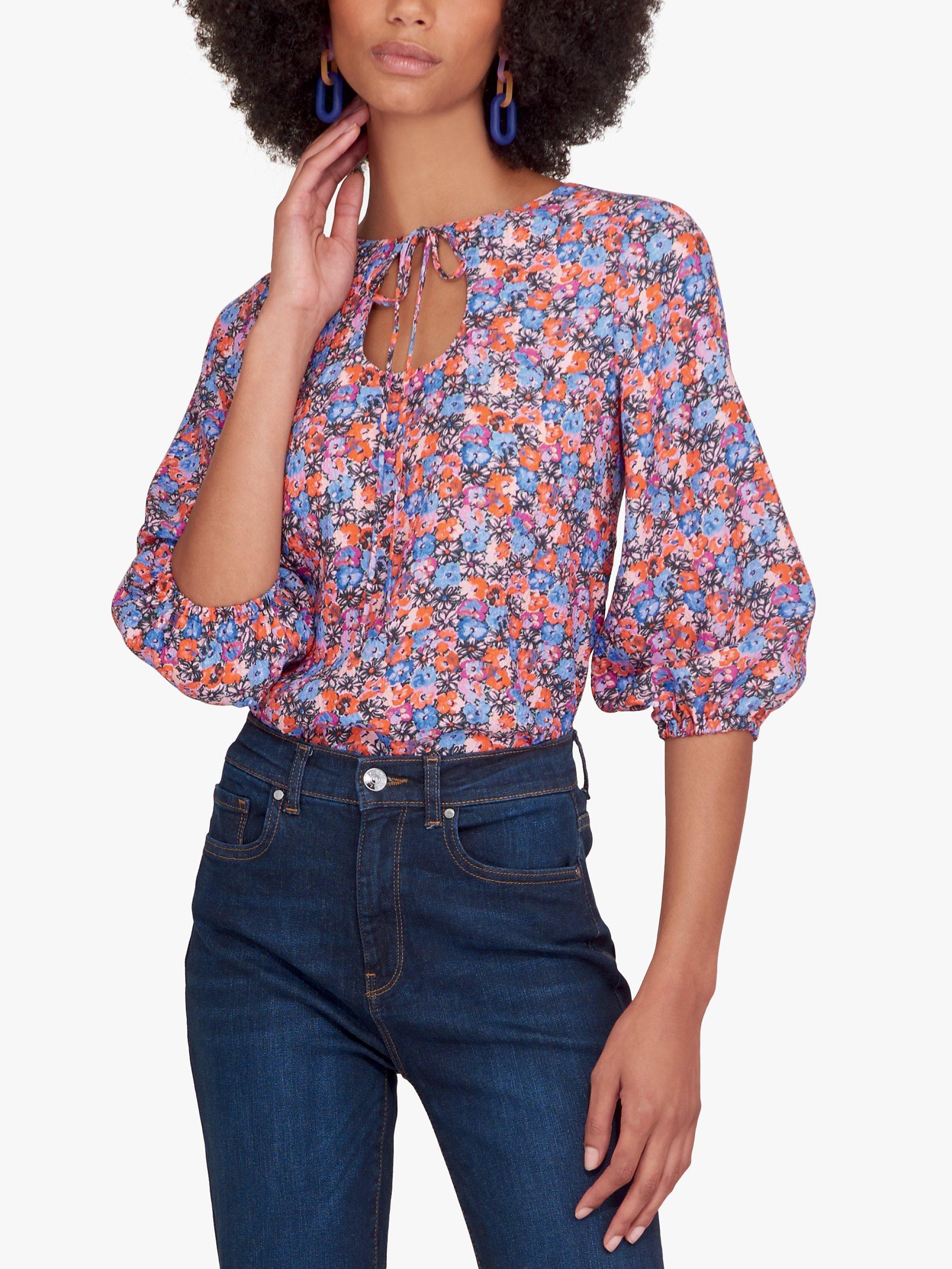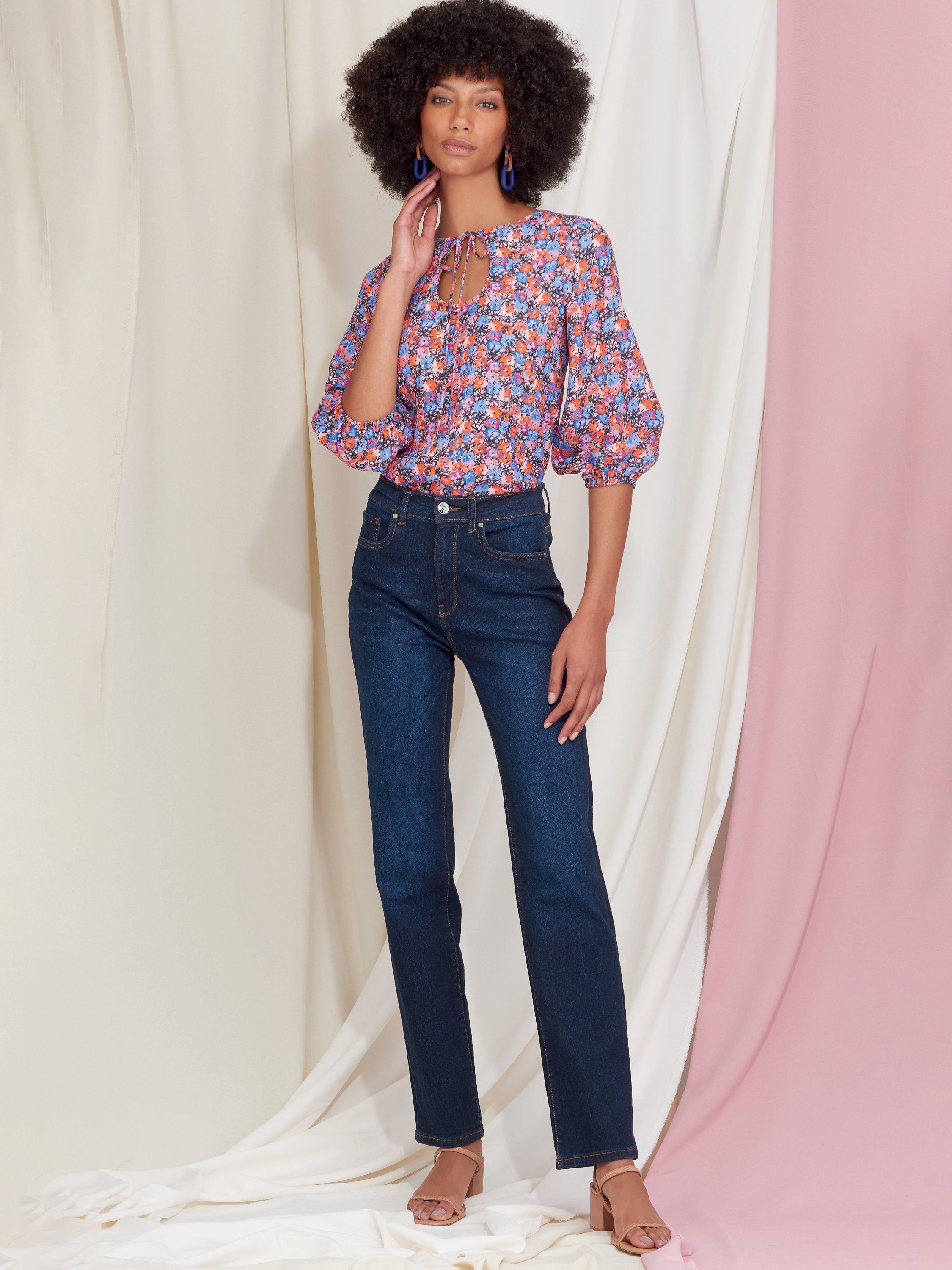 Pullover tops, in tunic or hip lengths feature V-shaped and cut-out necklines with self ties. Three-quarter and elbow-length sleeves gather to elastic.