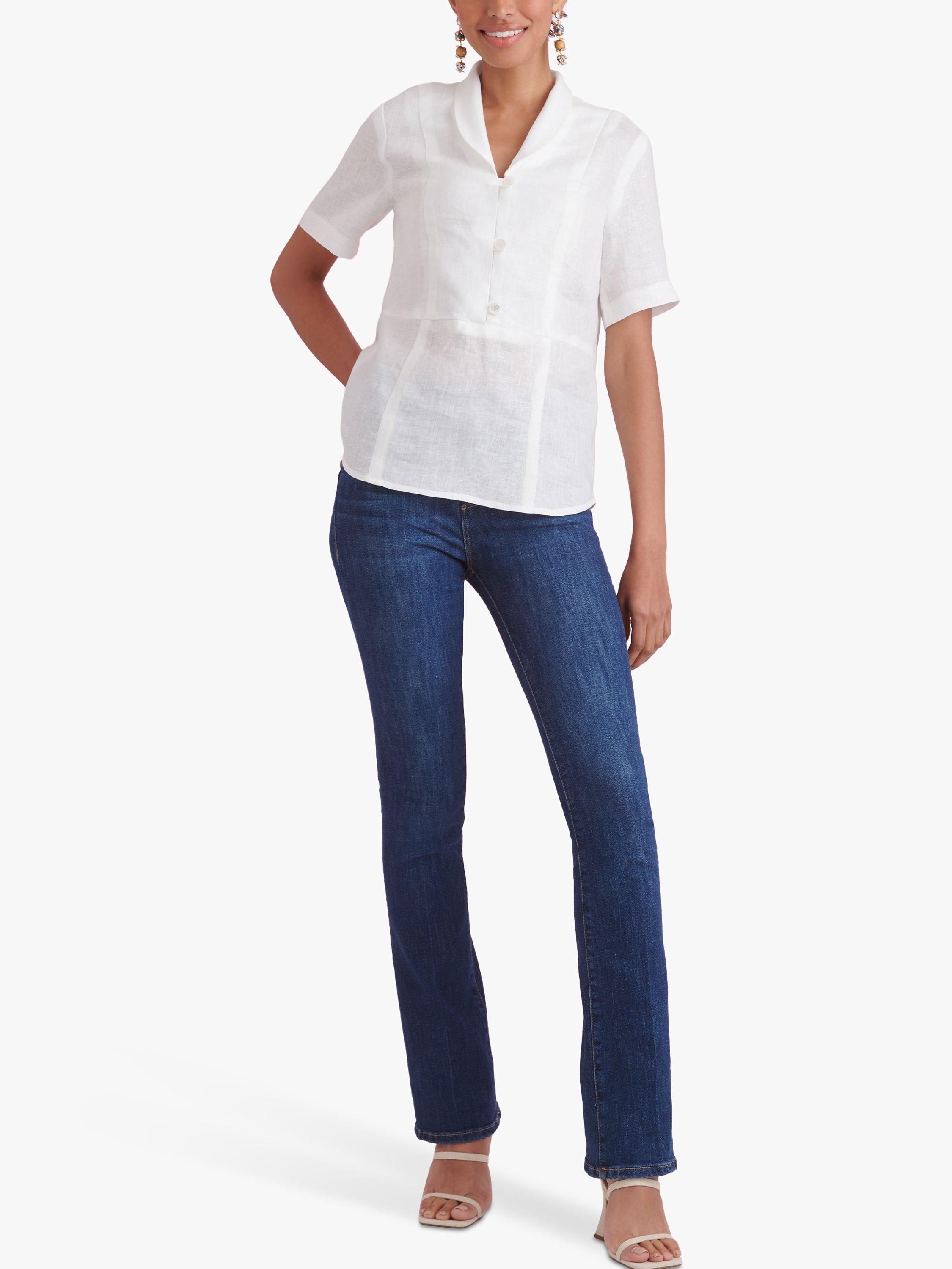 Raised waist tops with shawl collar have partial button front, two length options and sleeve variations. Top C has a released pleat on the sleeve.