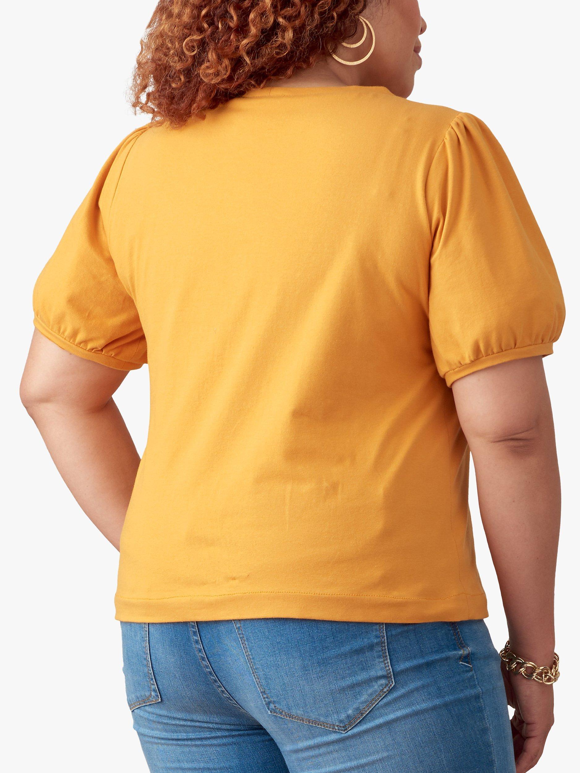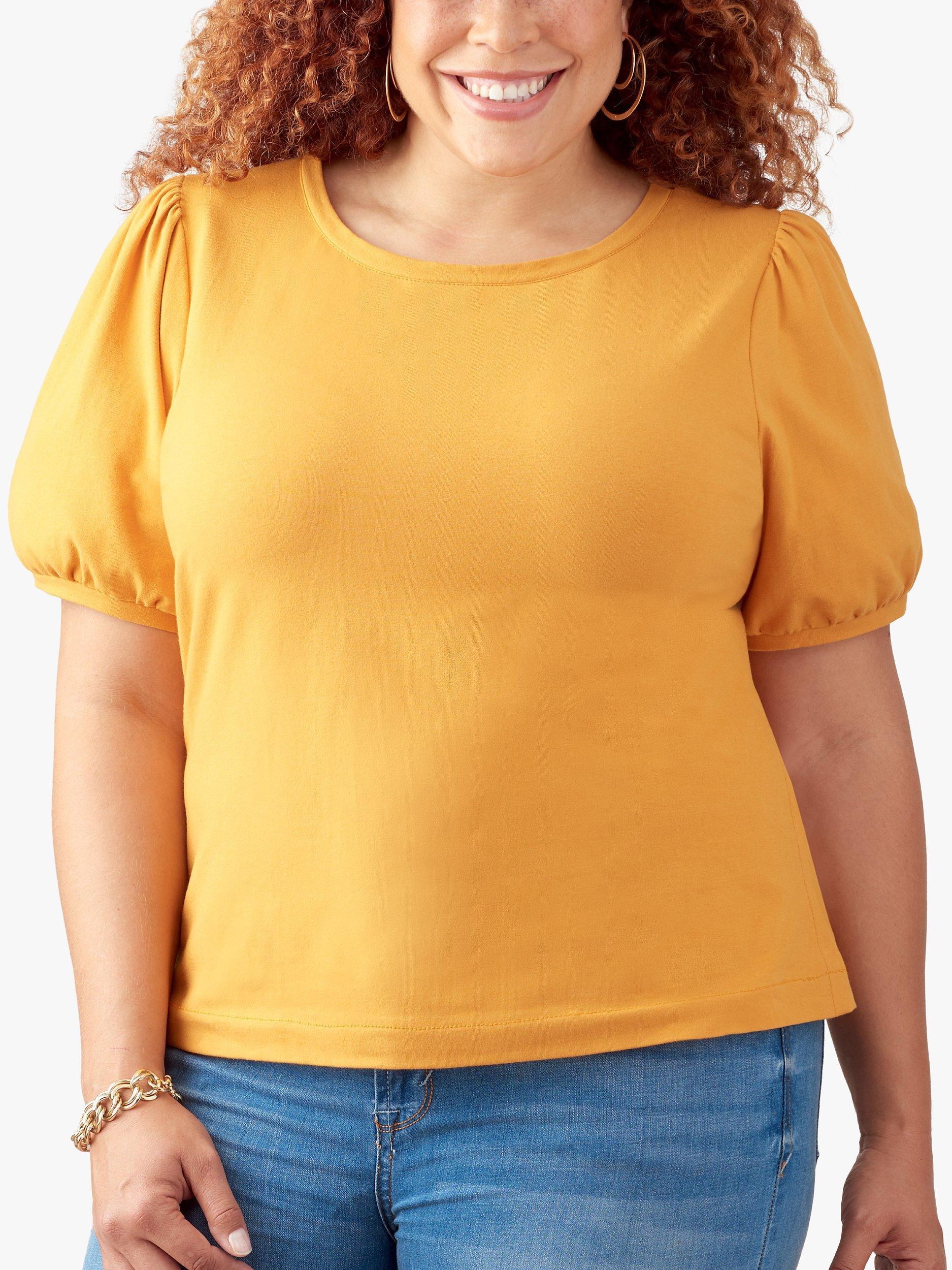 Knit tops with scoop neck and options for gathered, pleated and cap sleeves.