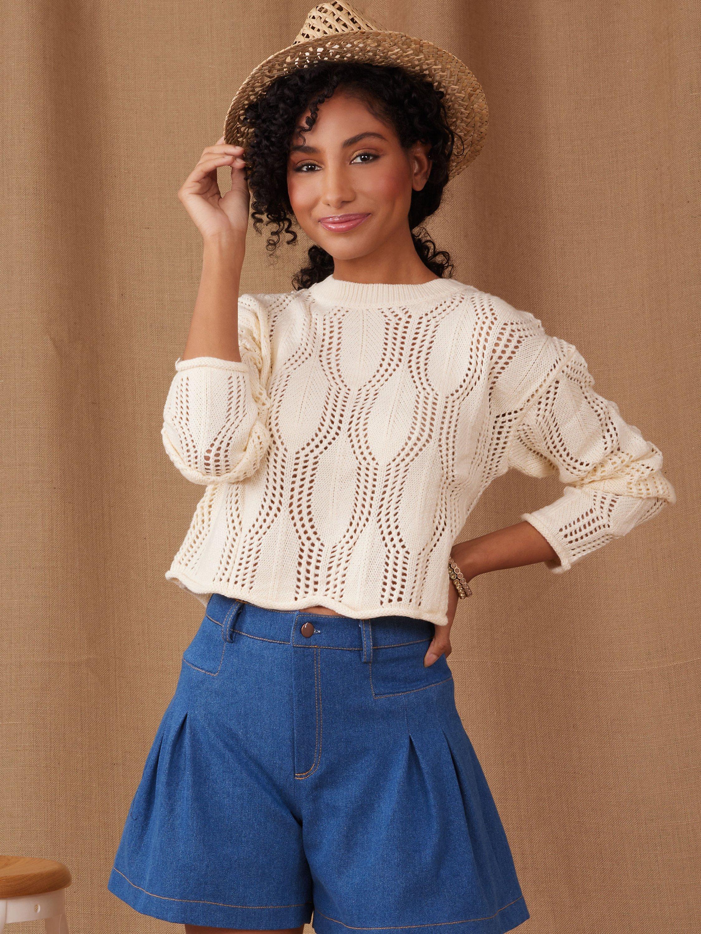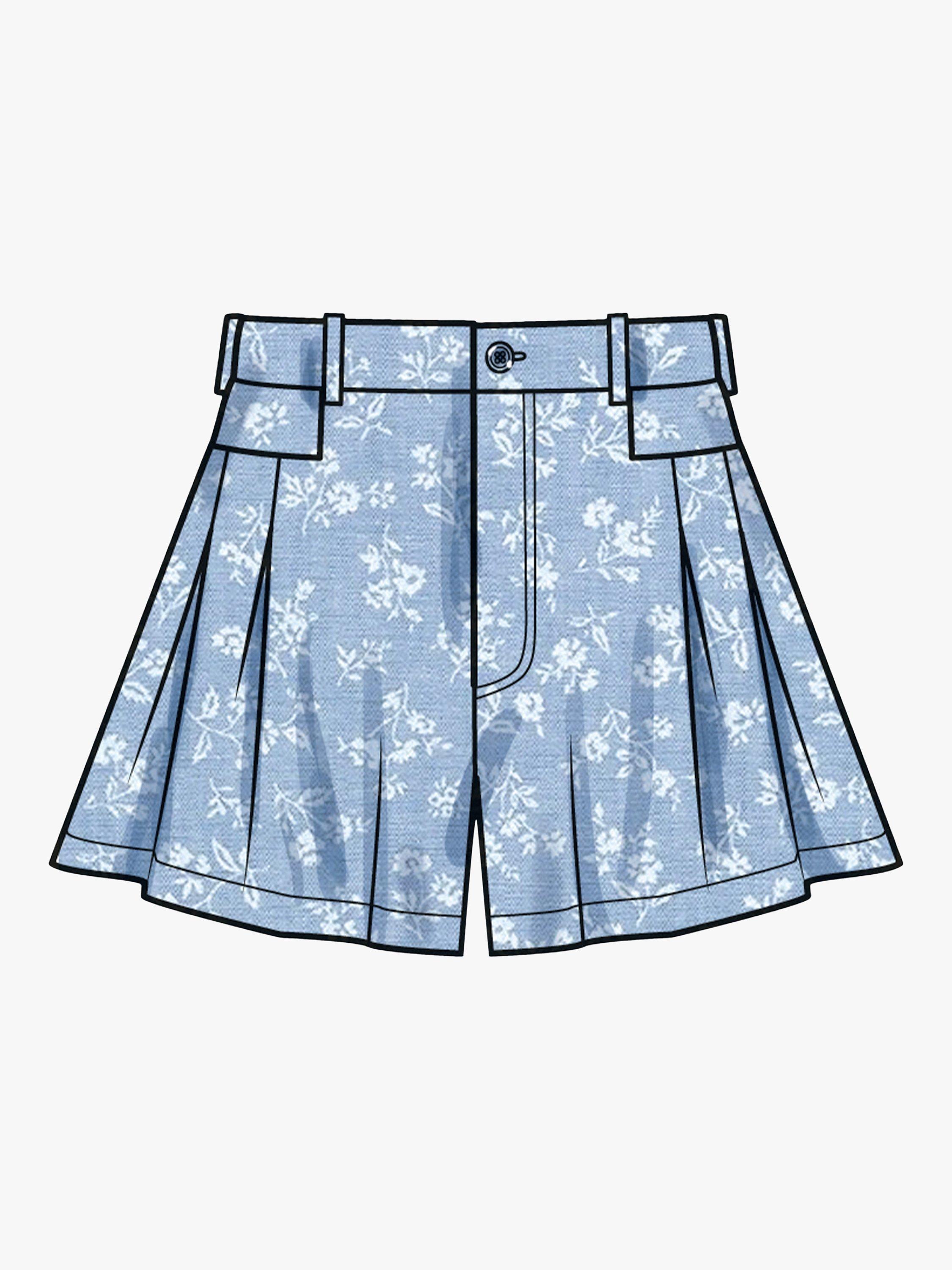Pleated shorts and pants have side seam pockets, front fly zip with button closure and wide leg.