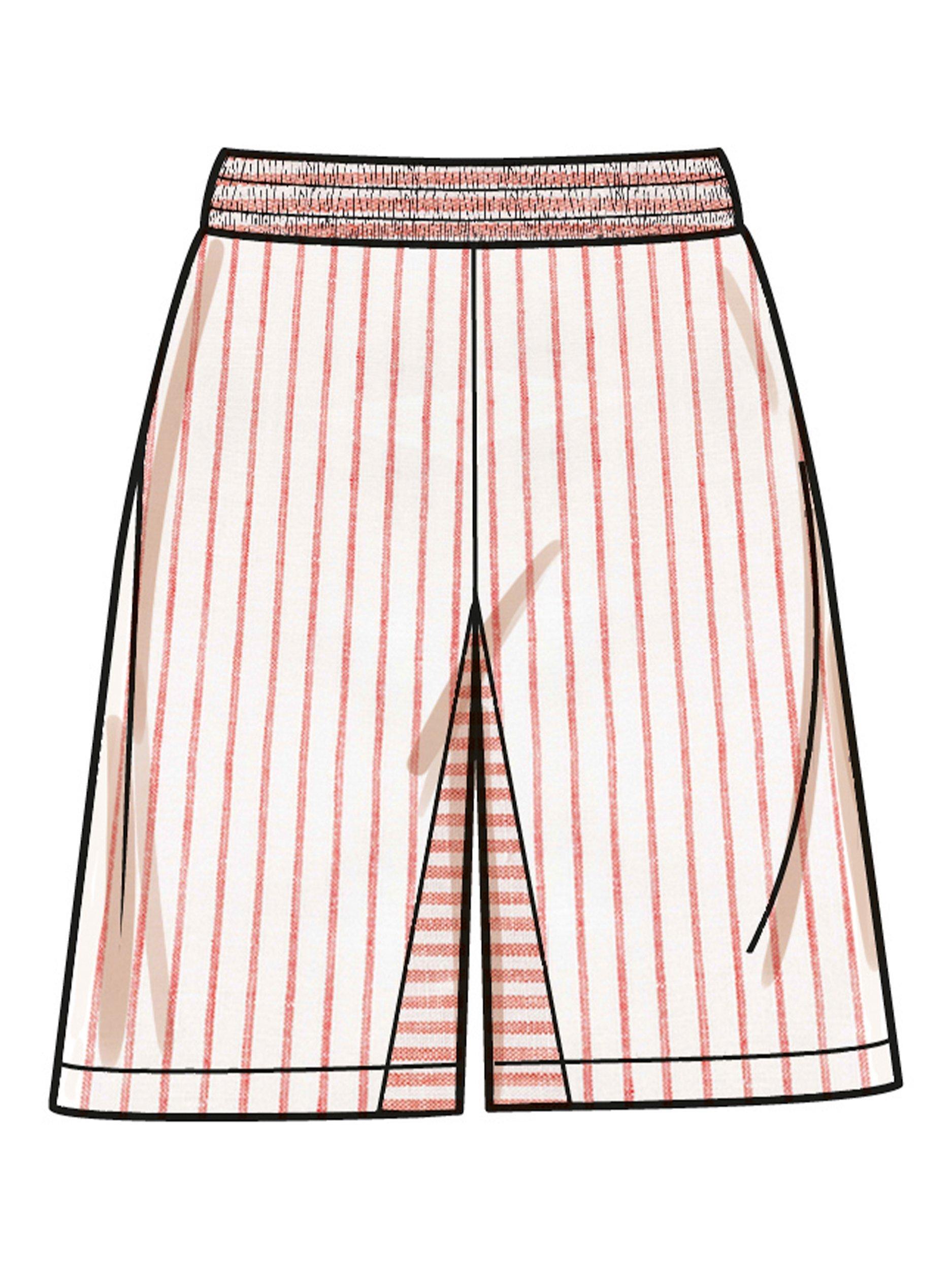 Pull-on elastic waist shorts and pants have wide leg, centre panels, and side seam pockets. Views B and C pants have ties at waist and large patch pockets at the sides. View C has contrast.