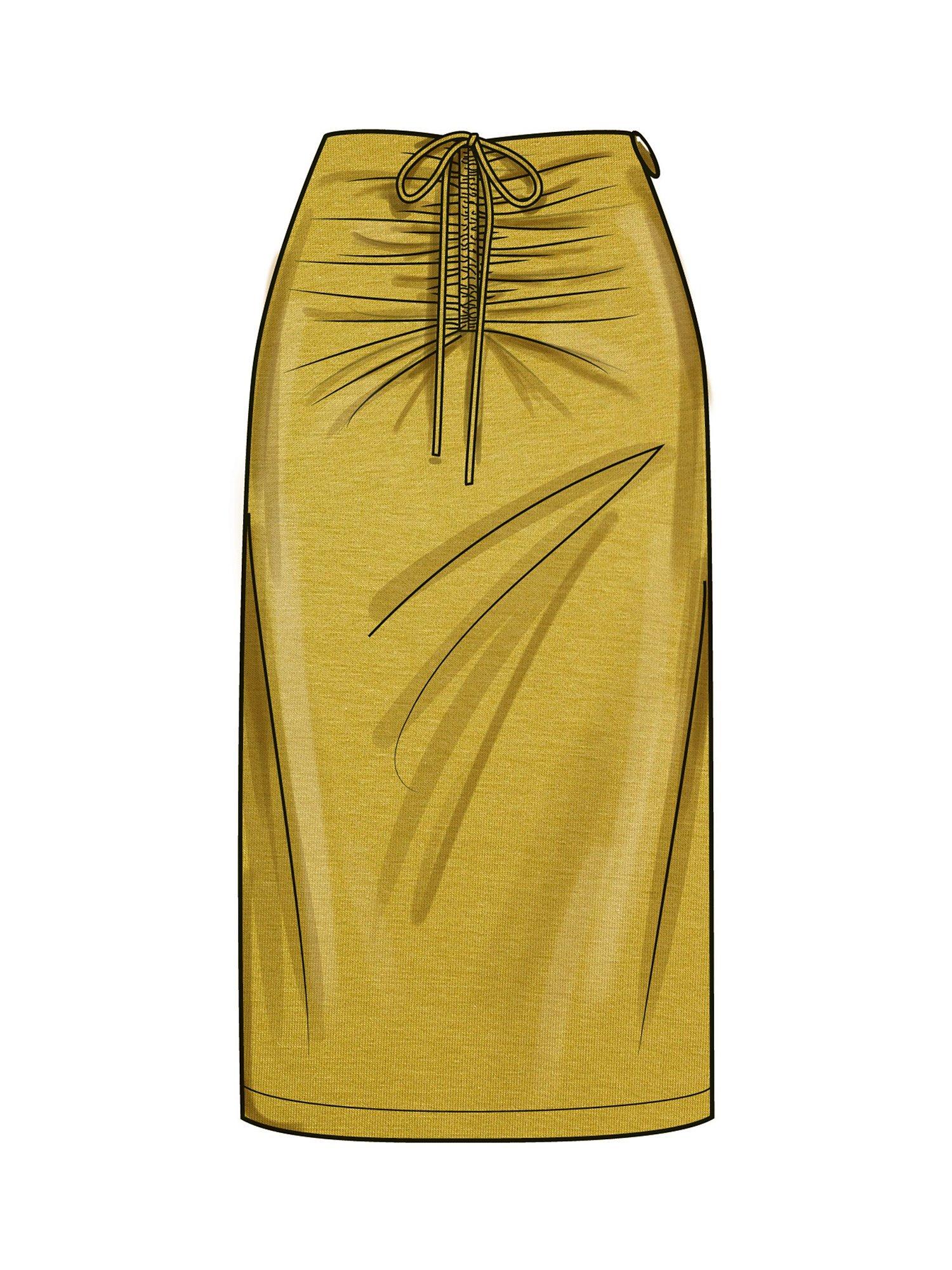 Easy-to-sew sleek knit midi or long-length skirts with side slit have a cinching drawstring tie that creates a ruching effect across the bodycon silhouette.
