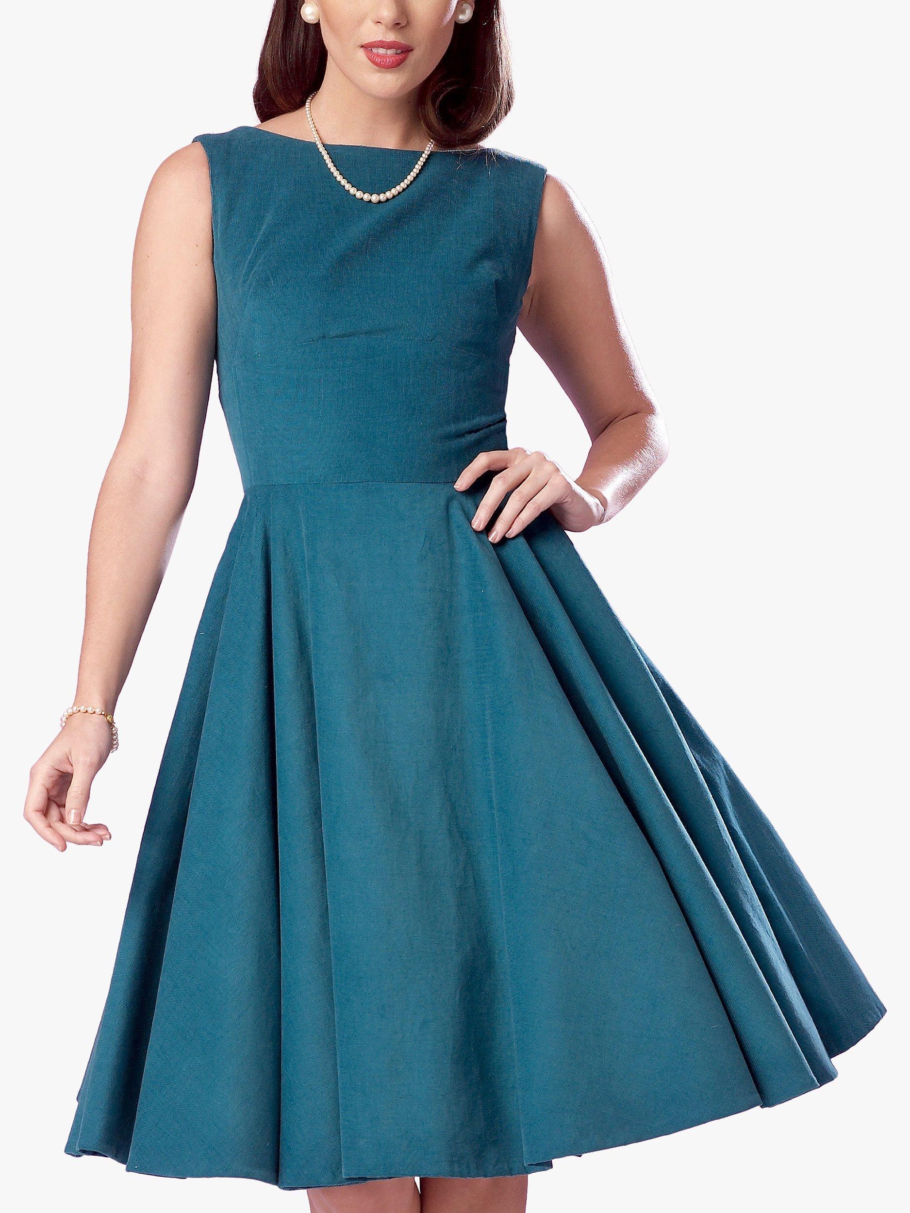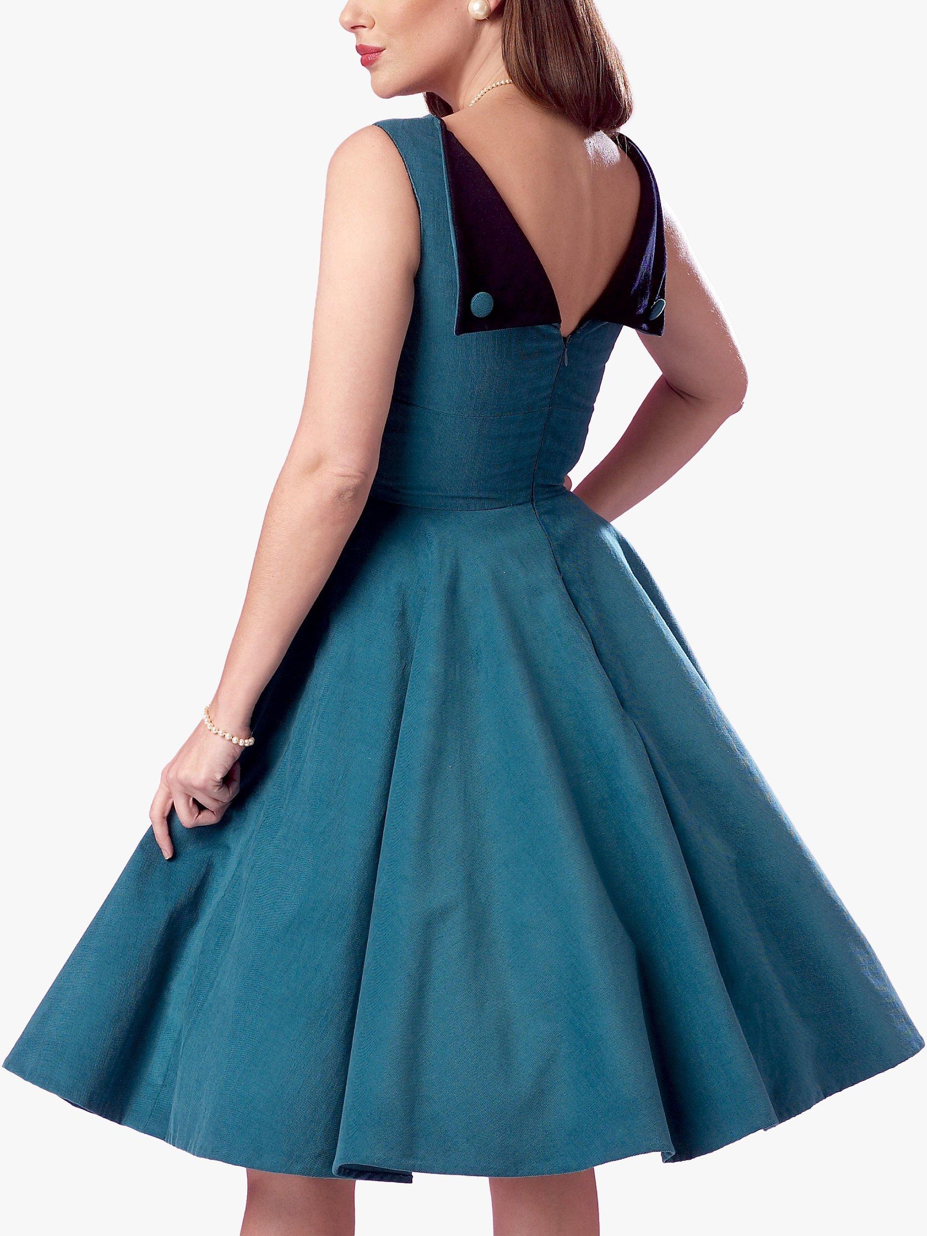 Sleeveless dress with close-fitting, lined bodice, wide waistband, bateau neckline and fold-back contrast facings. Flared skirt and petticoat, straight skirt.