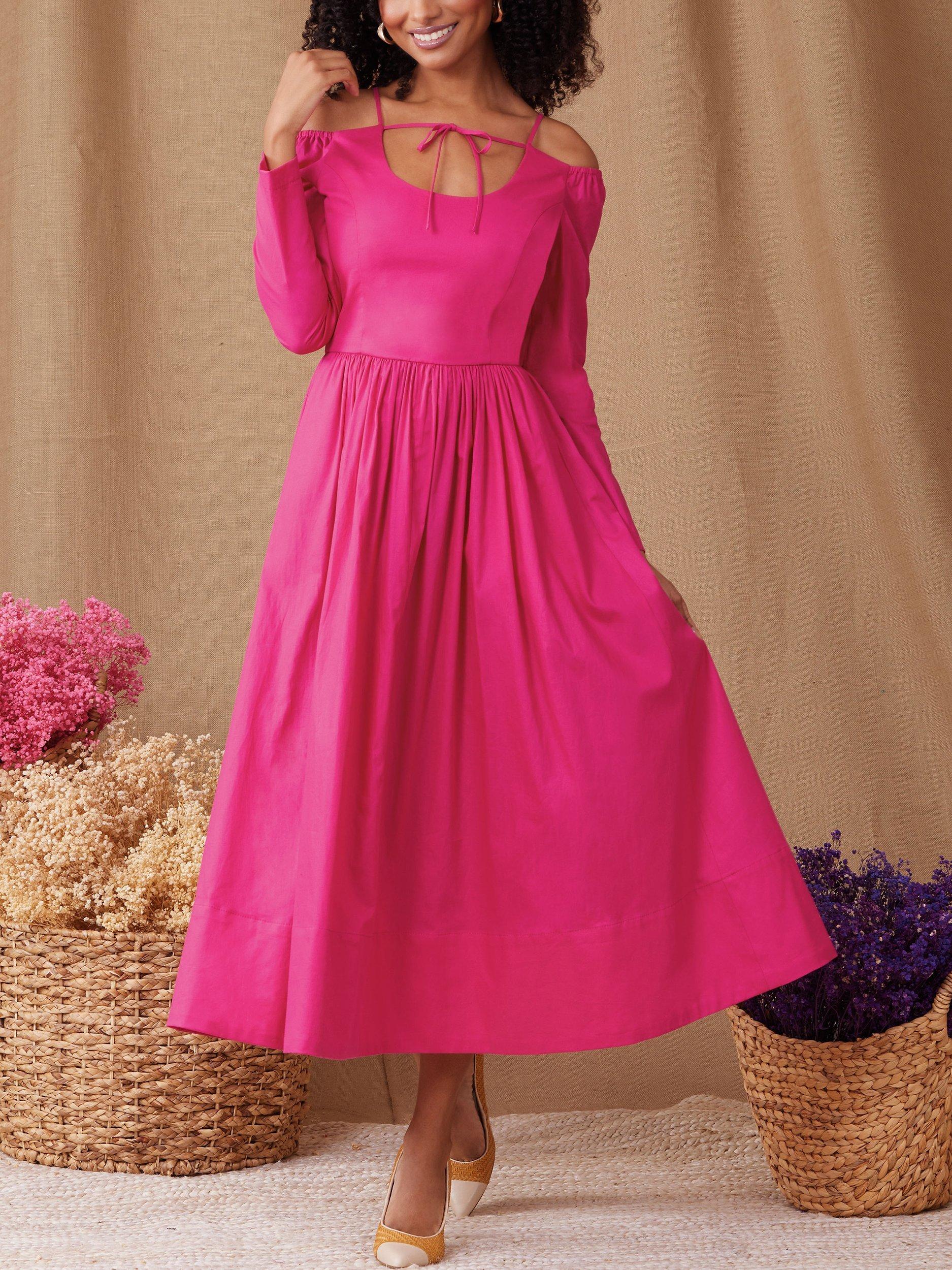 Spaghetti strap dresses have lined bodice with princess seams, gathered skirt, front and back ties, side seam pockets, and invisible back zip closure.