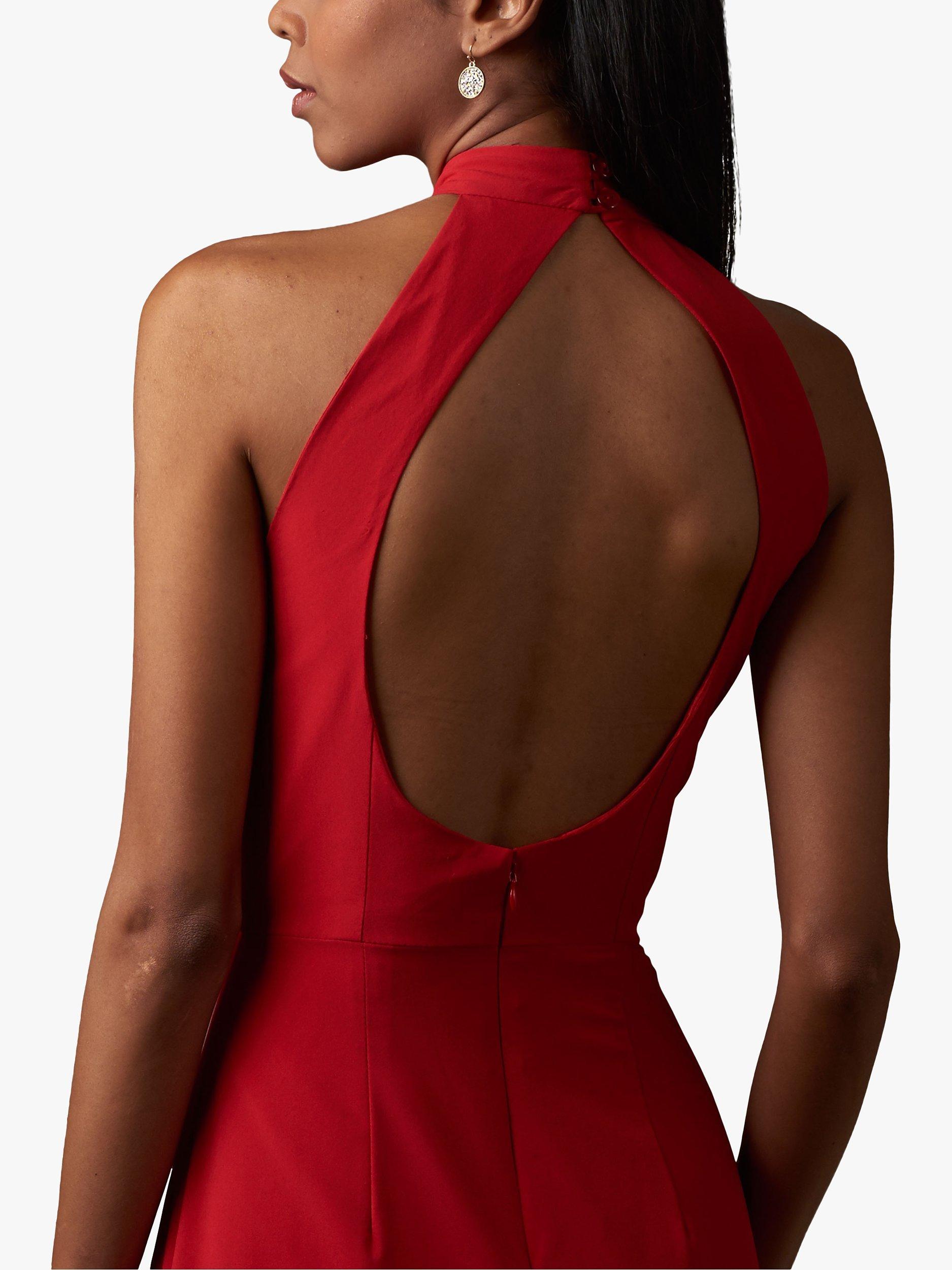 The sleeveless halter dresses can be made short, long with a leg slit or with a mermaid tail of tulle. Dresses feature an invisible zip and a button and loop closure on the neck band.