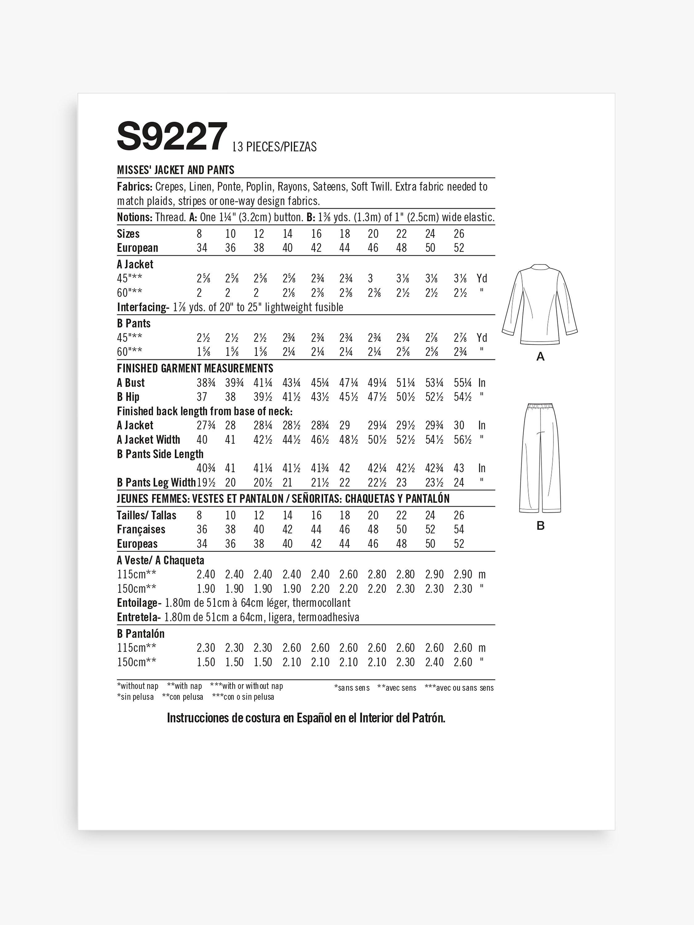 SimplicityMisses' Unlined Jacket & Trousers Sewing Pattern S9227